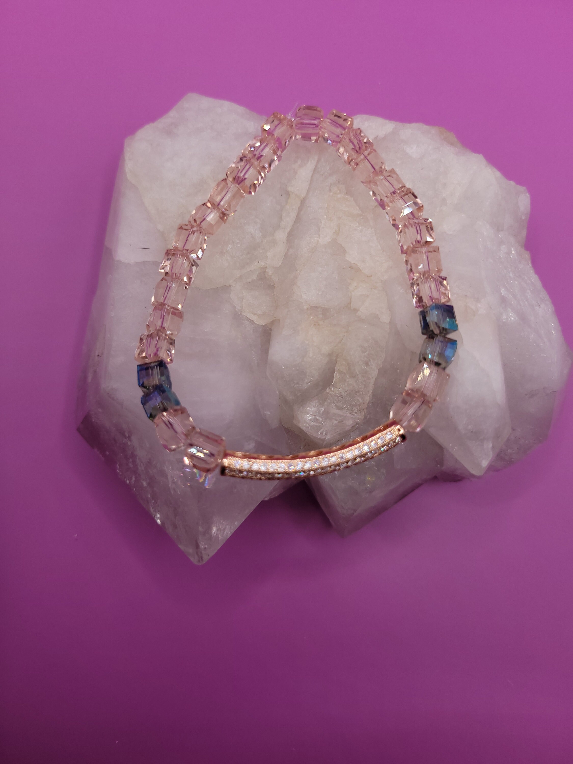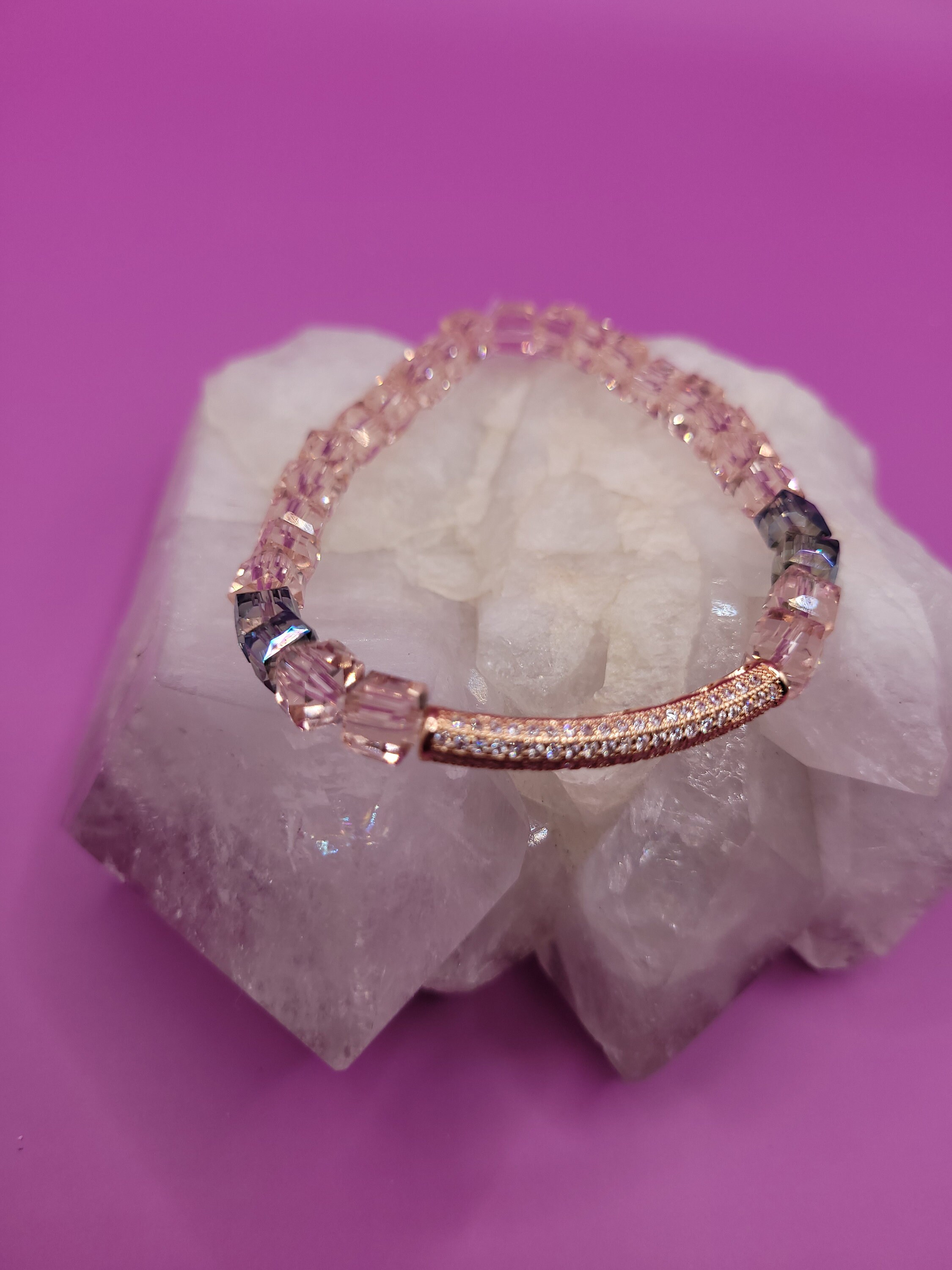 Energetically WARMING pink crystal cube beads with 14k rose gold rhinestone noodle centerpiece bead bracelet.