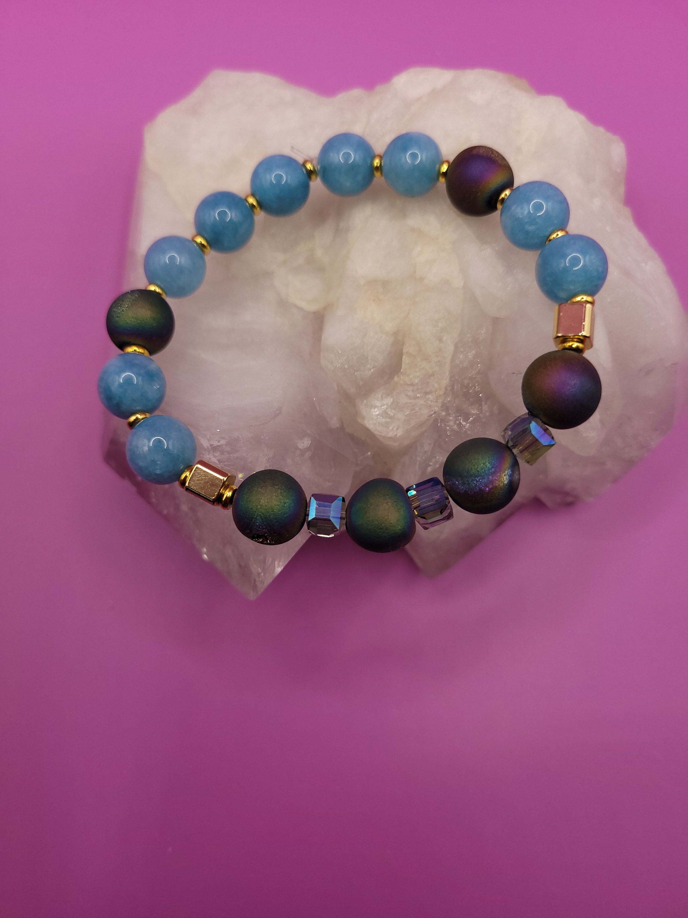 Energetically UPLIFTING bracelet created with irridescent druzy stone and glass cube beads, accented with blue Chalcedony beads.