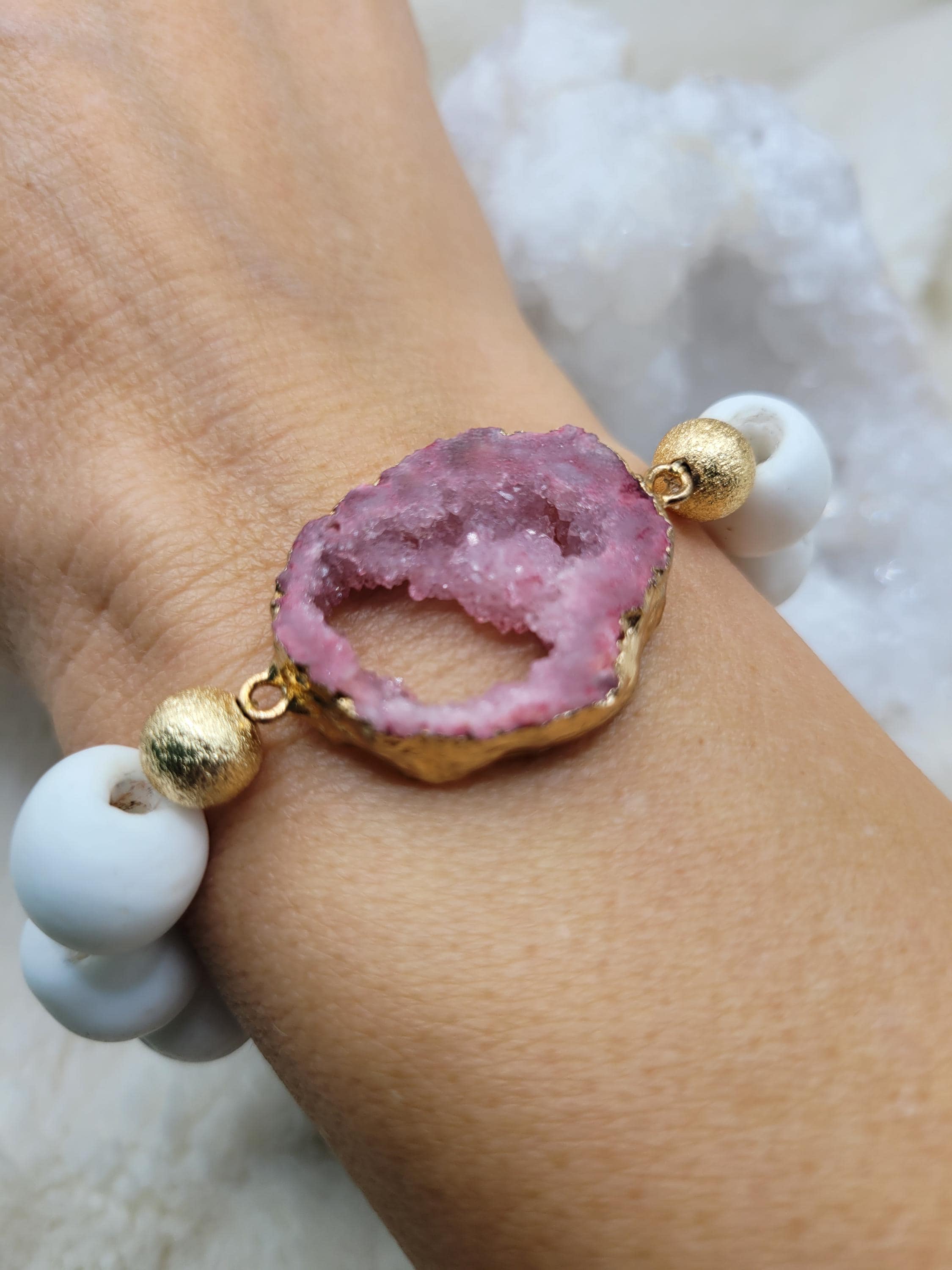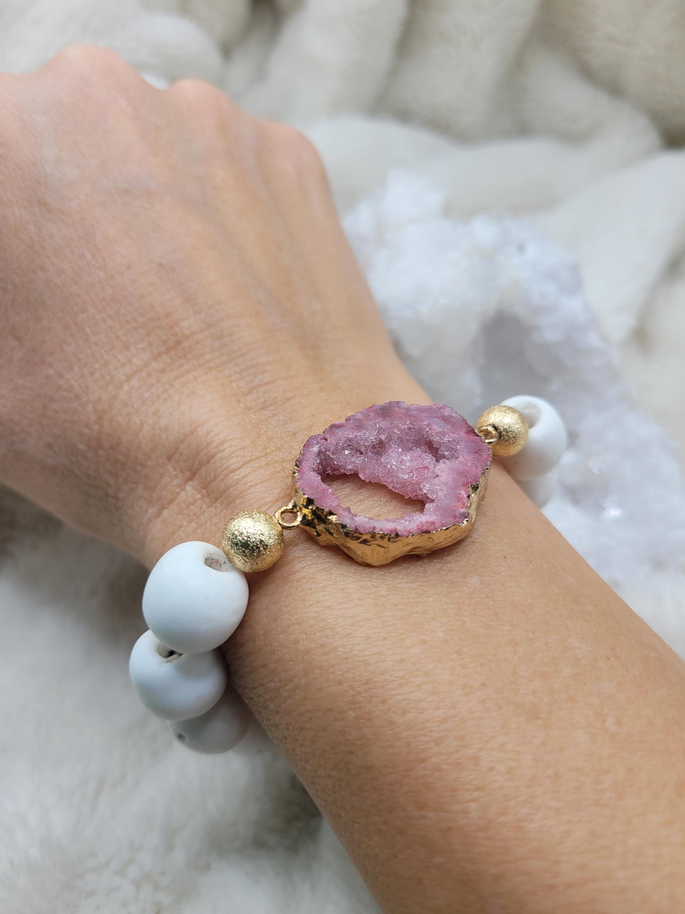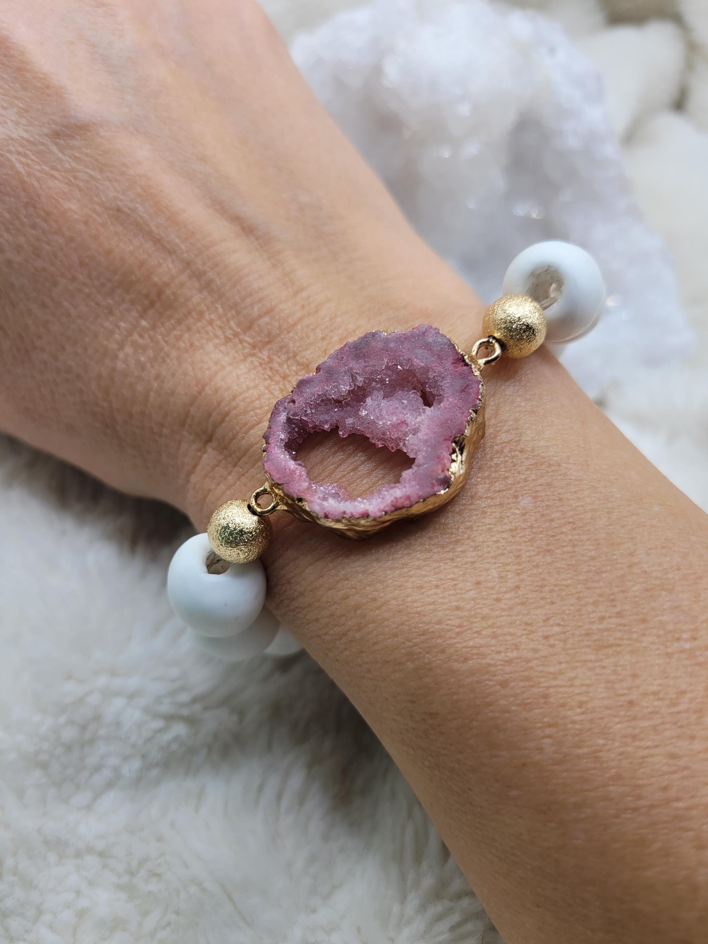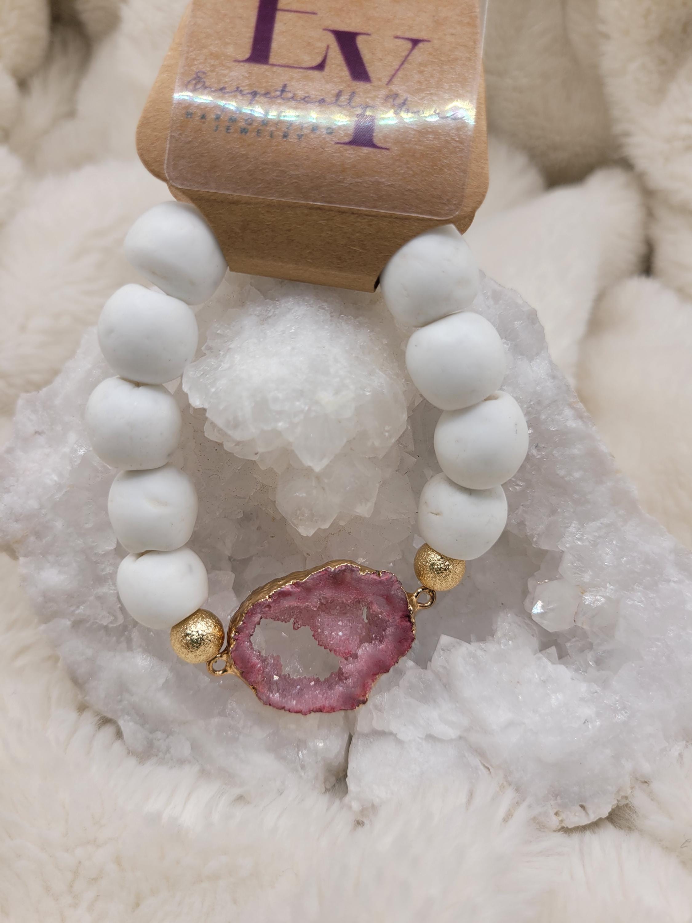 Energetically ELEVATING druzy quartz focal slab bead adorned with 14 mm white sandcast beads stretch stacking bracelet