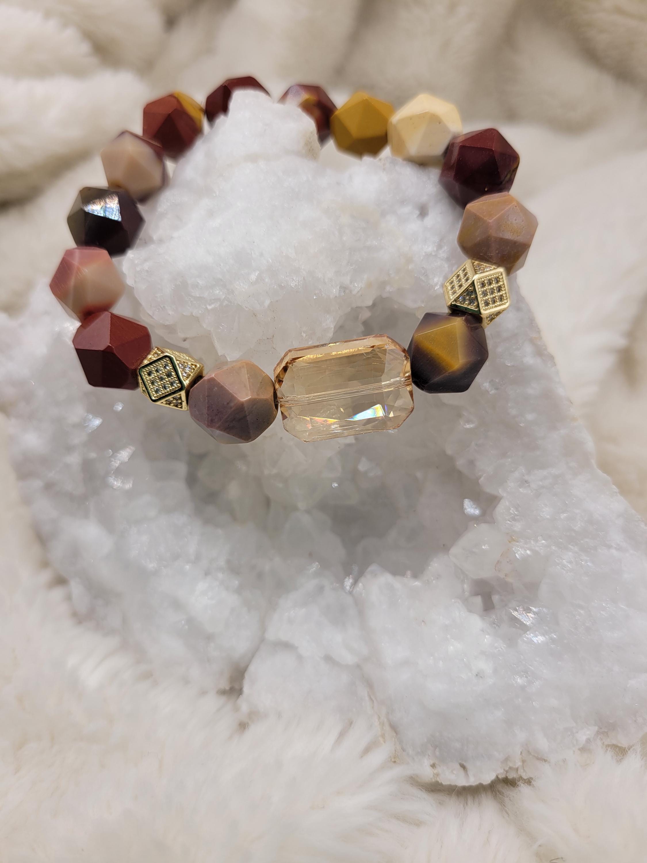 Energetically REGENERATING unique diamond cut natural mookaite beads complimenting faceted champagne crystal focal bead stretch stacking bracelet