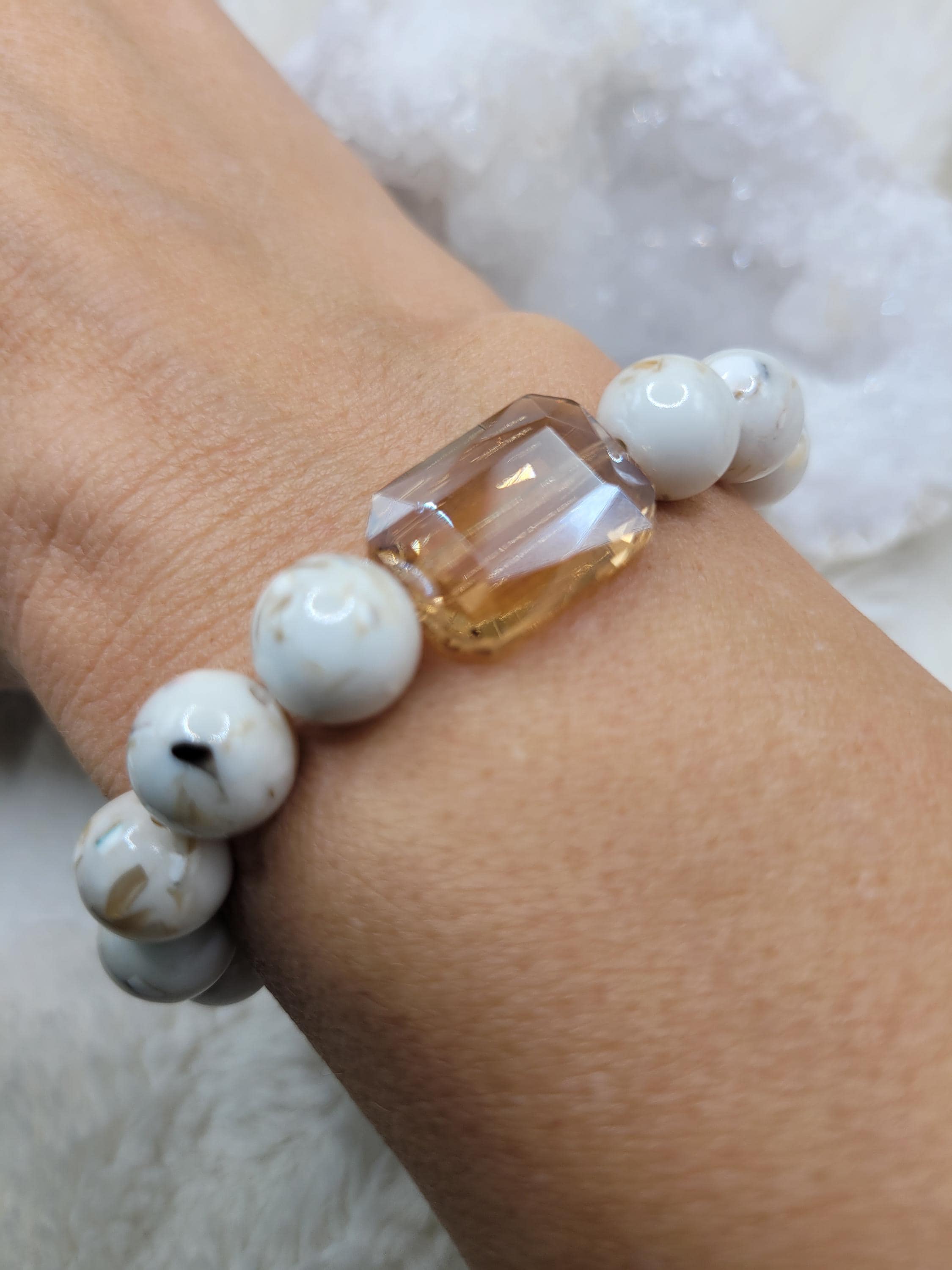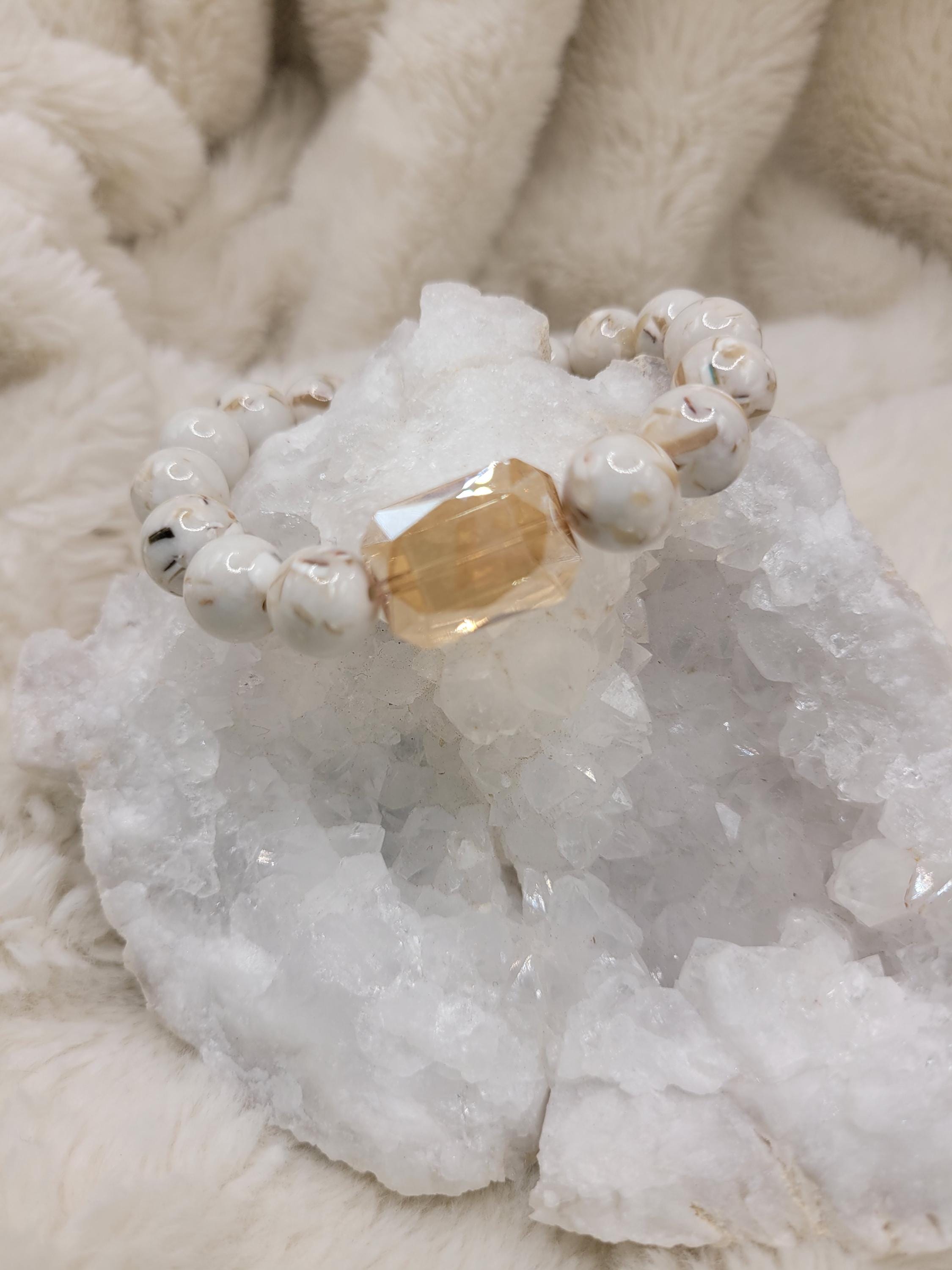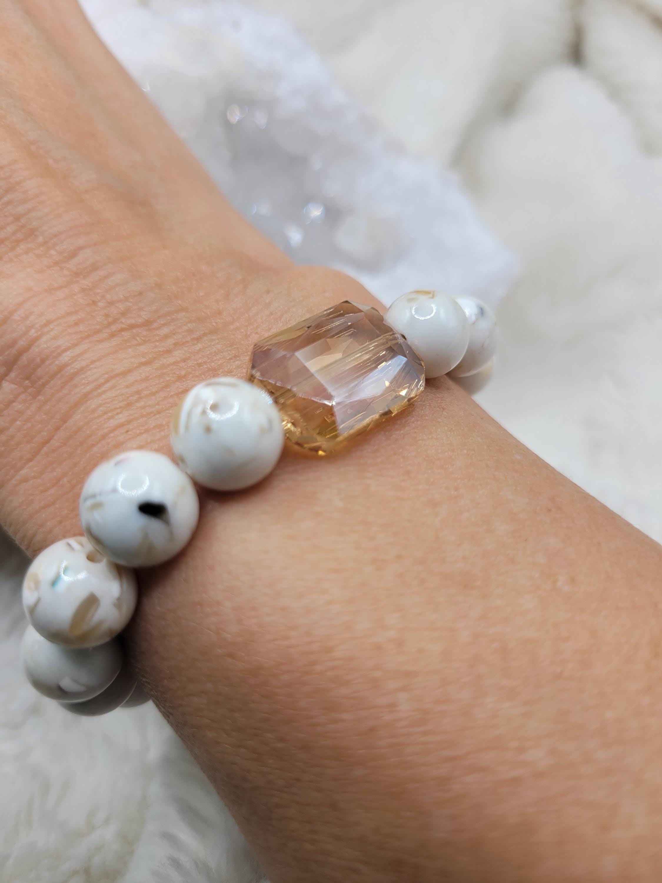 Energetically PURIFYING white shell turquoise beads with champagne faceted crystal focal bead stretch stacking bracelet