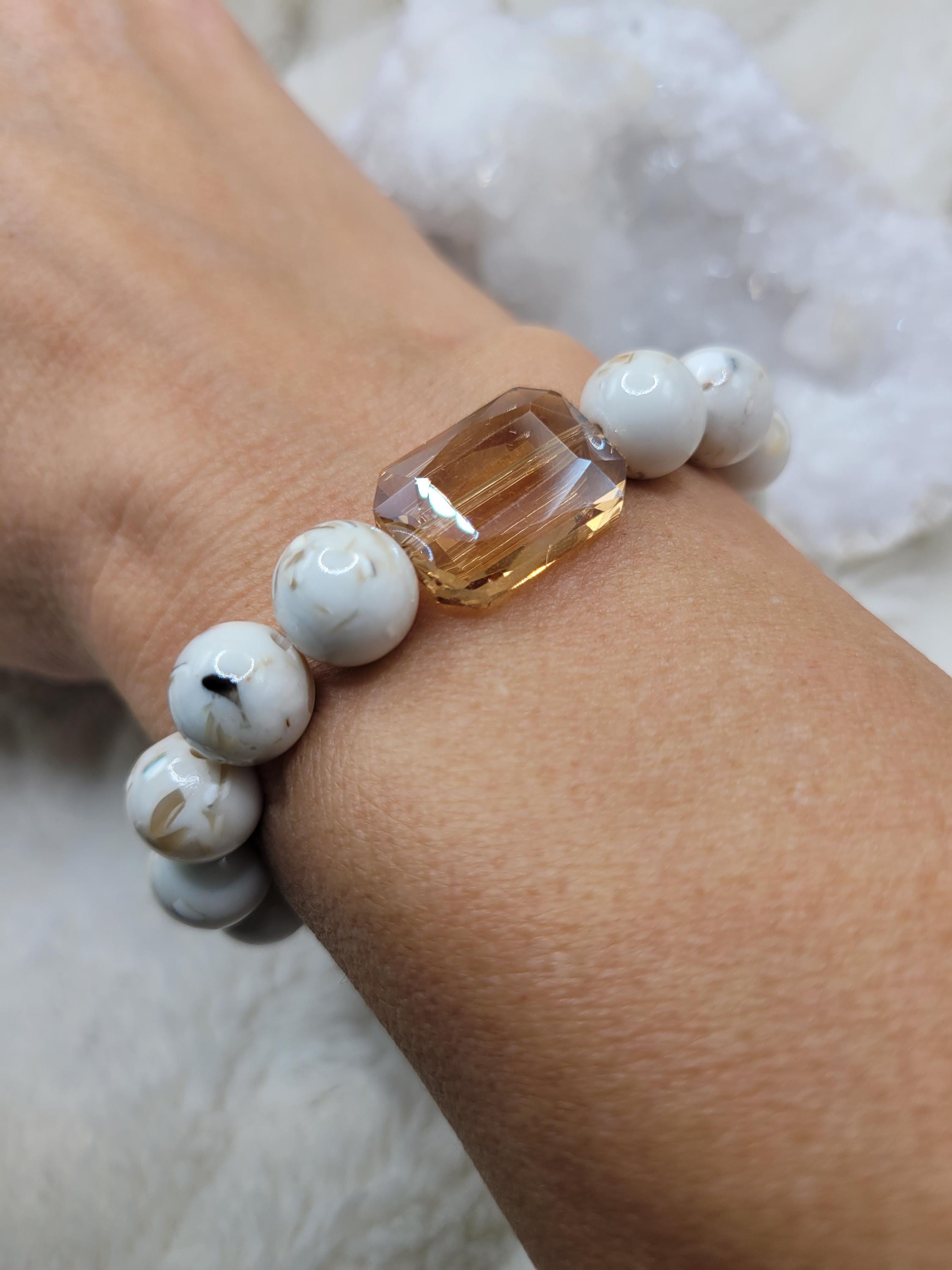 Energetically PURIFYING bracelet designed with natural 10 mm white shell turquoise beads complimenting champagne rectangle faceted crystal focal bead.