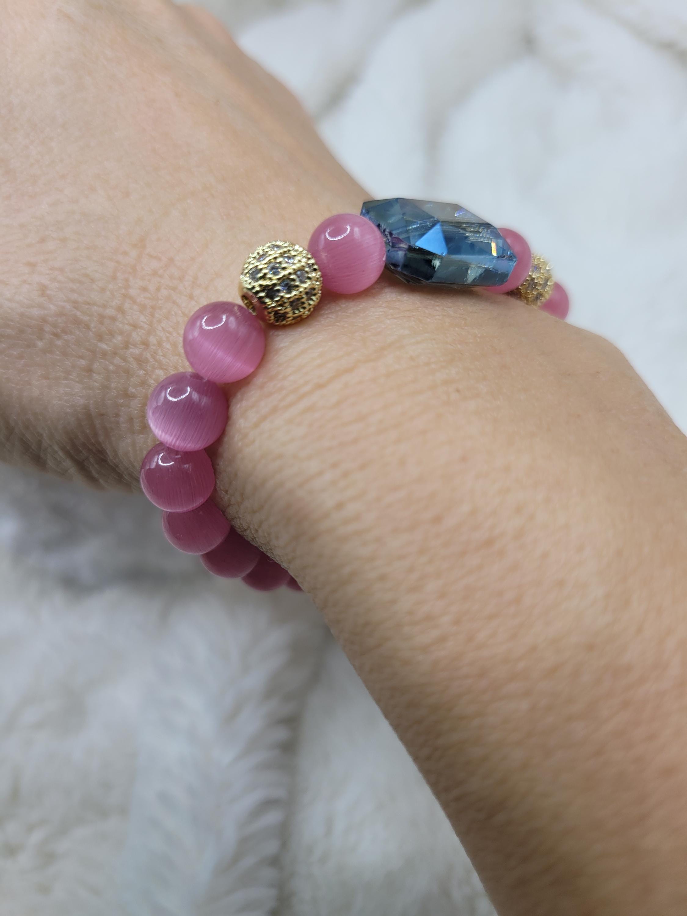 Energetically TRANSFORMING bracelet designed with natural 6 mm pink cat's eye beads complimenting blue rectangle faceted crystal focal bead.