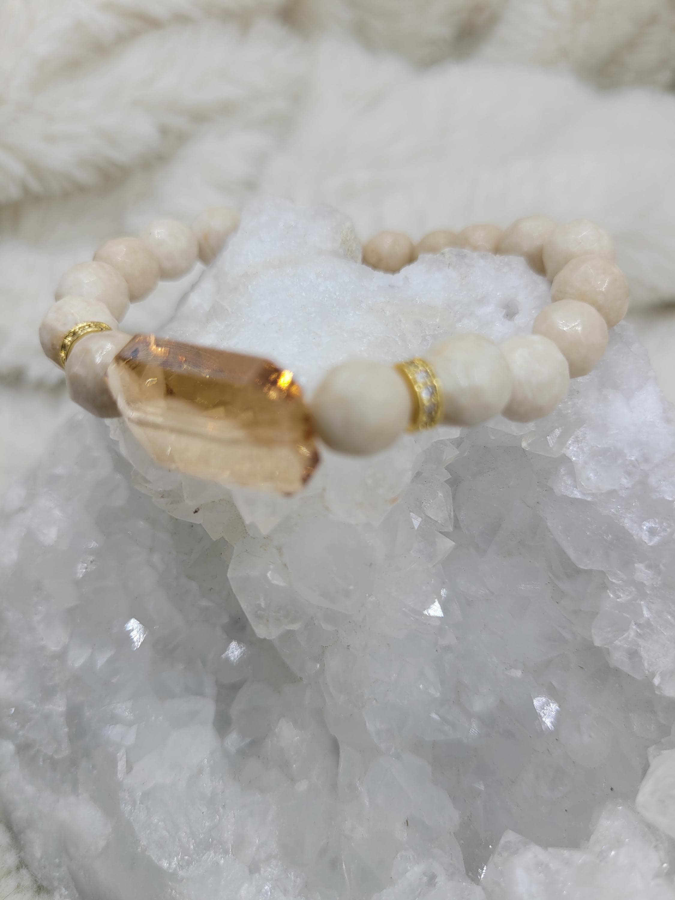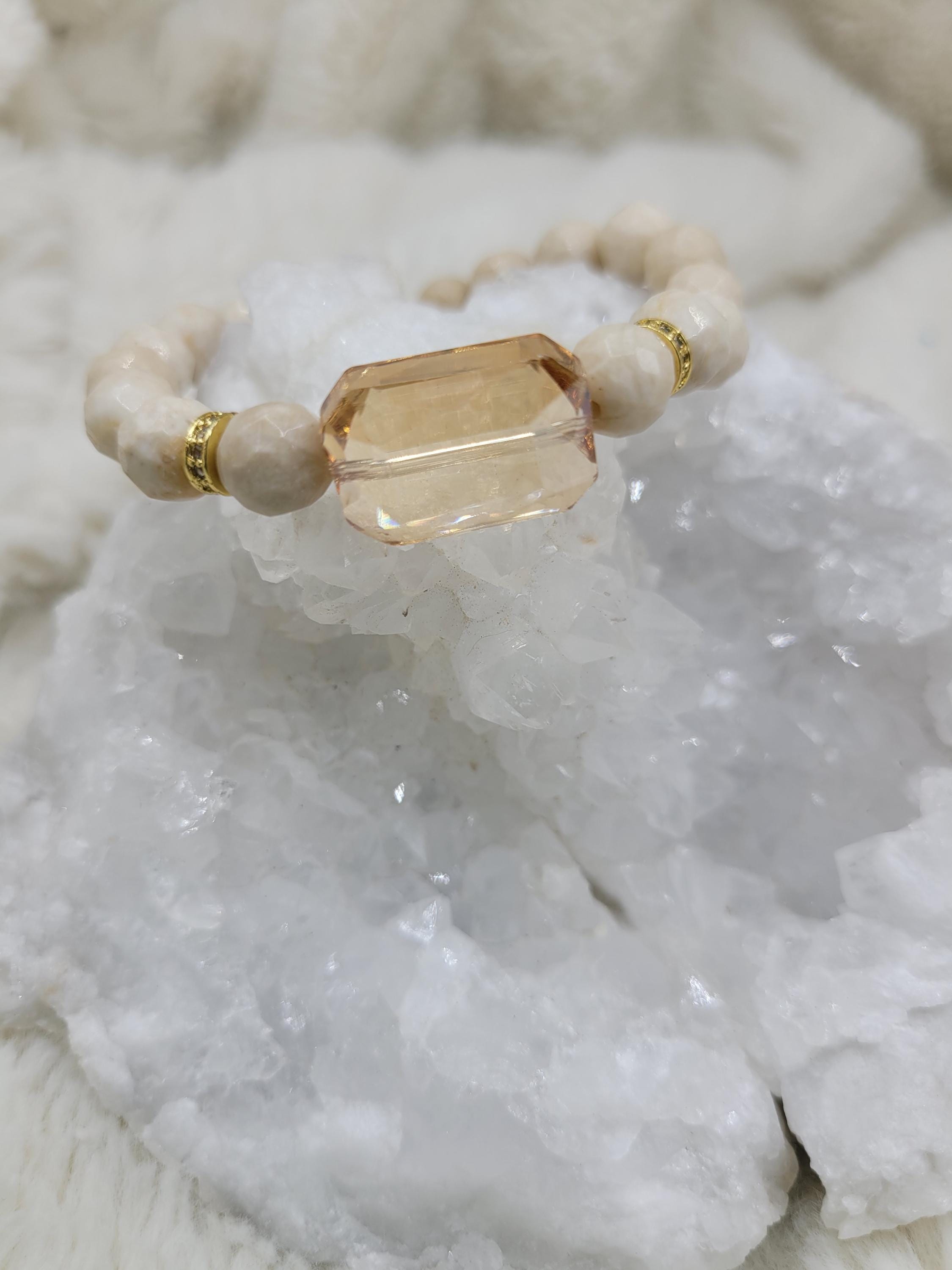 Energetically CALMING bracelet designed with natural 8 mm faceted howlite beads complimenting chsmpagne rectangle faceted crystal focal bead.