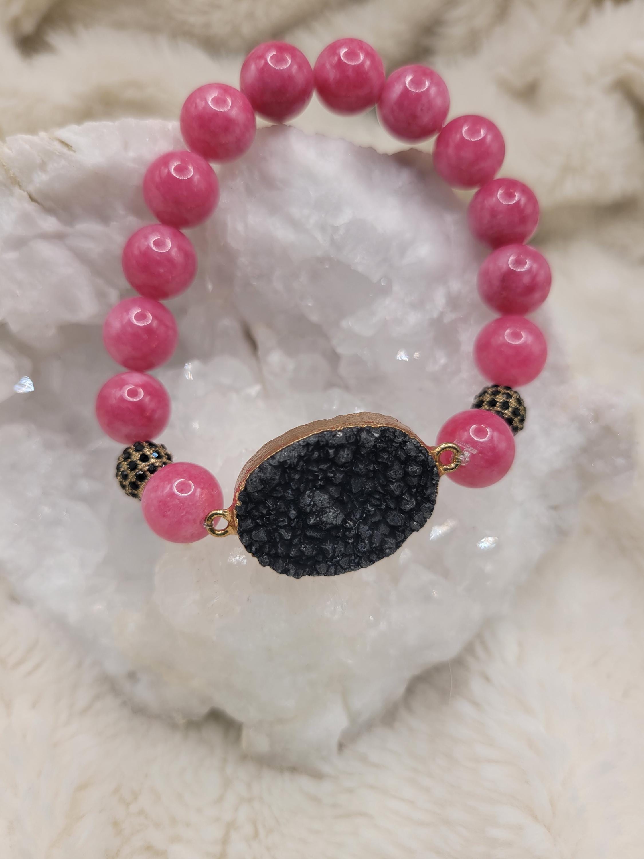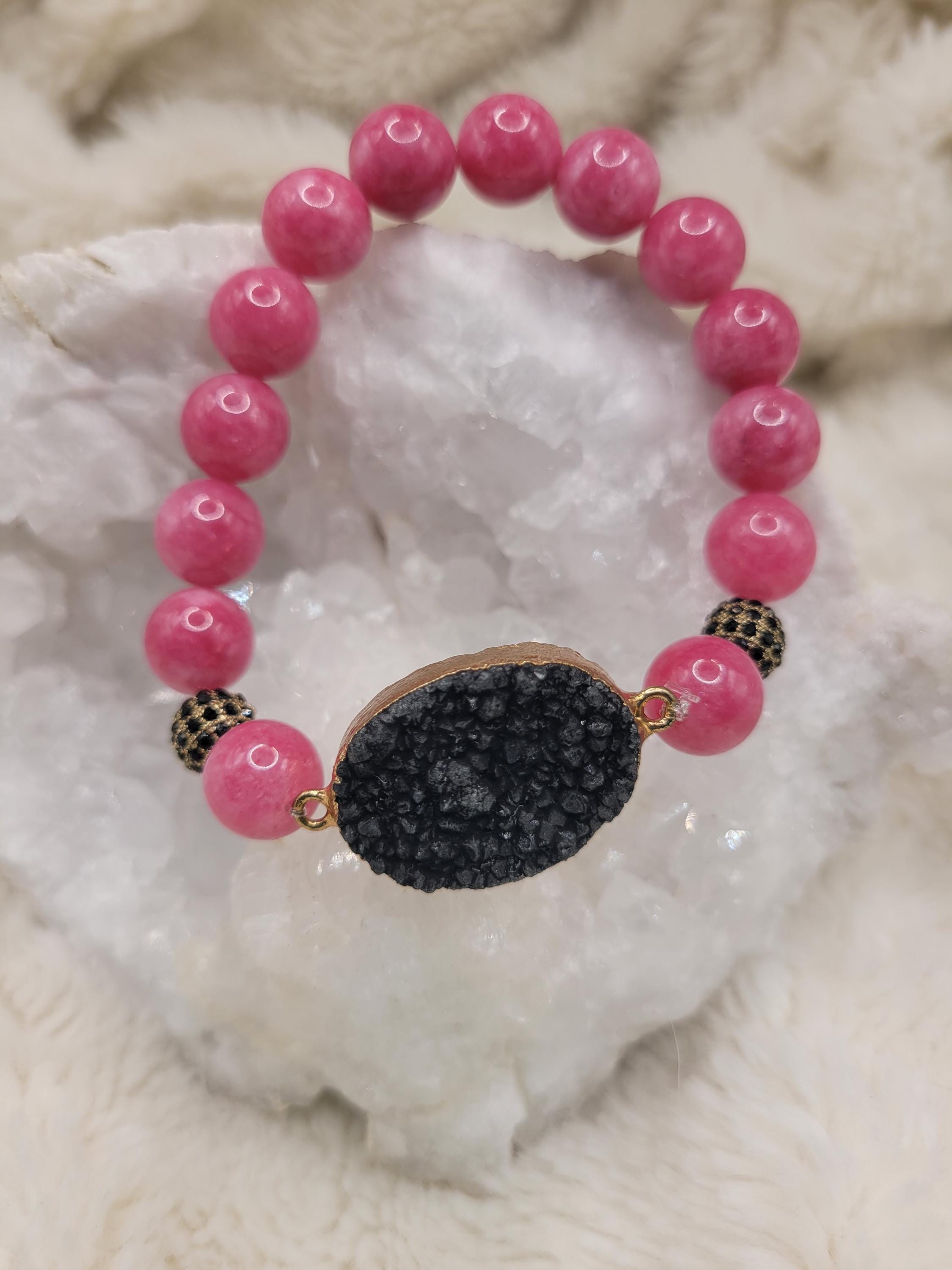 Energetically LOVING pink jade beads complimenting gold plated druzy black agate focalpiece stretch stacking bracelet