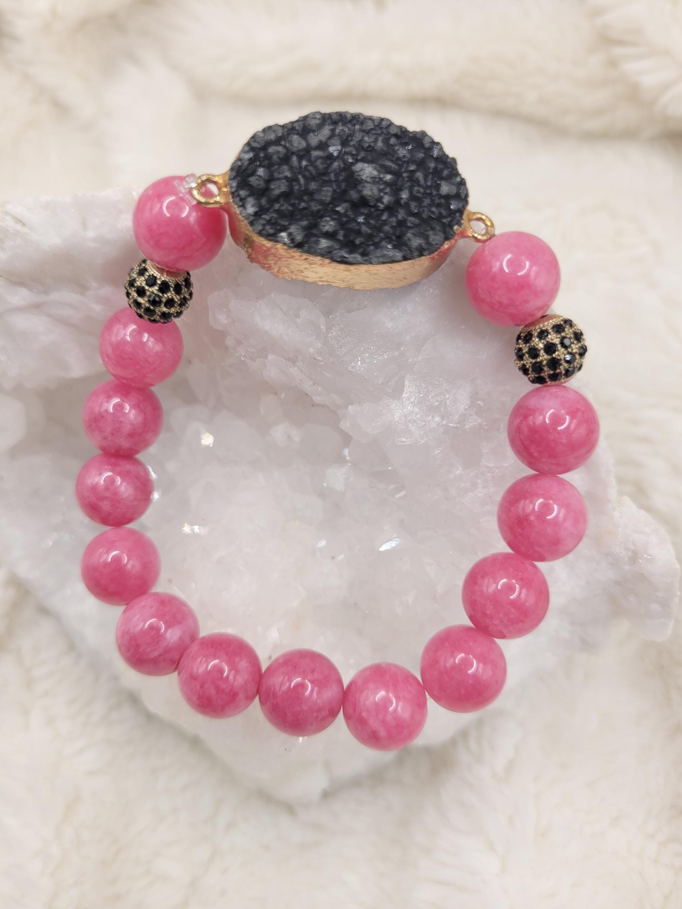 Energetically LOVING bracelet designed with natural 10 mm pink jade beads complimenting gold plated black druzy agate focalpiece