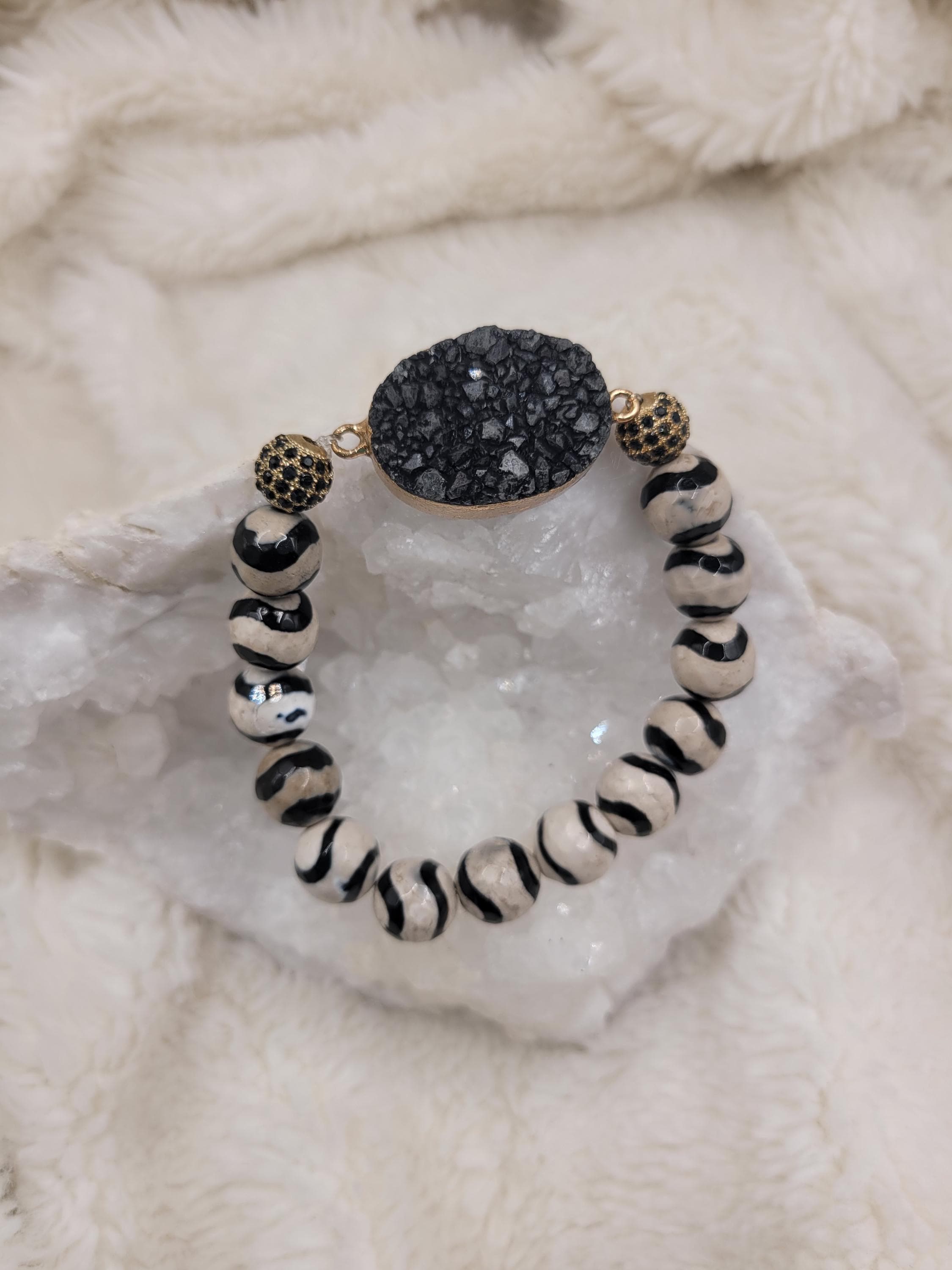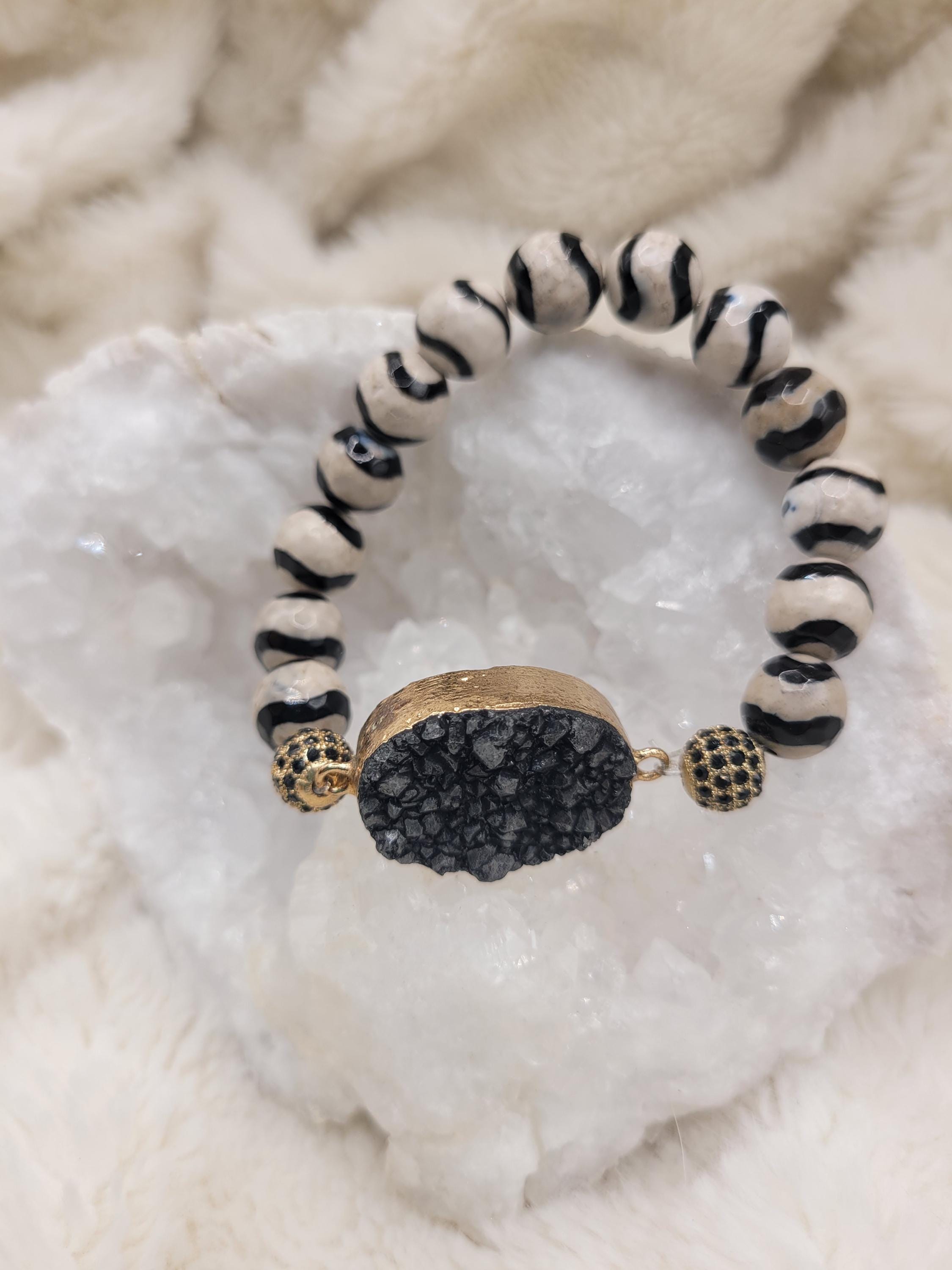 Energetically GROUNDING faceted agate beads complimenting gold plated druzy black agate focalpiece stretch stacking bracelet
