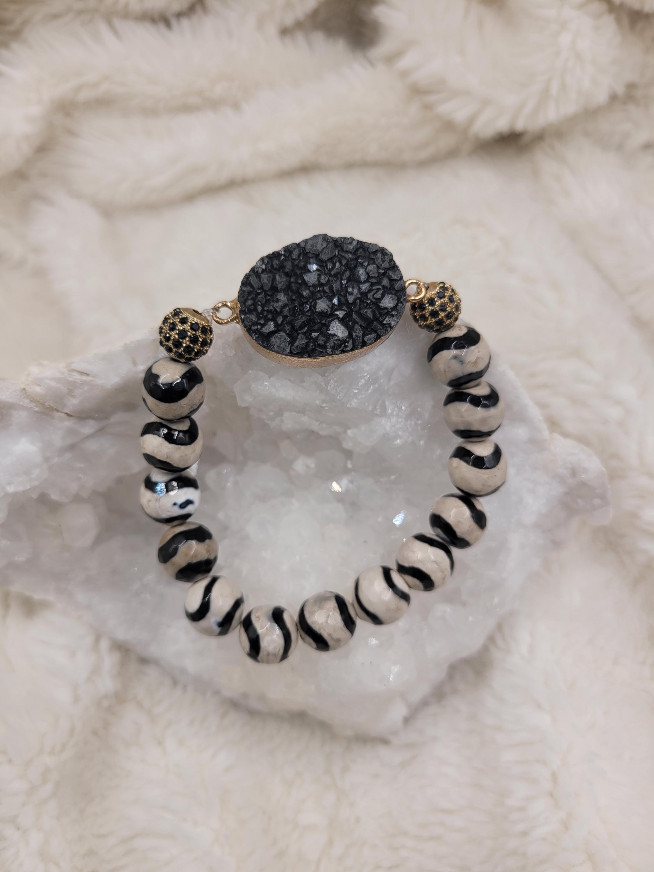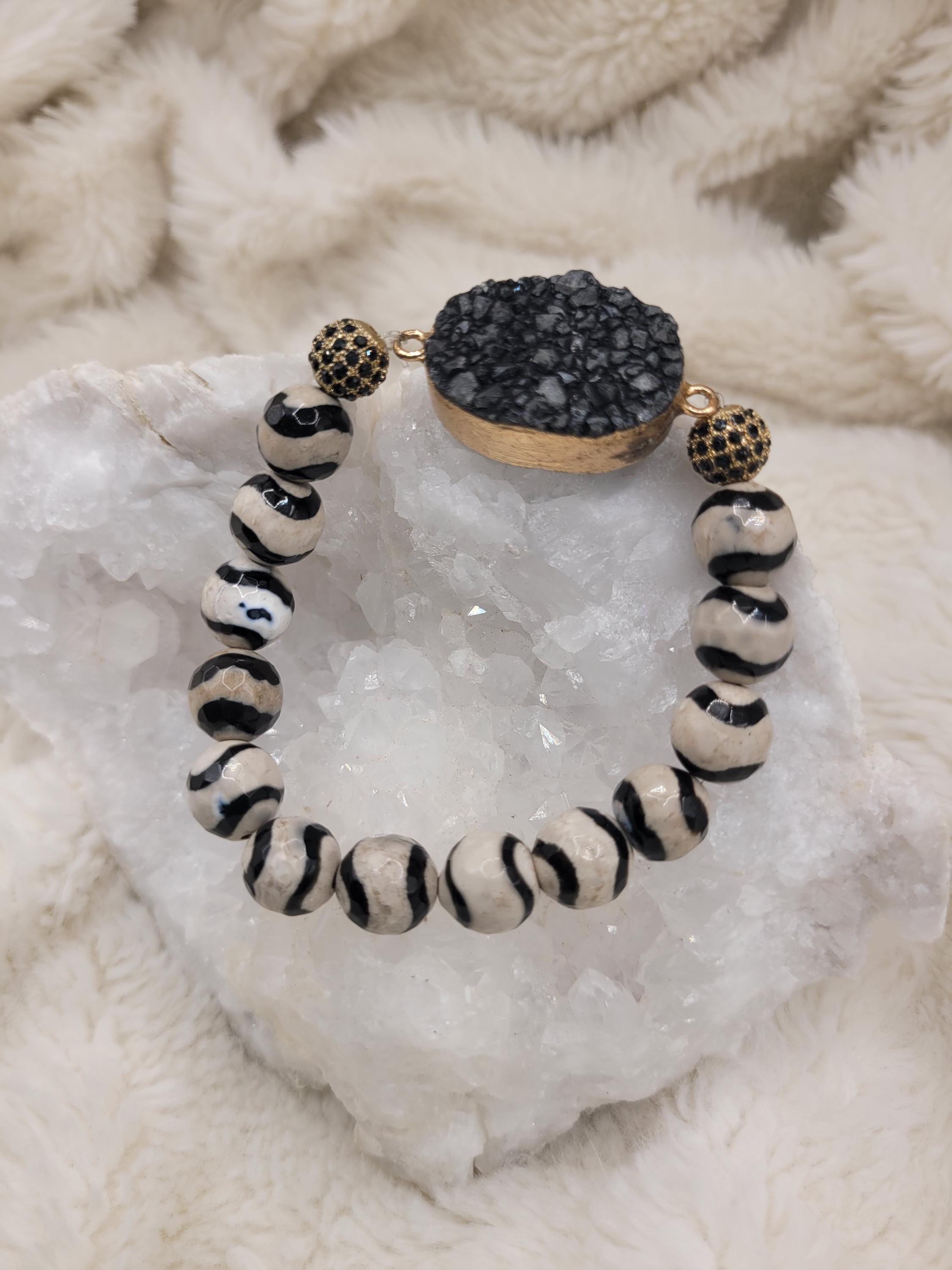 Energetically GROUNDING bracelet designed with natural 10 mm faceted agate beads complimenting gold plated black druzy agate focalpiece