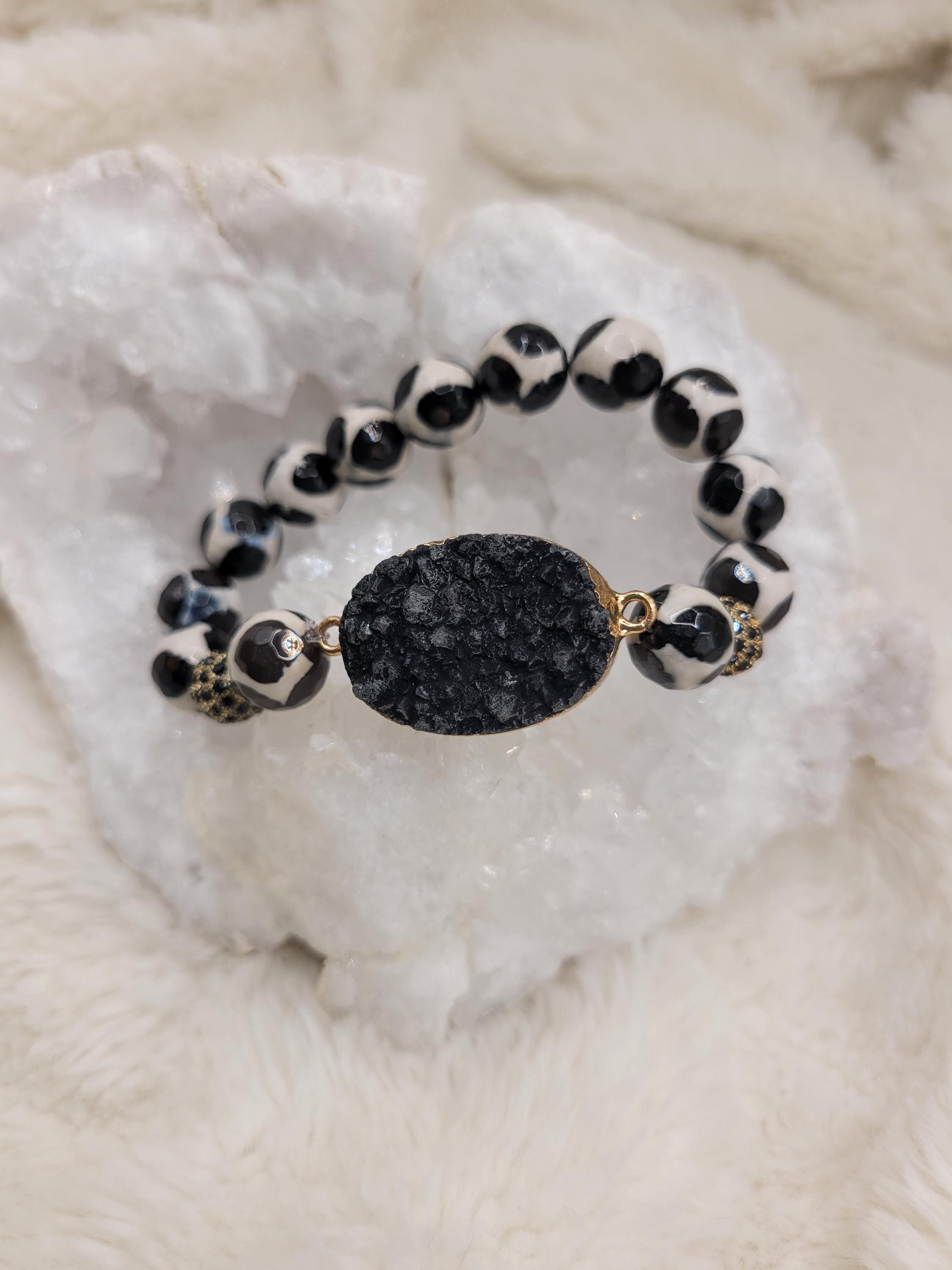 Energetically GROUNDING faceted giraffe agate beads complimenting gold plated druzy black agate focalpiece stretch stacking bracelet