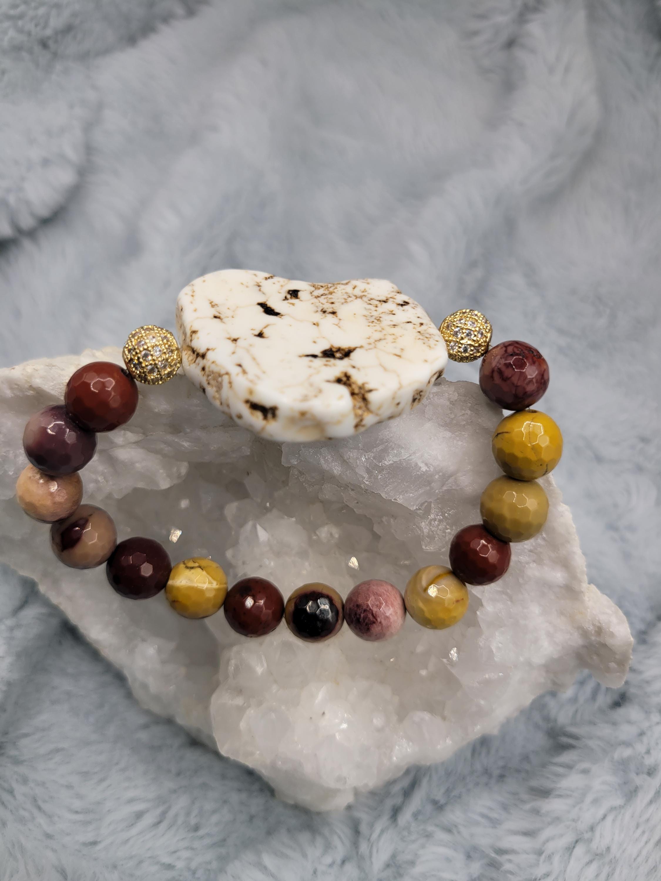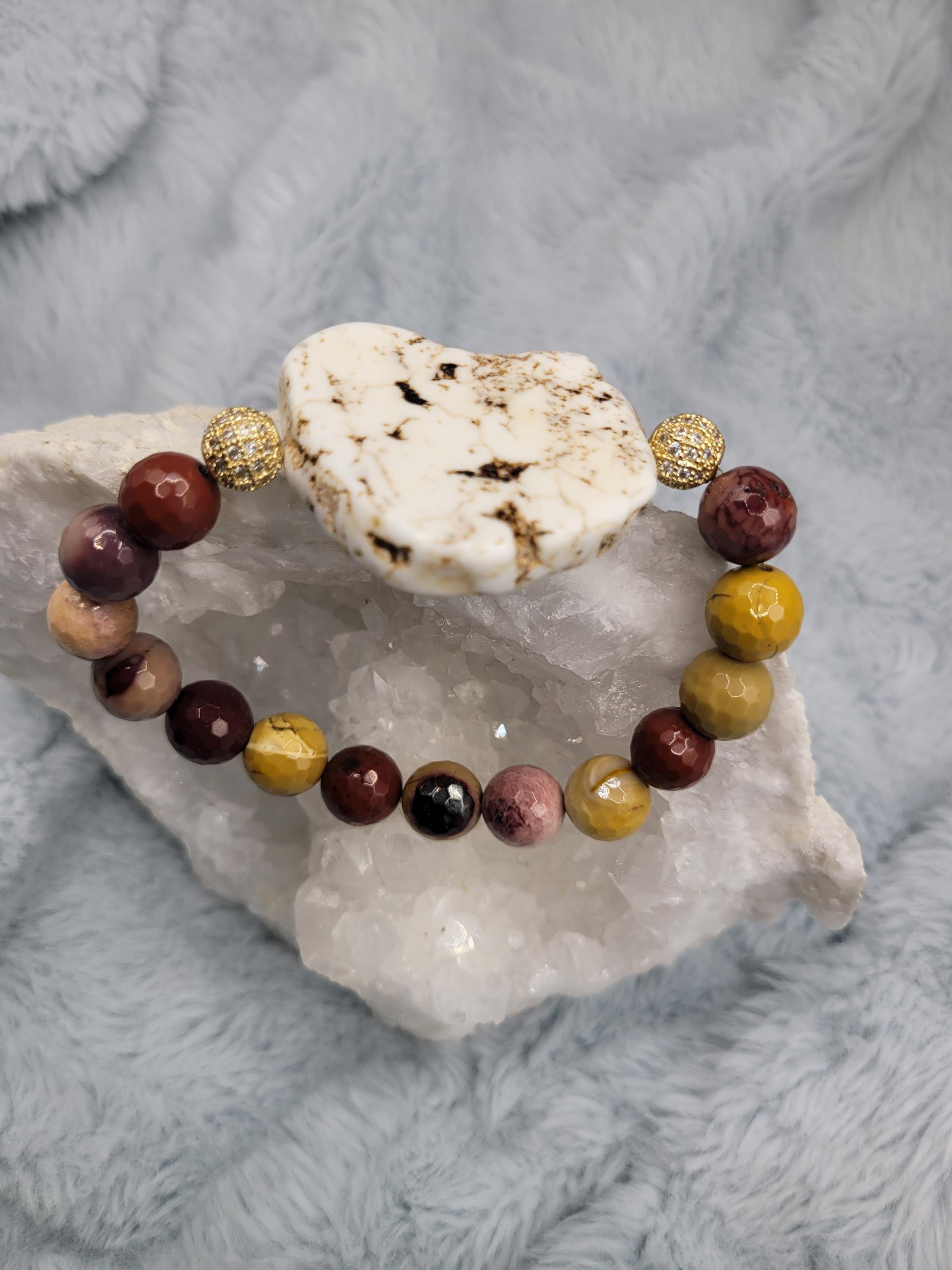 Energetically REGENERATING bracelet designed with natural 10 mm faceted mookaite beads complimenting howlite slab focal bead.