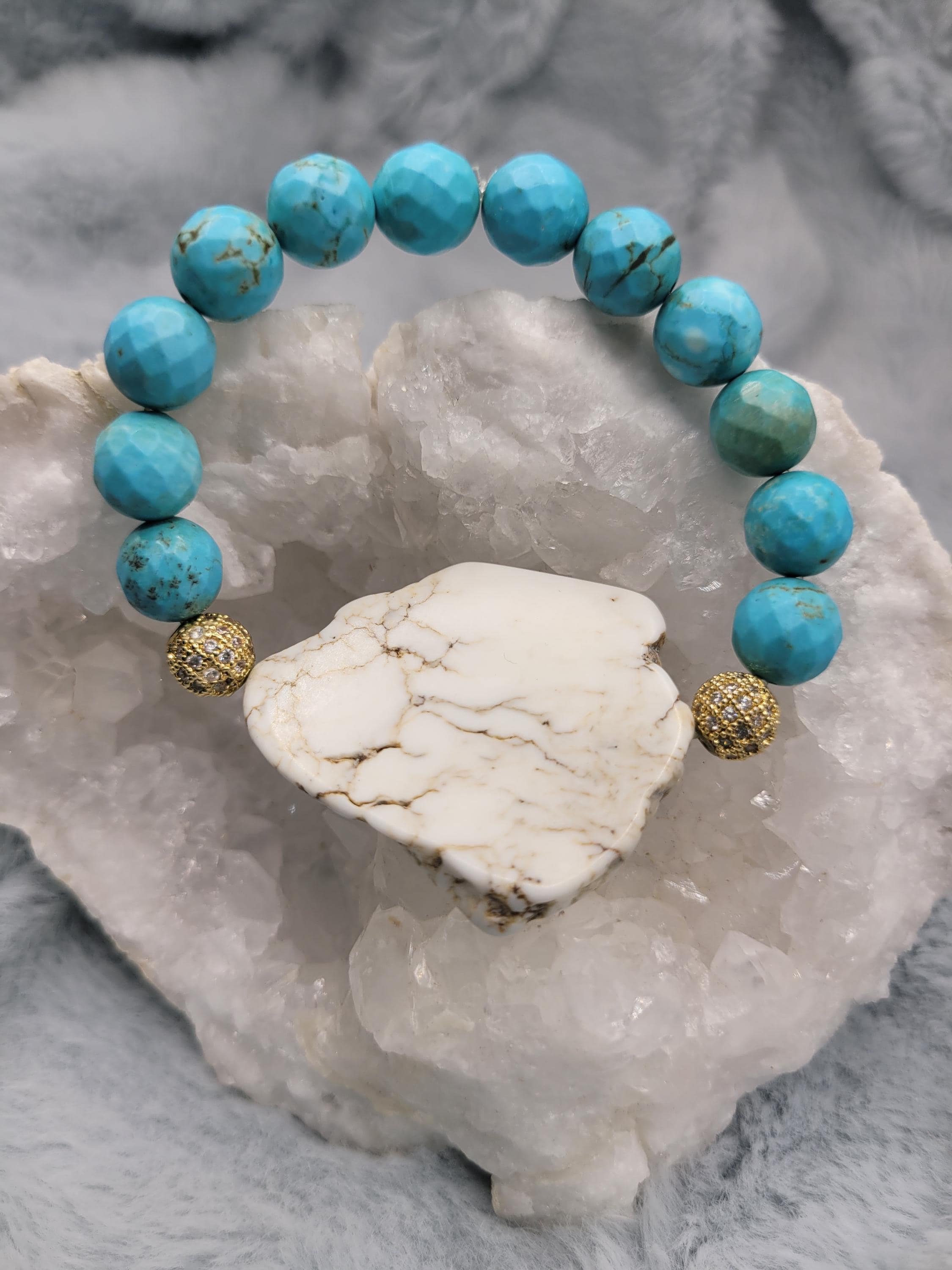Energetically EMPOWERING bracelet designed with natural 10 mm faceted turquoise and gold paved with cubic zirconia beads complimenting howlite slab focal bead.