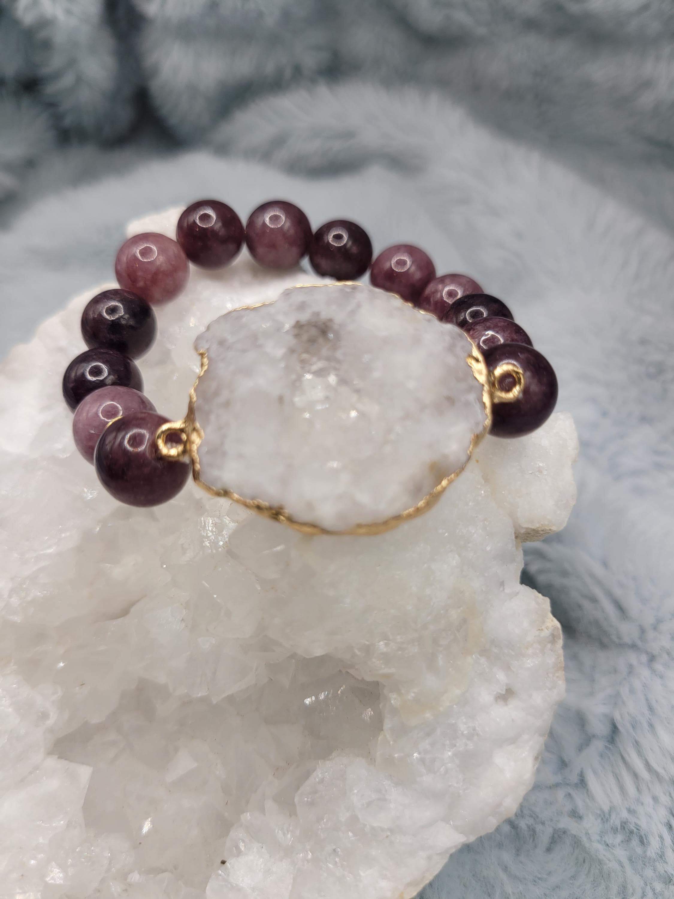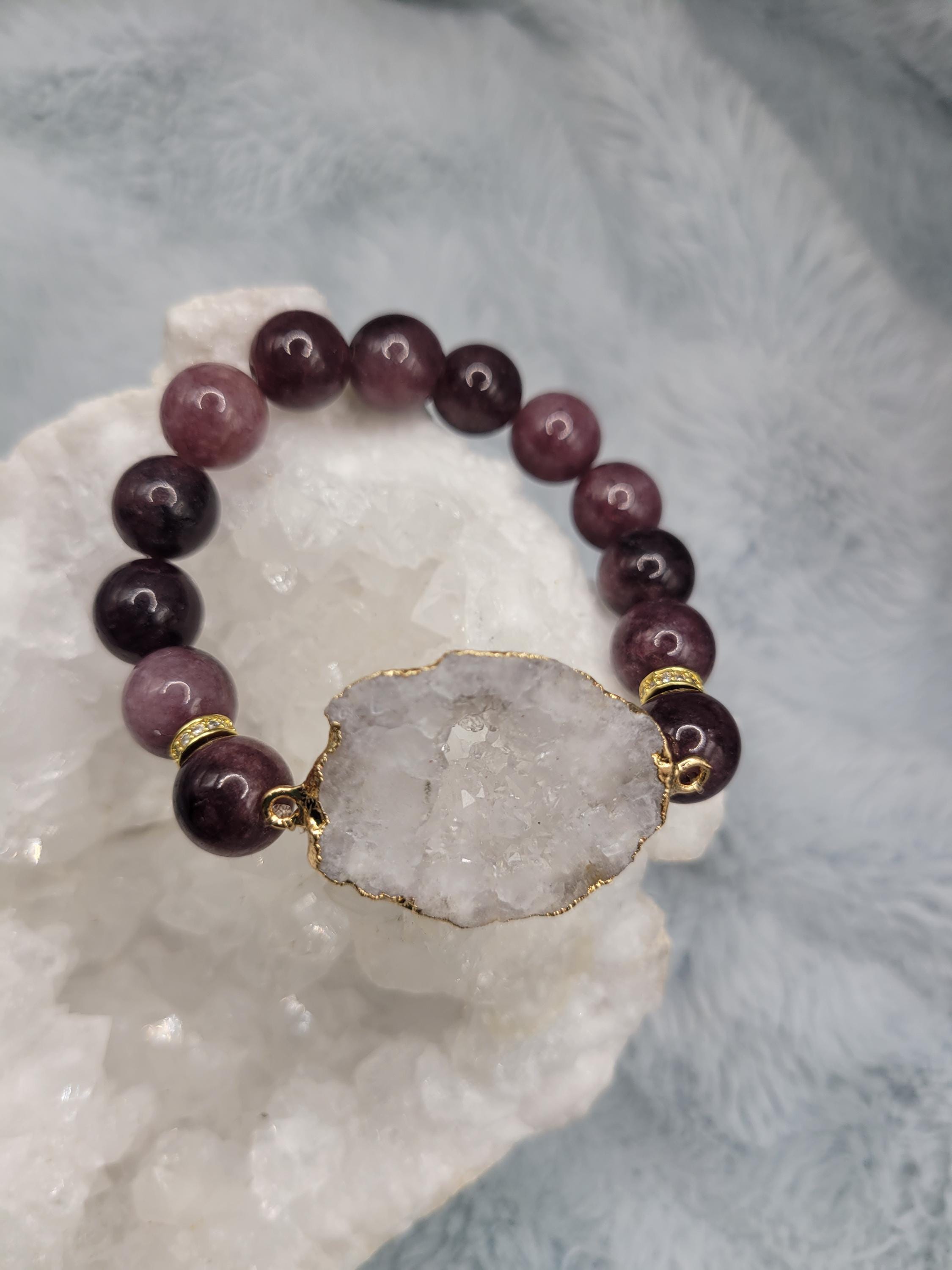 Energetically STABILIZING purple berry quartzite beads complimenting gold plated druzy quartz focalpiece stretch stacking bracelet