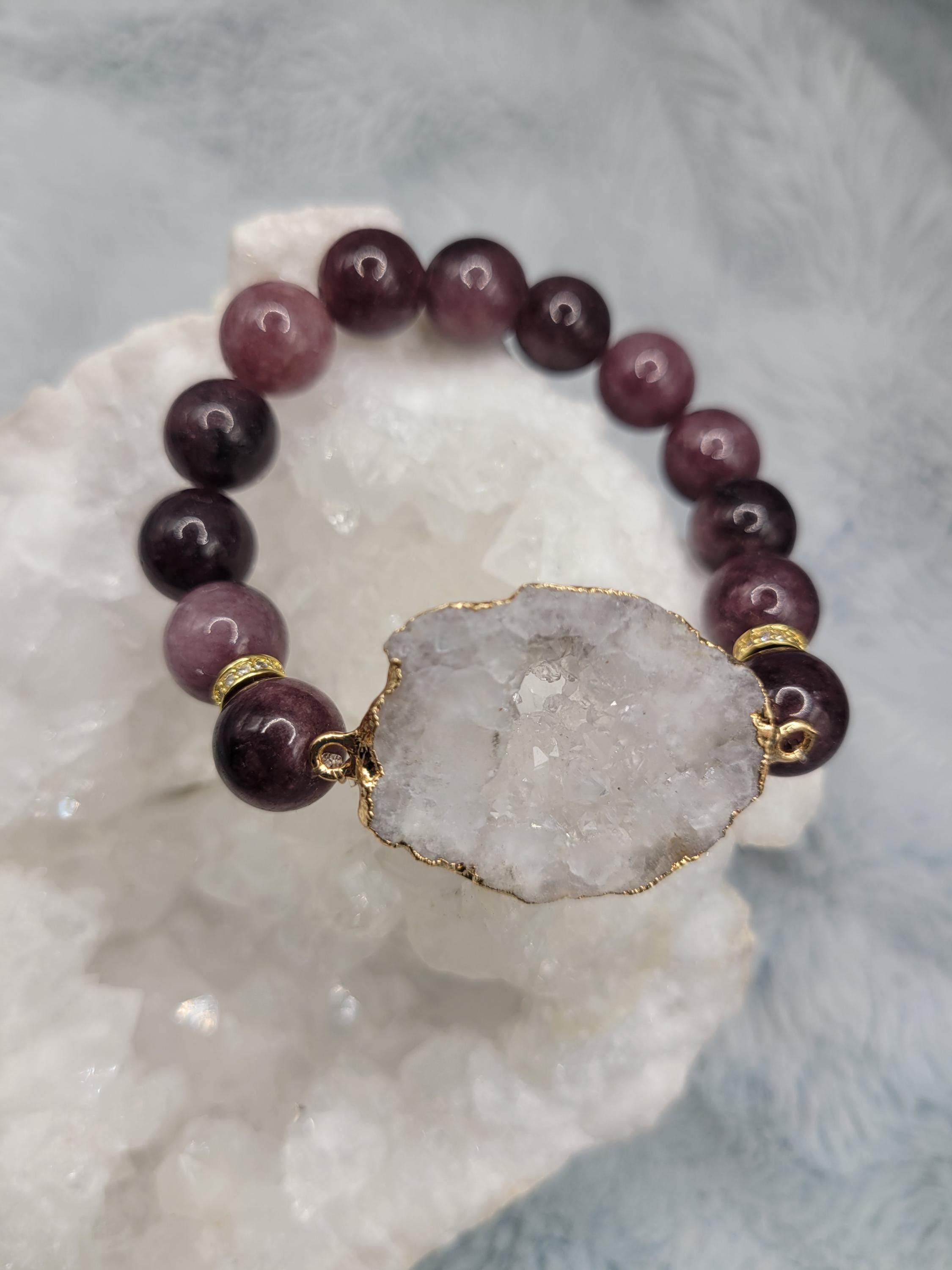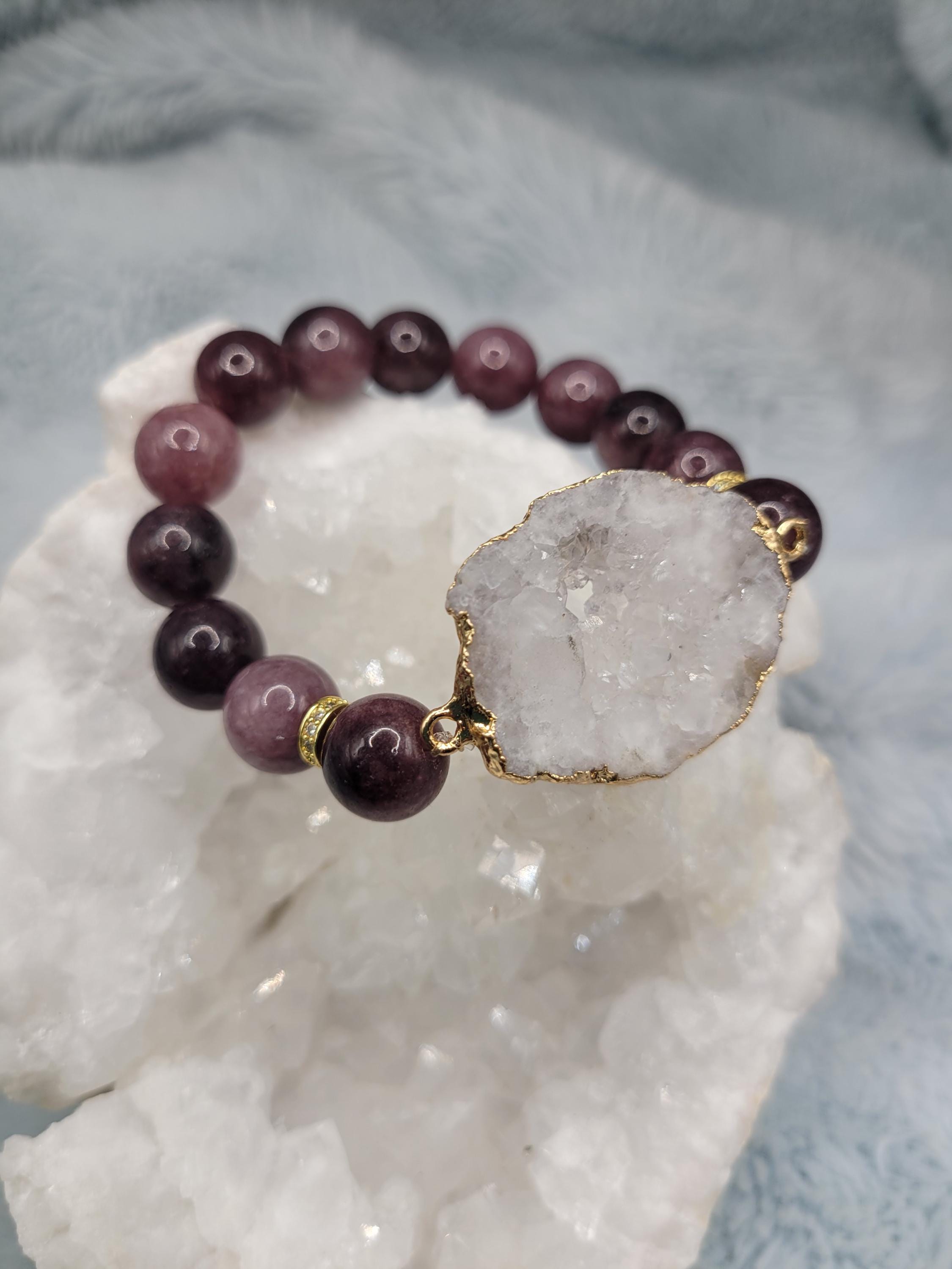 Energetically STABILIZING bracelet designed with natural 10 mm purple berry quartzite beads complimenting gold plated druzy quartz focal piece.