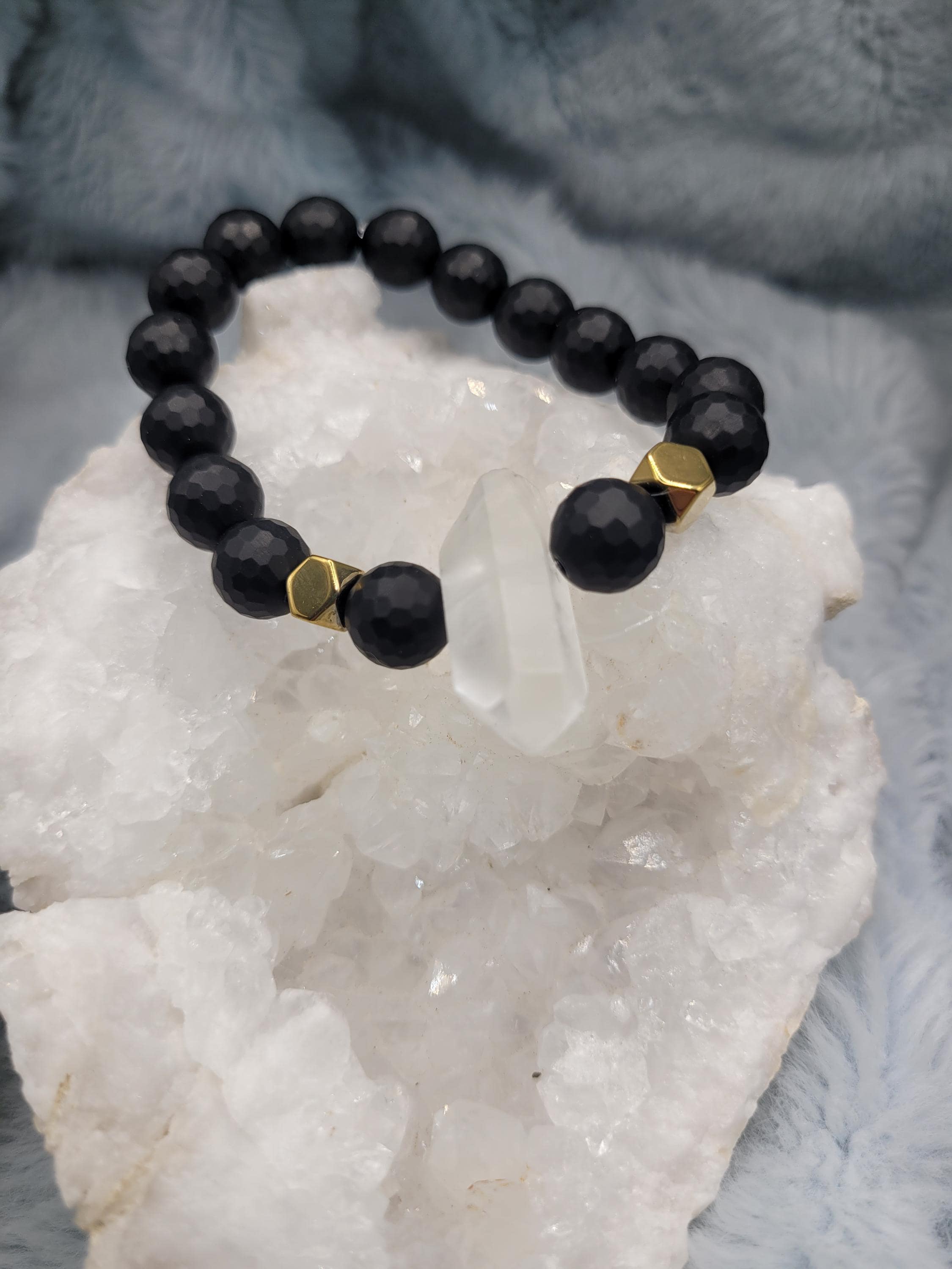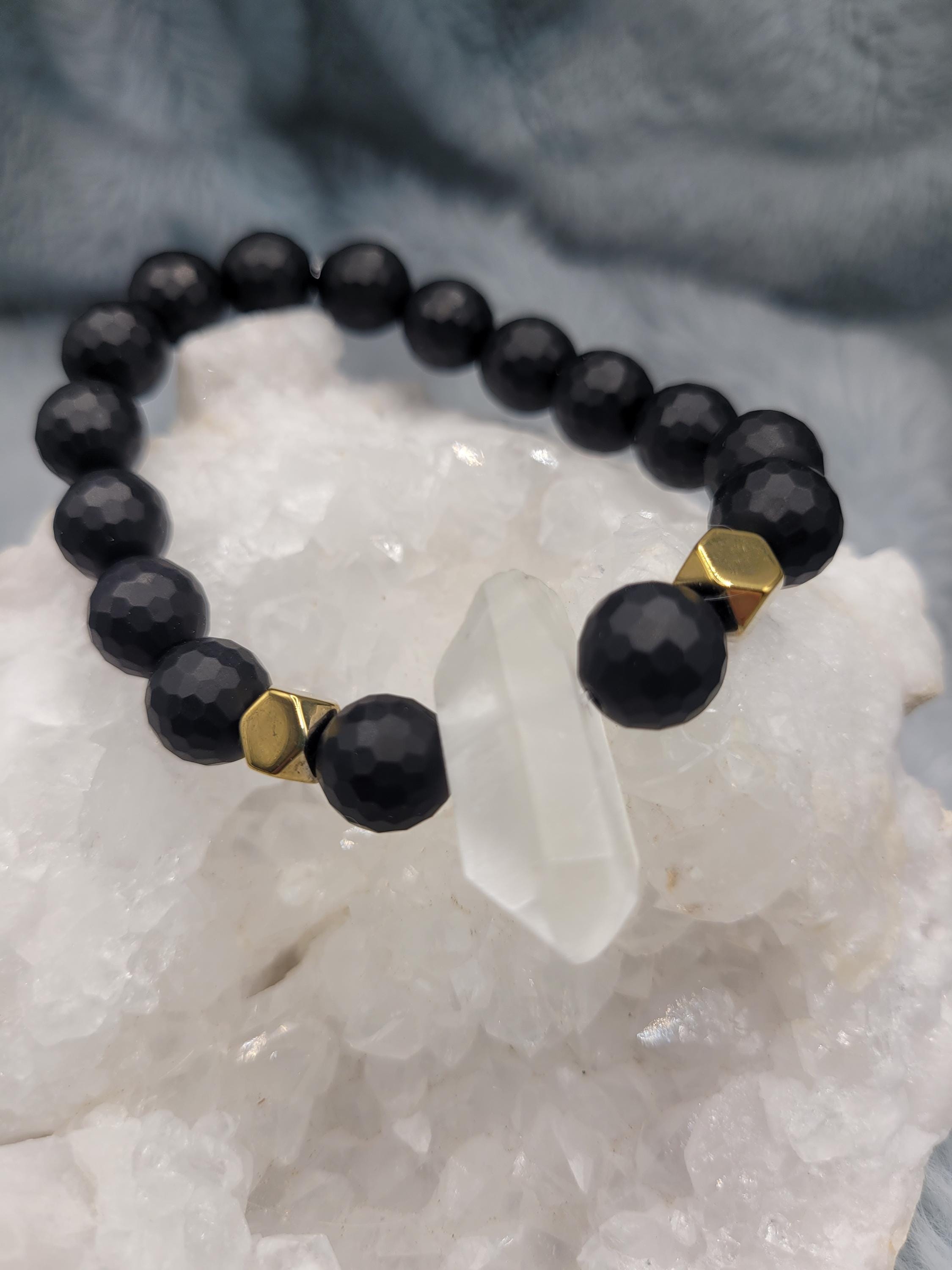 Energetically GROUNDING bracelet designed with 10 mm faceted black matte onyx gemstone round beads paired with quartz point and hematite beads.