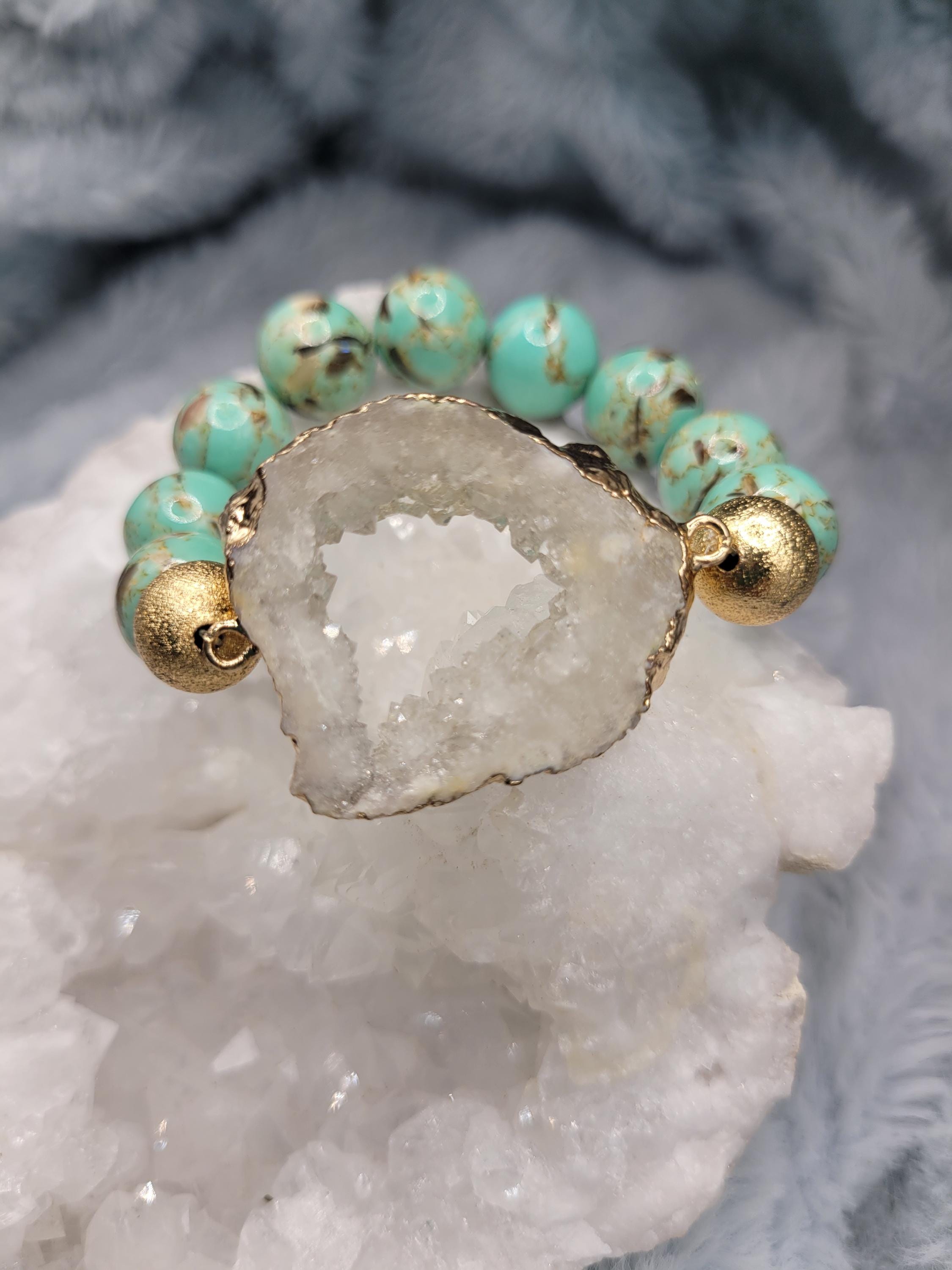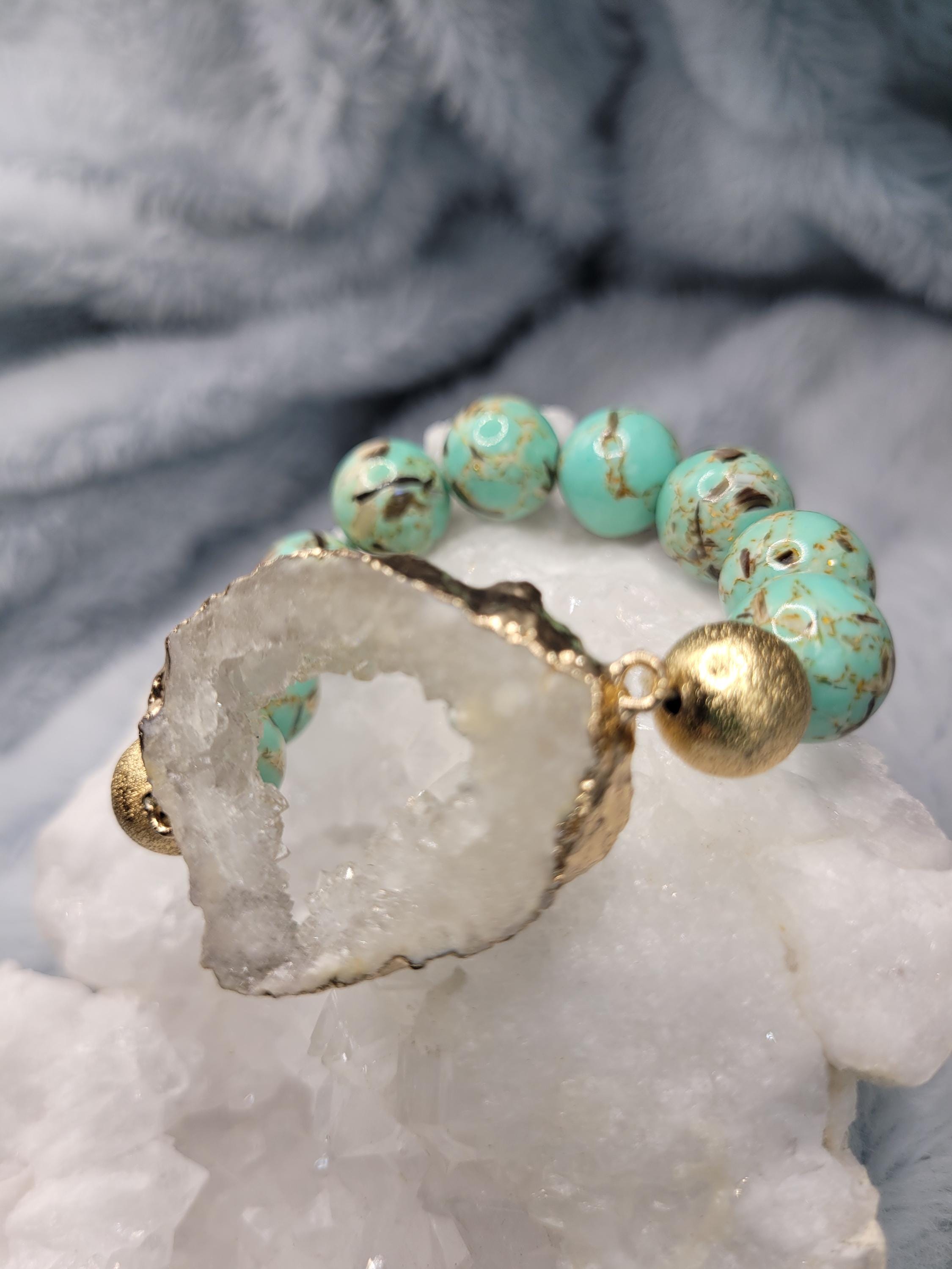 Energetically ELEVATING peacock blue turquoise beads complimenting gold plated druzy quartz focalpiece stretch stacking bracelet