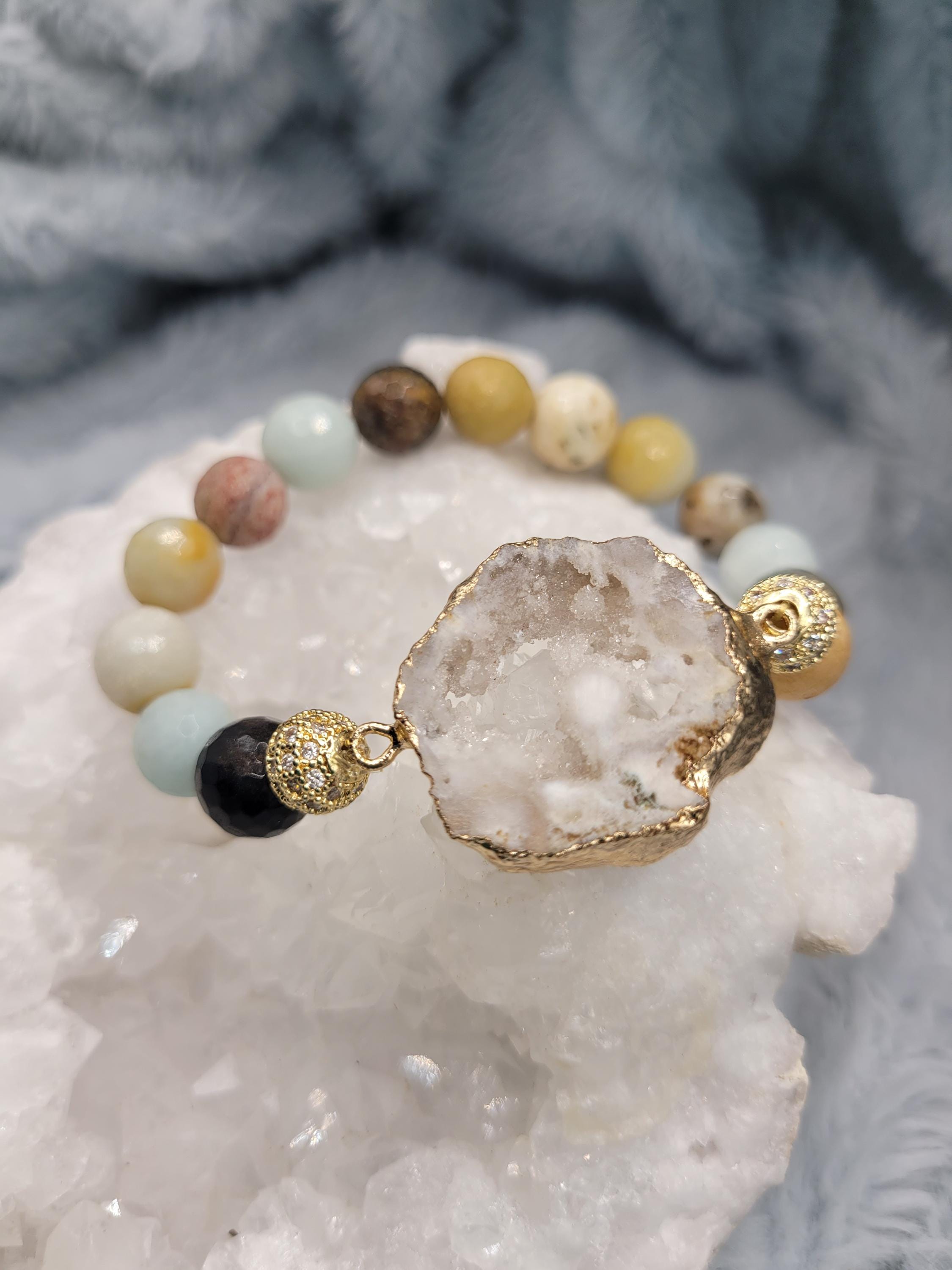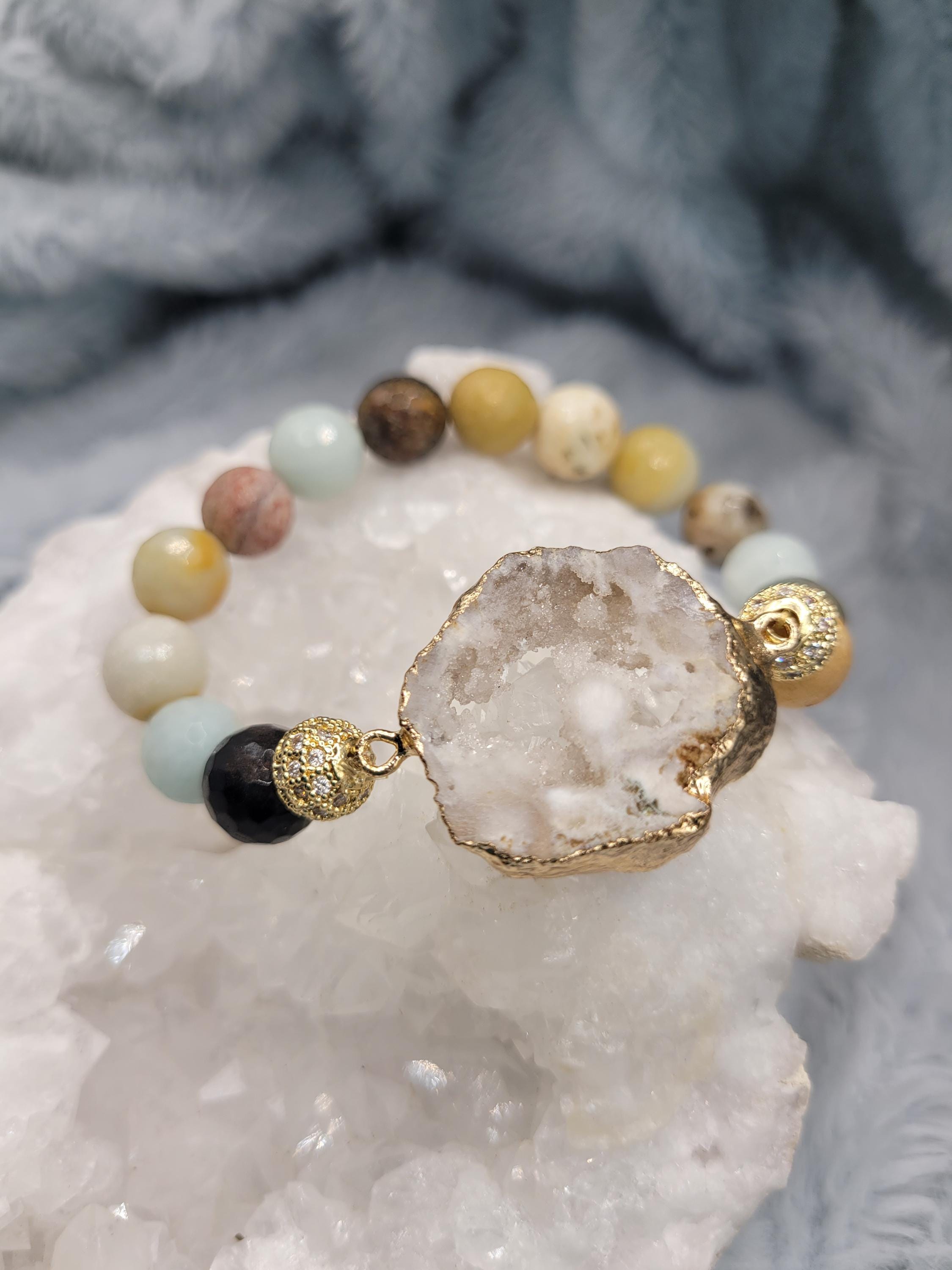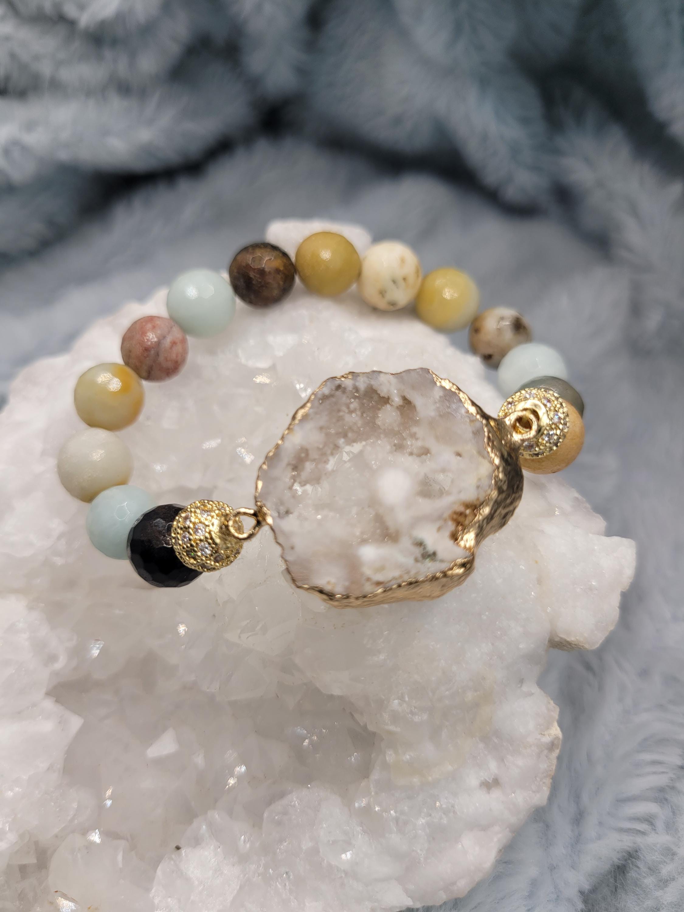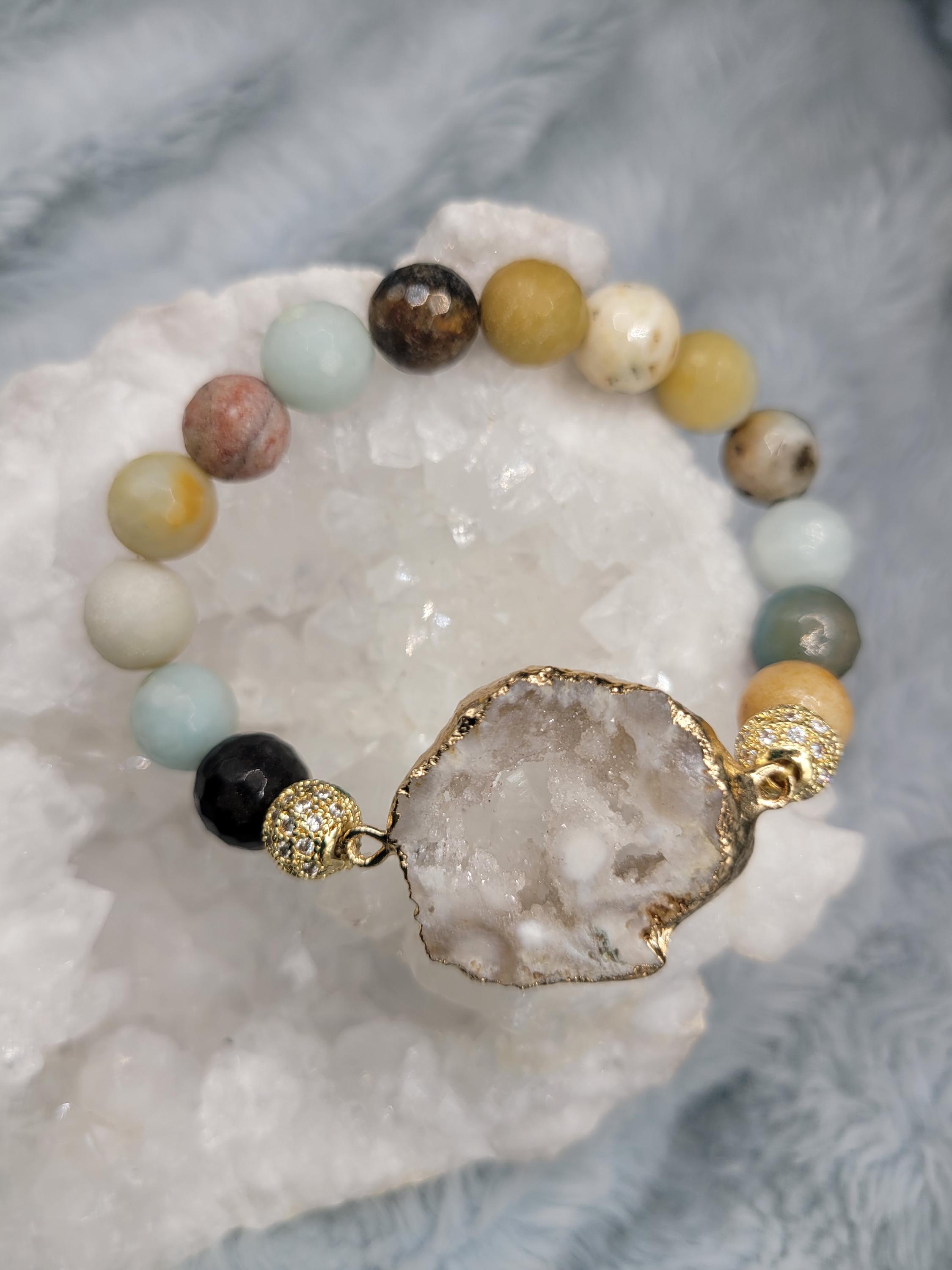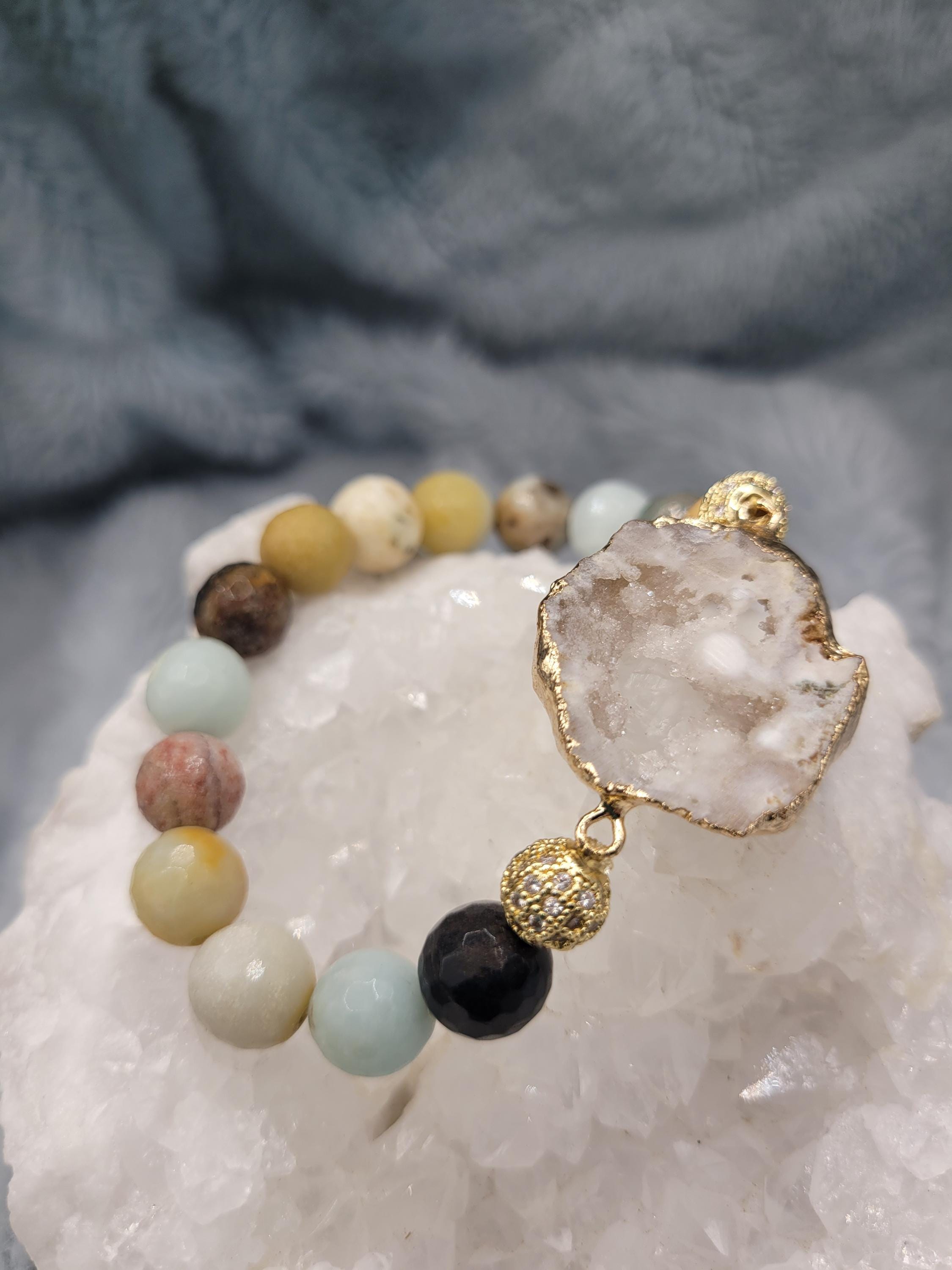 Energetically SOOTHING bracelet designed with natural 10 mm faceted amazonite beads complimenting gold plated druzy quartz focal piece.
