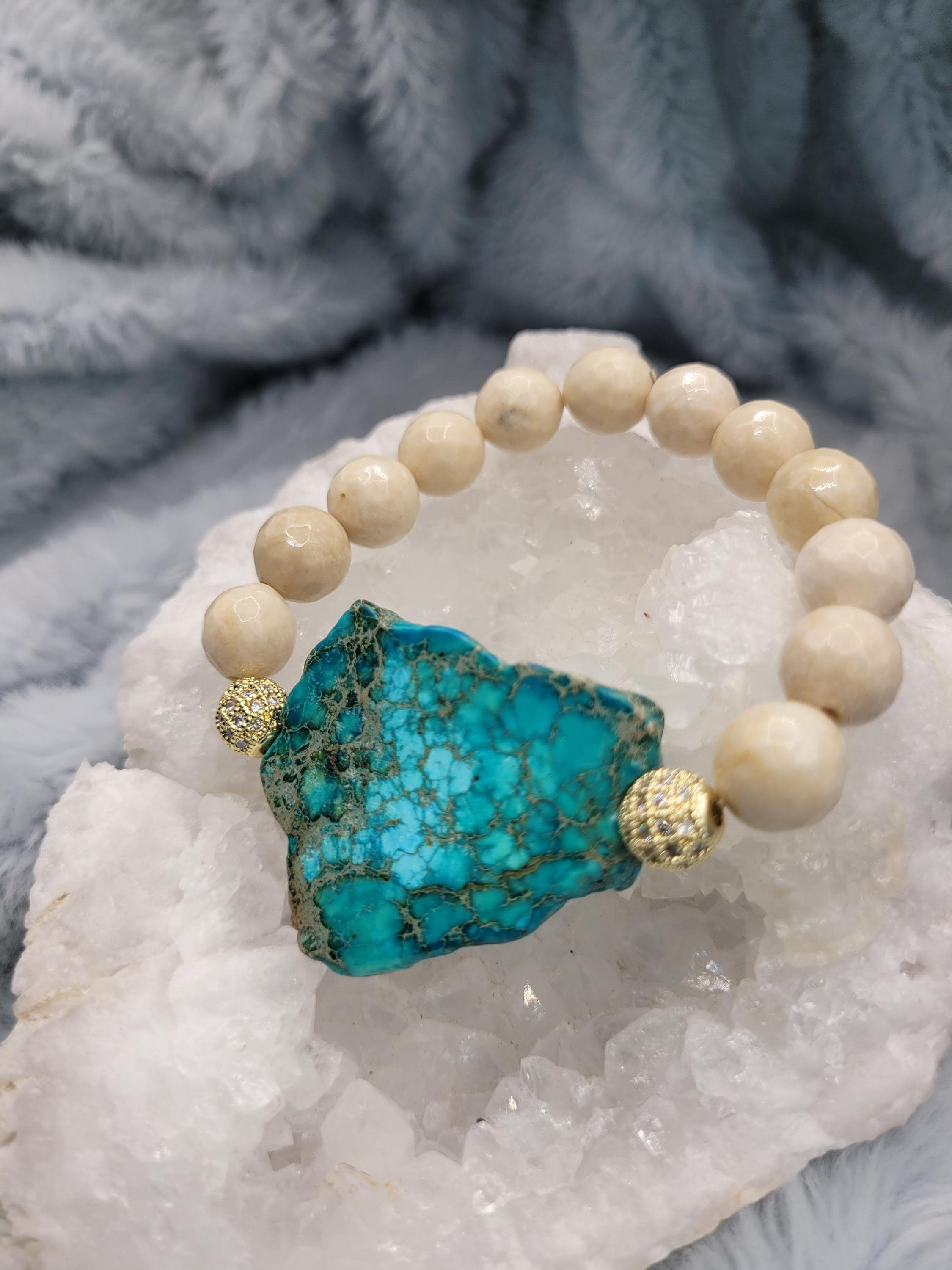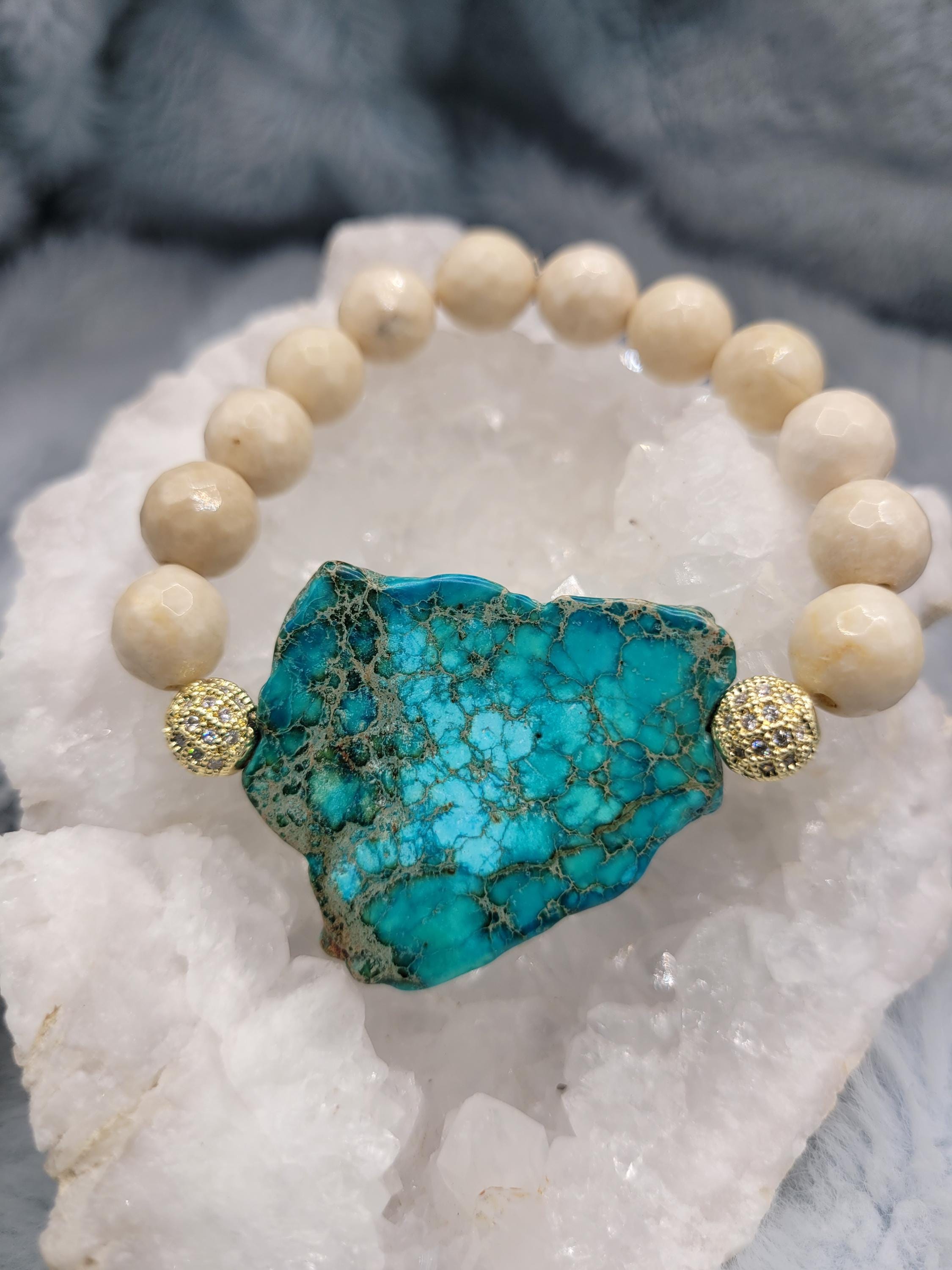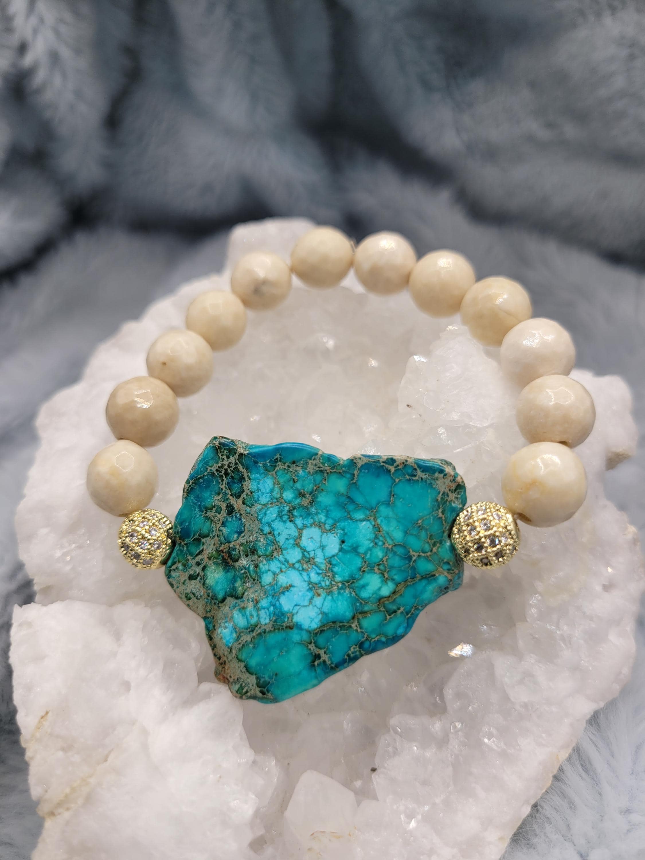 Energetically EMPOWERING faceted sandstone beads complimenting turquoise slab focal bead stretch, stacking bracelet