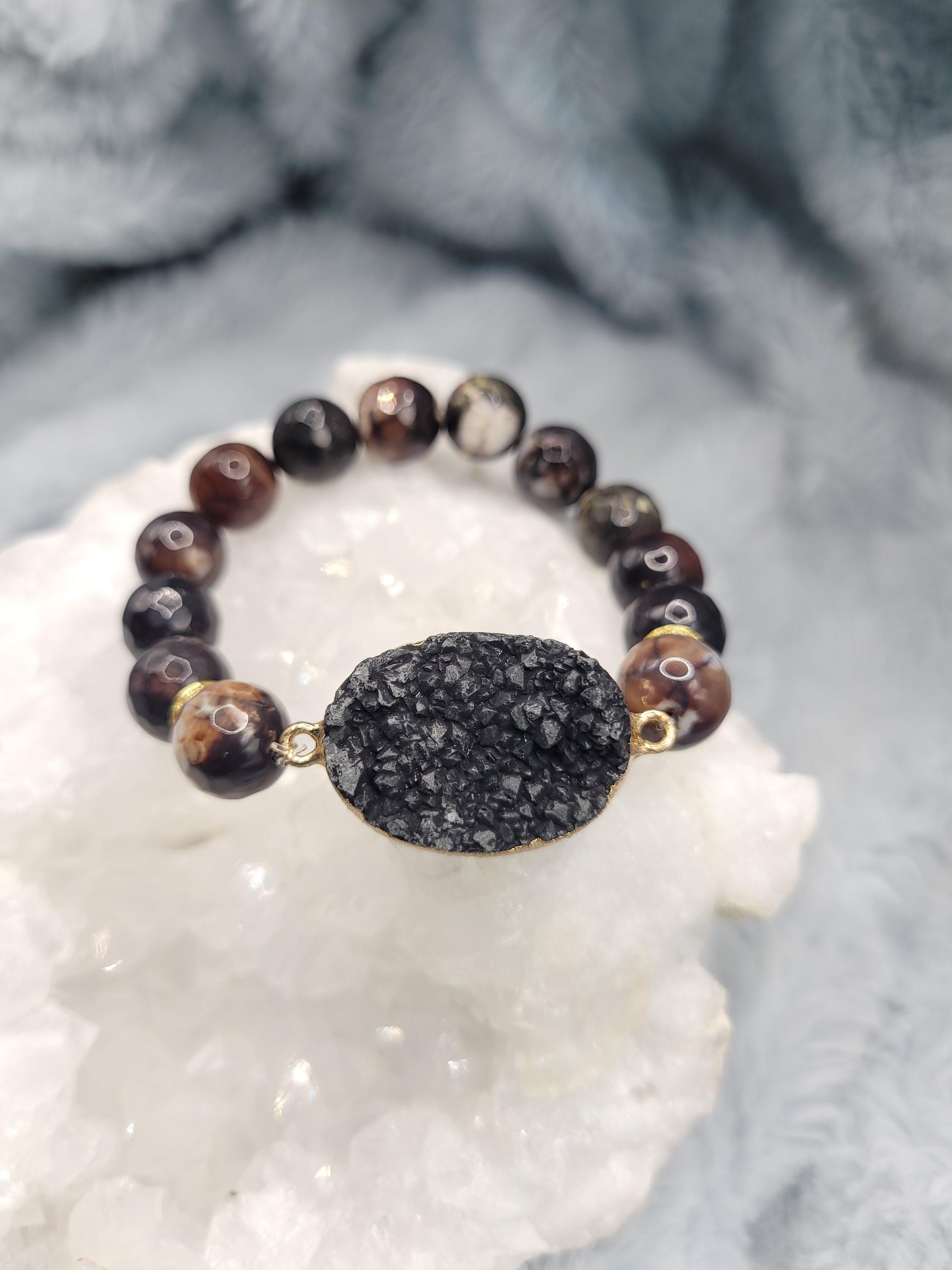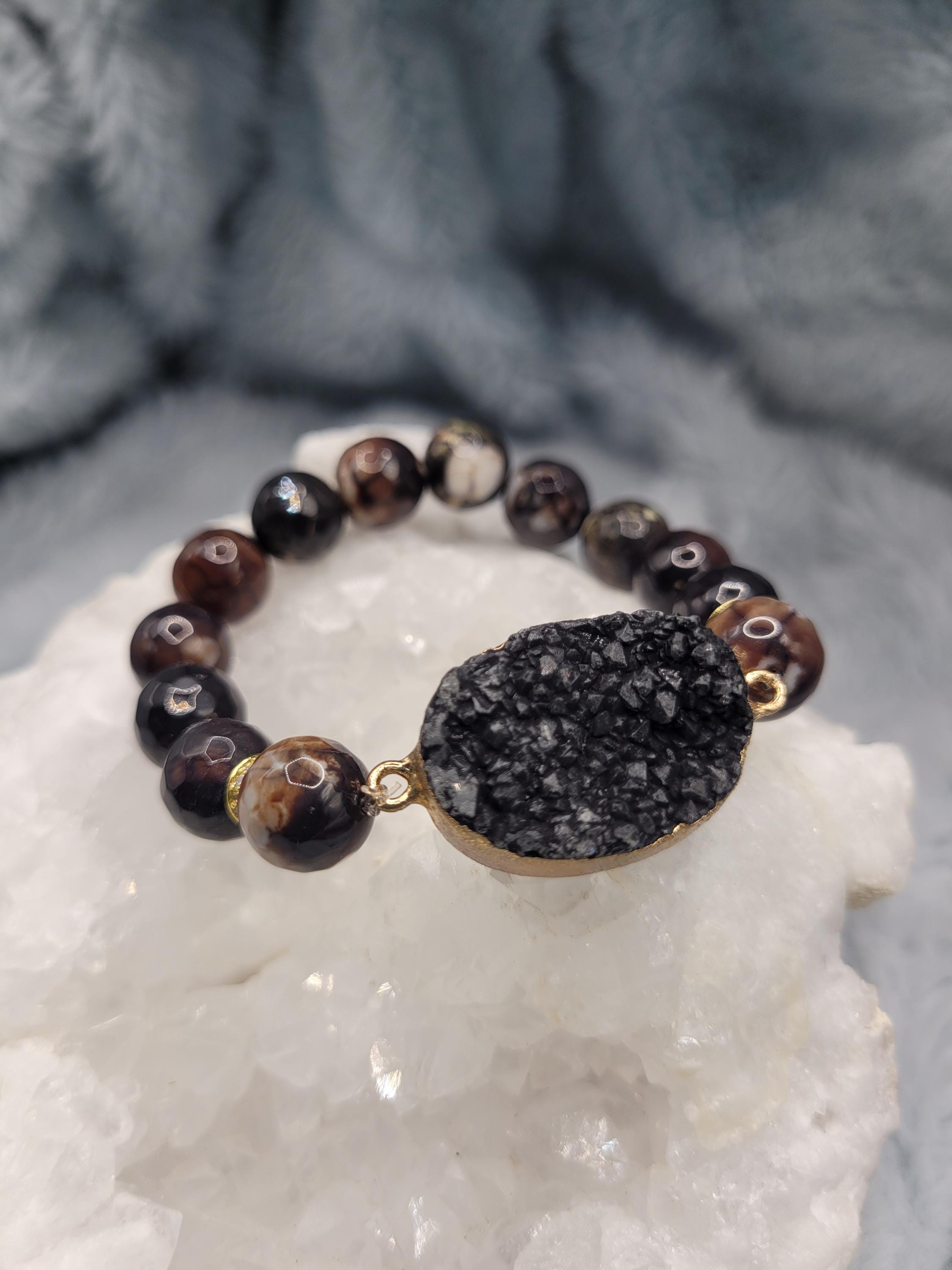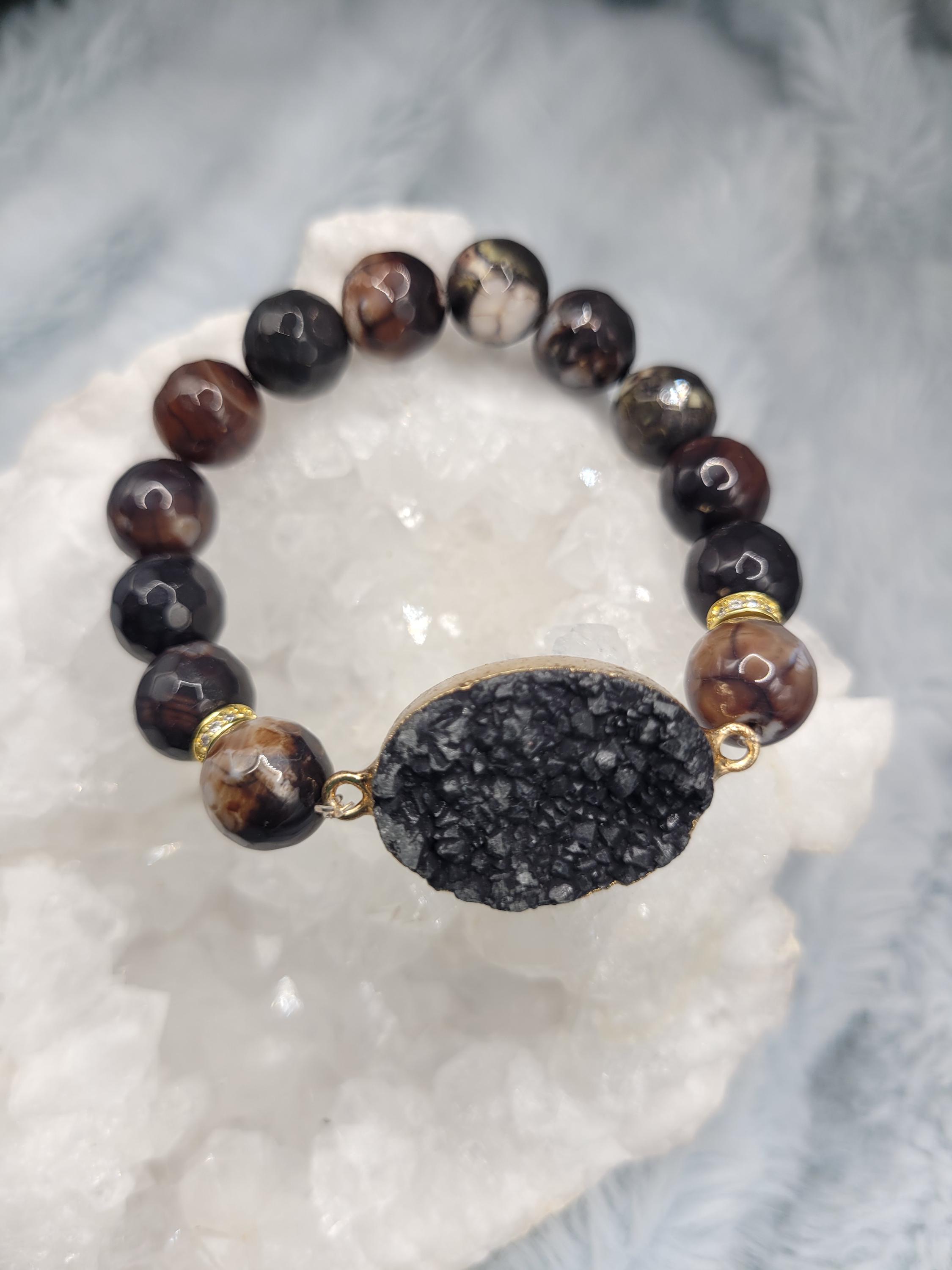 Energetically IGNITING faceted coffee fire agate beads complimenting gold plated druzy black agate focalpiece stretch stacking bracelet
