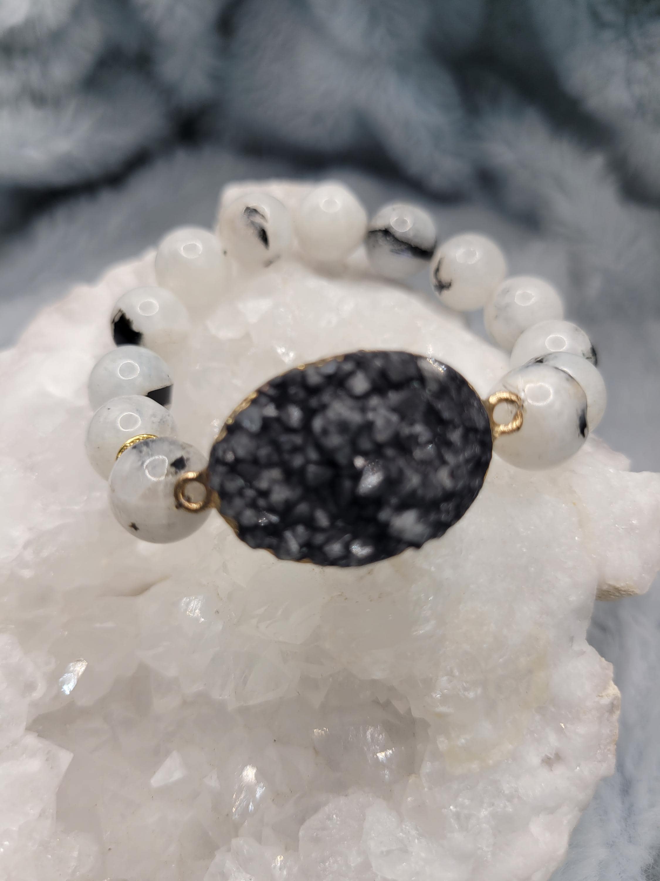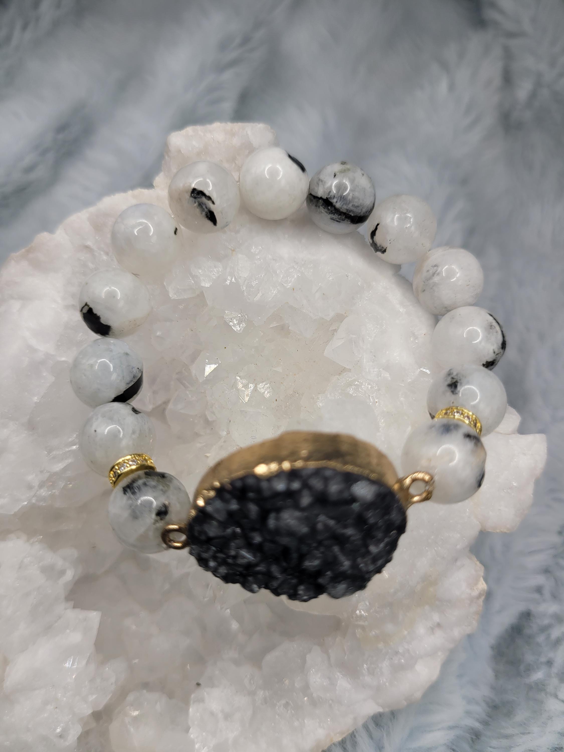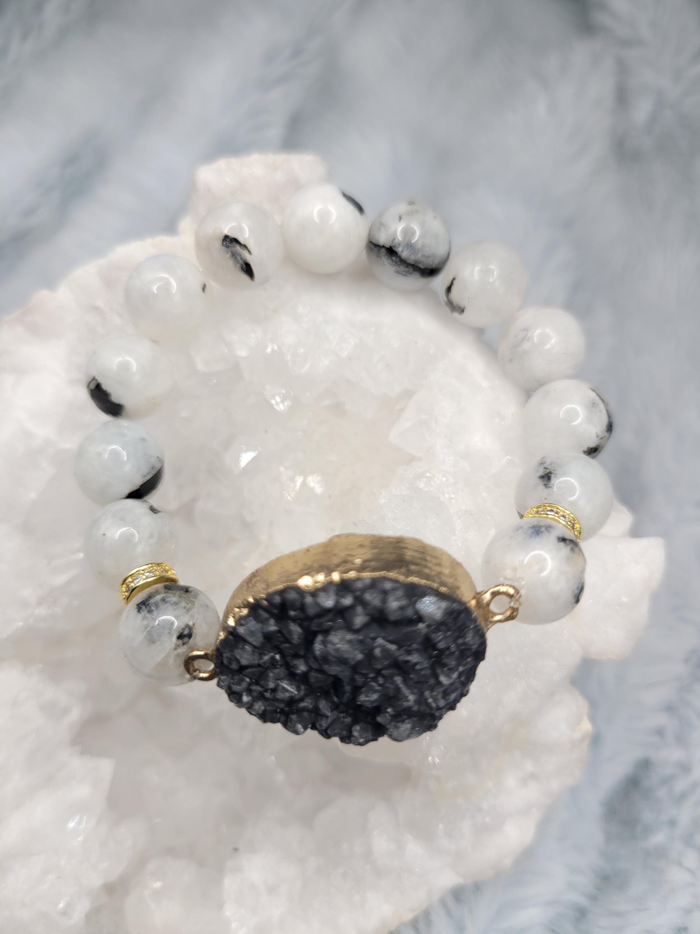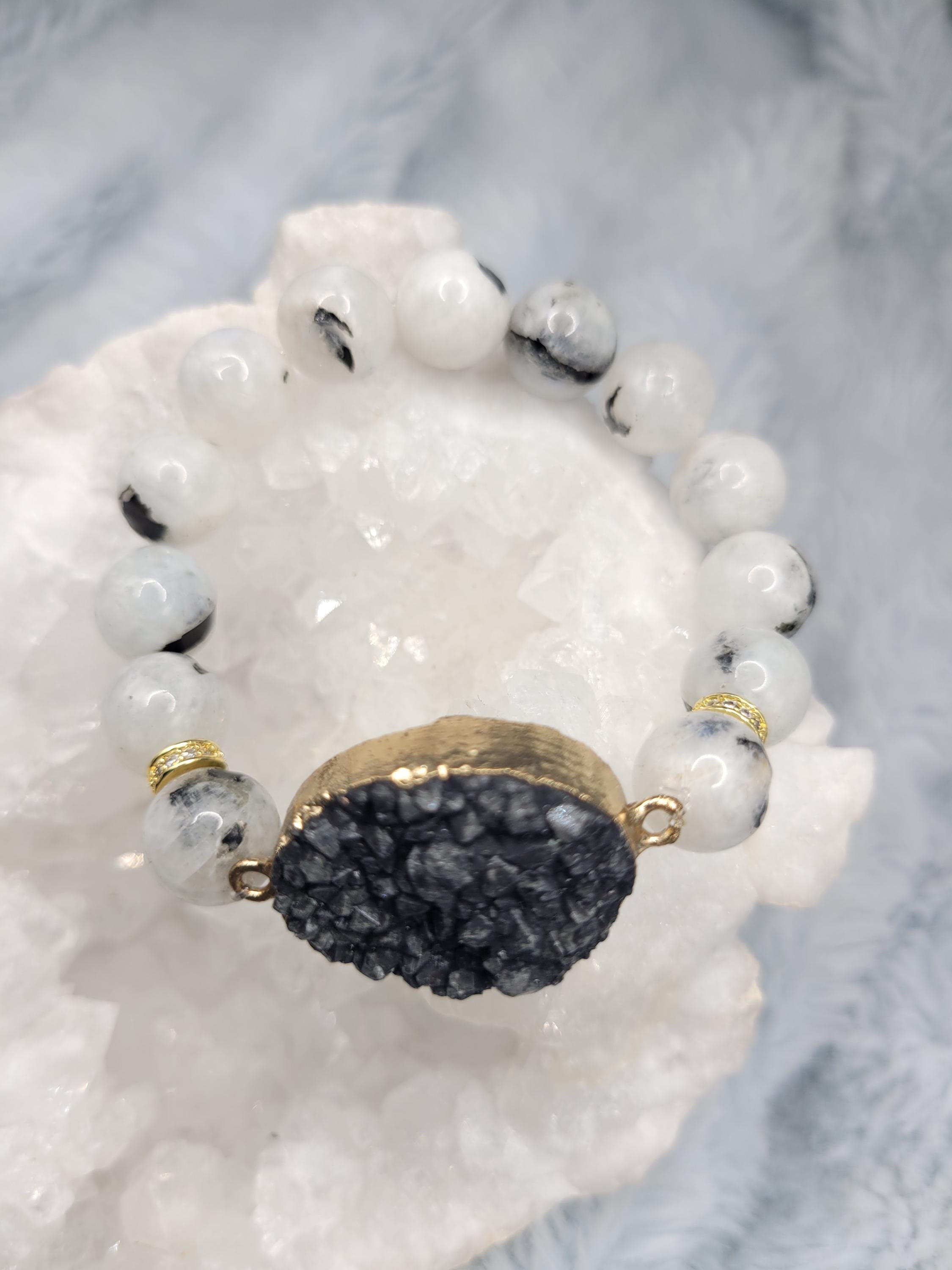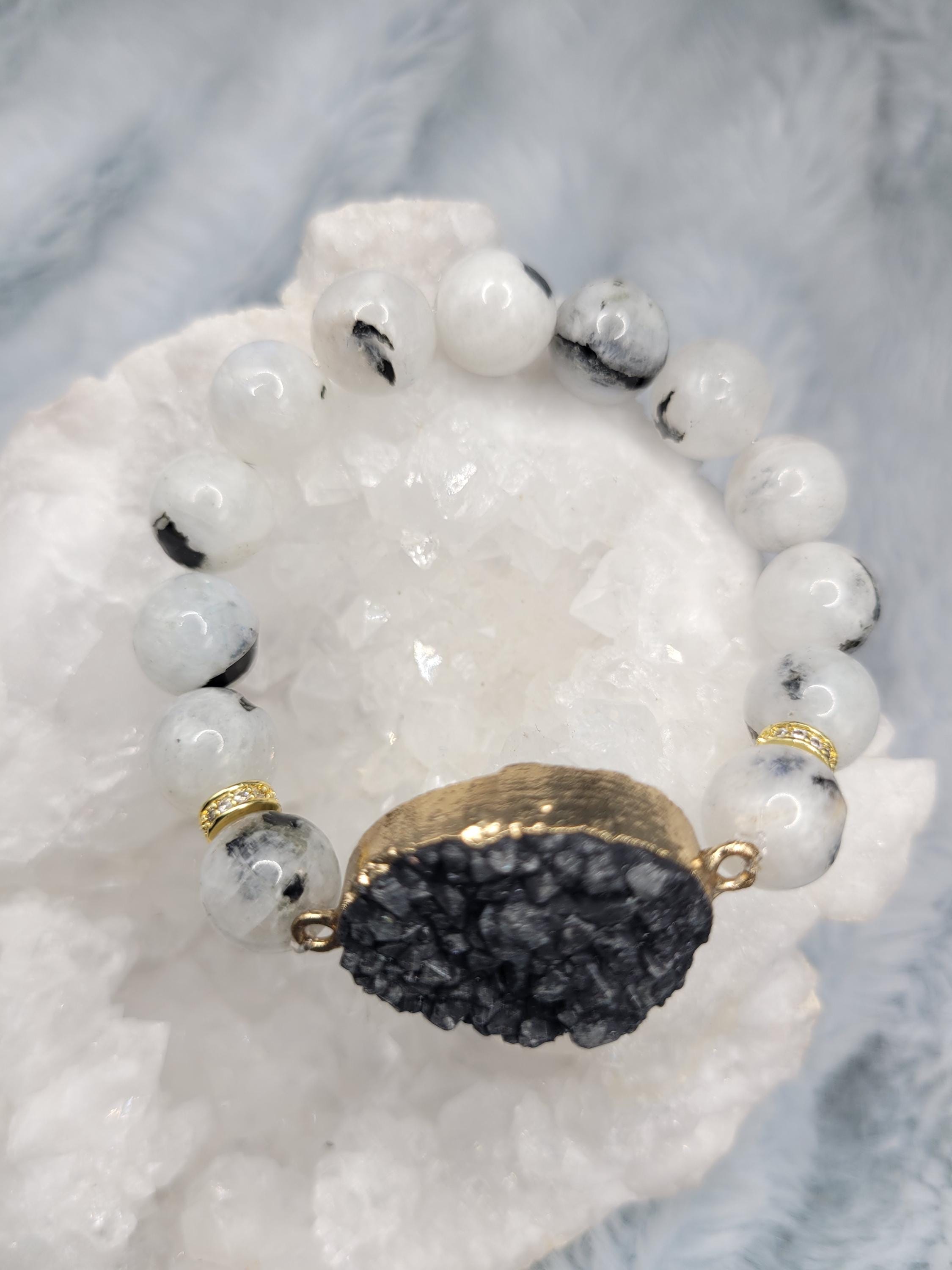 Energetically PROTECTING rainbow moonstonr beads complimenting gold plated druzy black agate focalpiece stretch stacking bracelet
