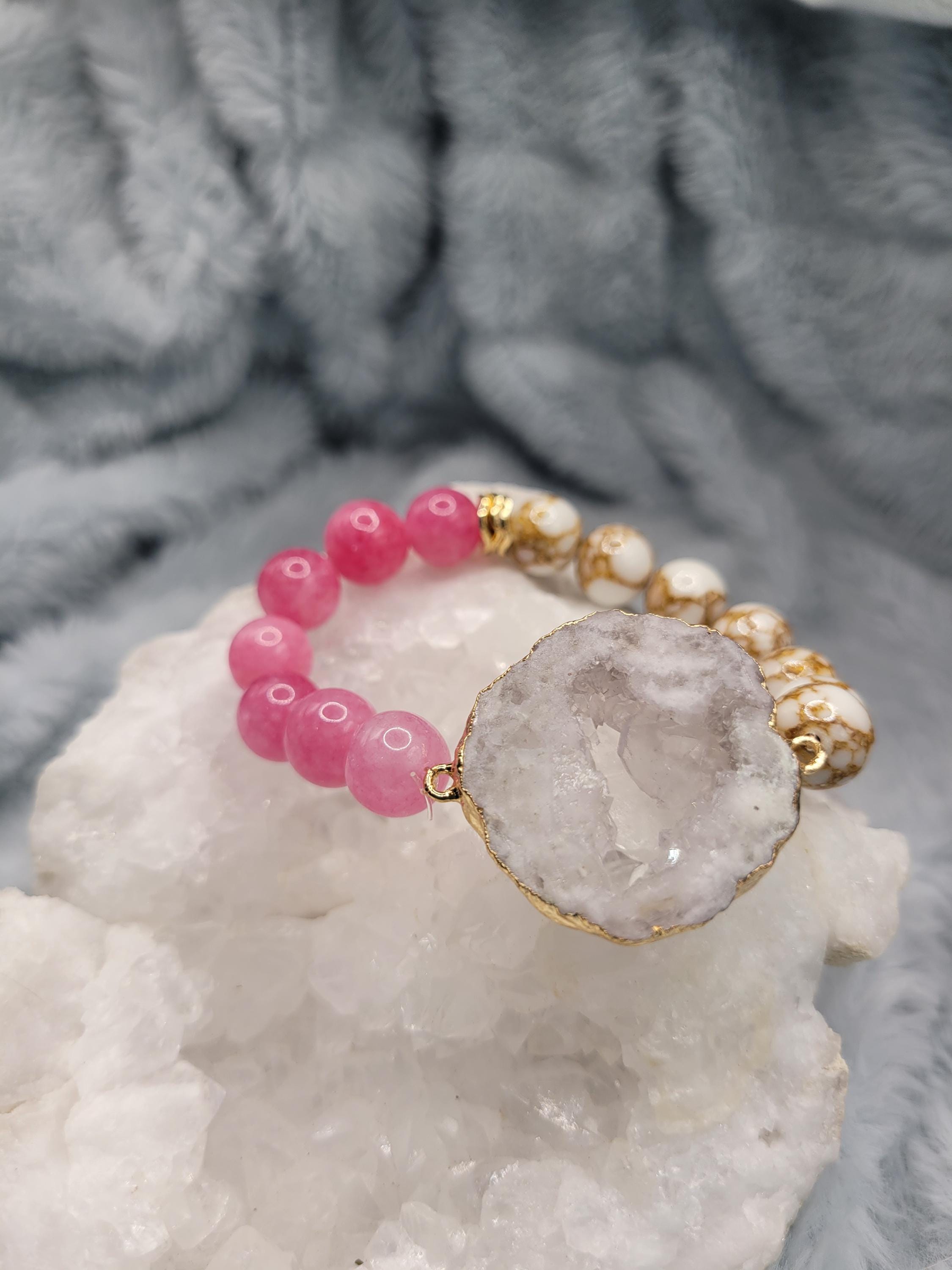 Energetically LOVING bracelet designed with natural 10 mm smooth round pink tormaline and copper spun howlite beads complimenting gold plated druzy quartz focal piece.