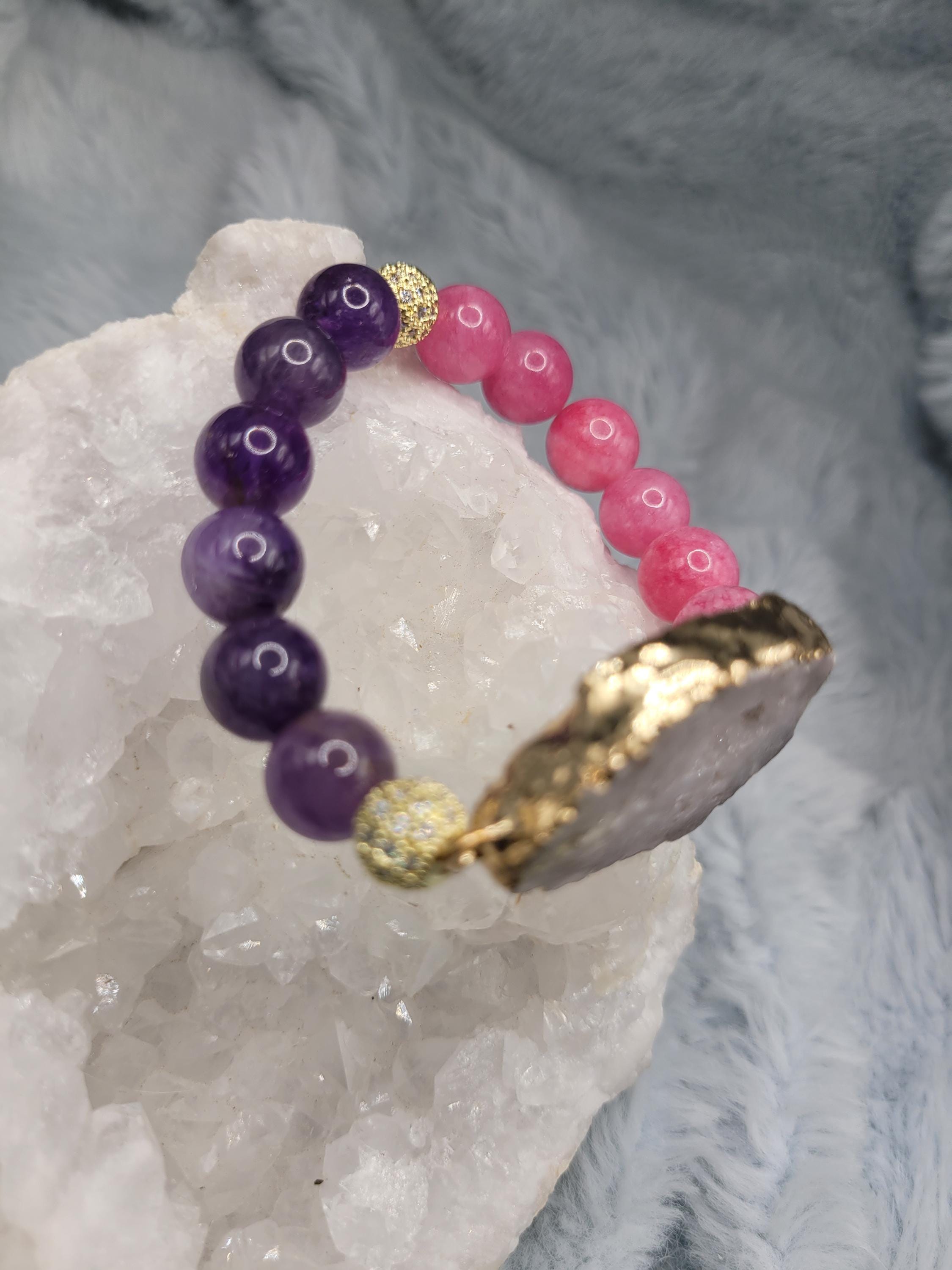Energetically HEALING bracelet designed with natural 10 mm amethyst and pink tourmaline beads complimenting gold plated druzy quartz focal piece.