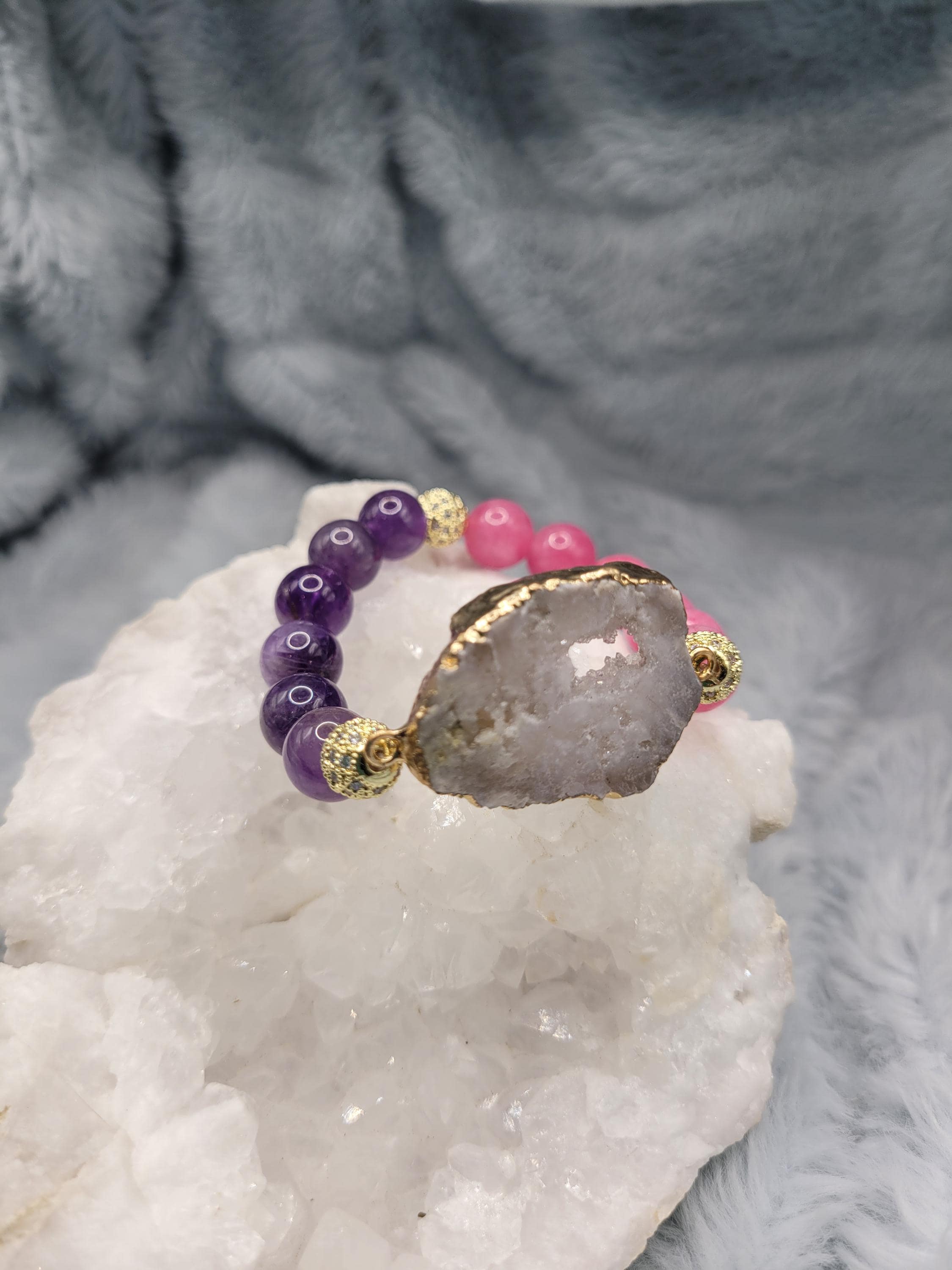 Energetically HEALING amethyst and pink tourmaline beads complimenting gold plated druzy quartz focalpiece stretch stacking bracelet