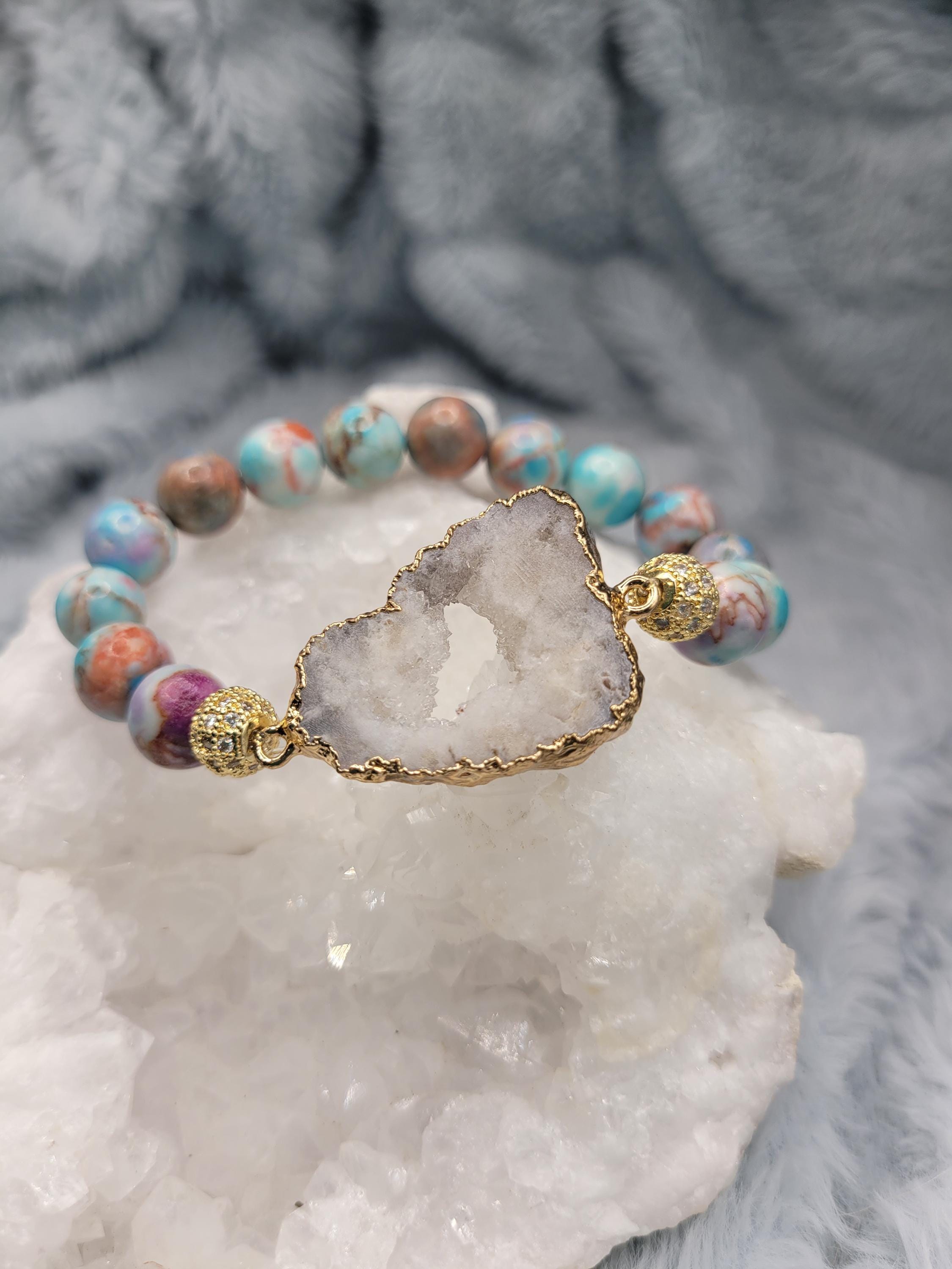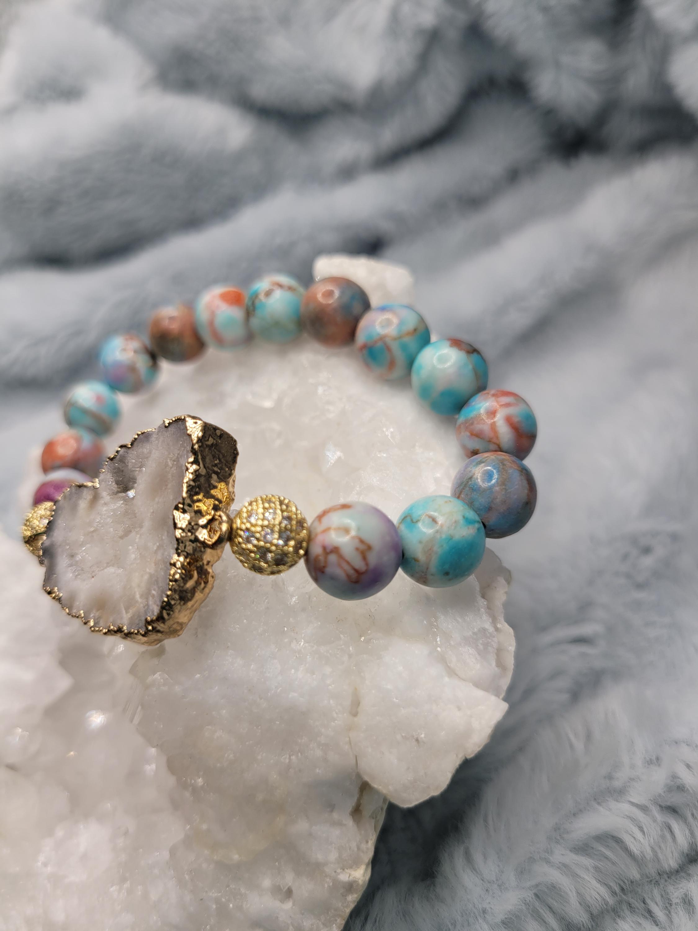 Energetically ELEVATING bracelet designed with natural 10 mm sea sediment jasper beads complimenting gold plated druzy quartz focal piece.