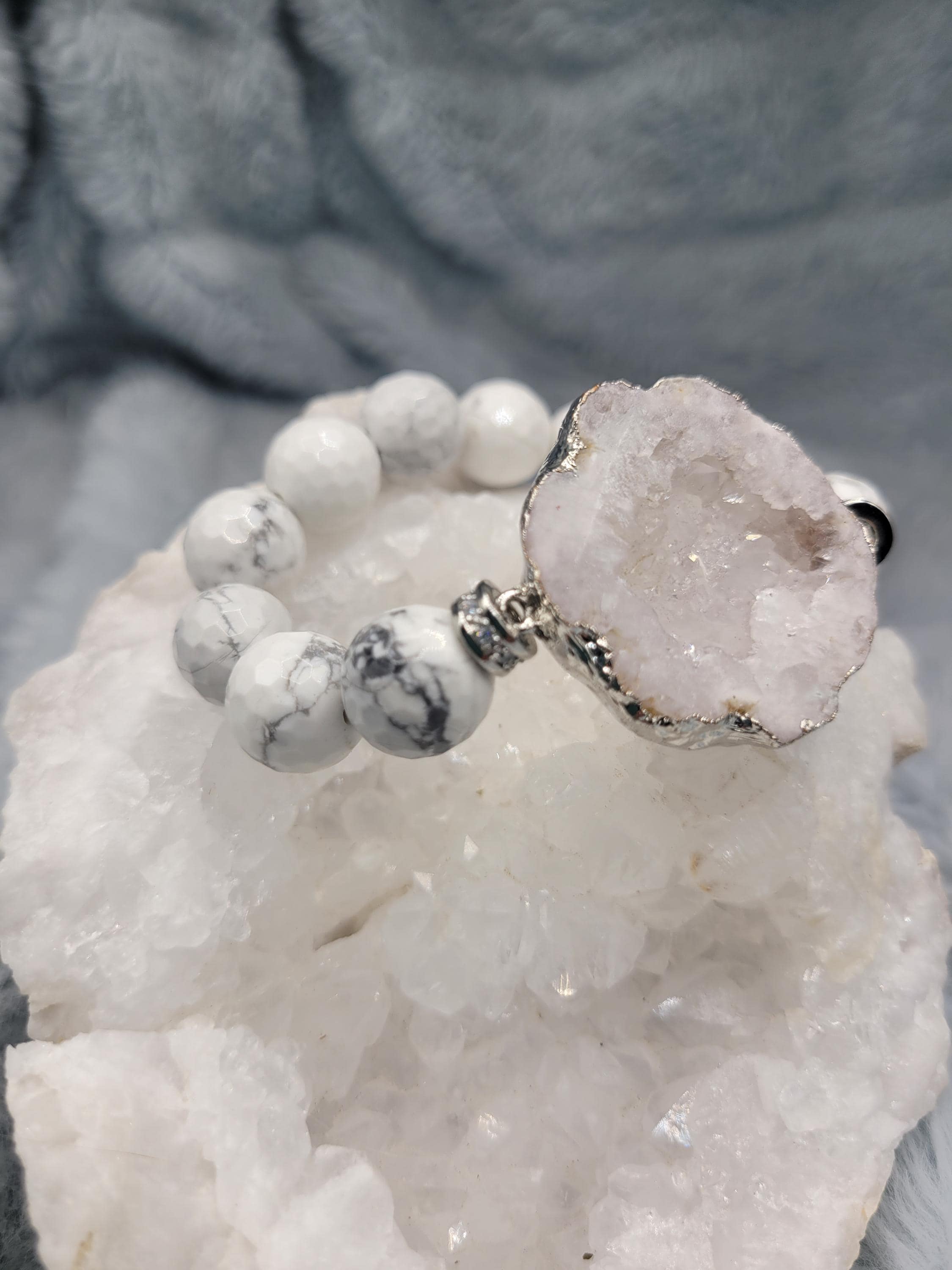 Energetically CALMING faceted howlite beads complimenting silver plated druzy quartz focalpiece stretch stacking bracelet