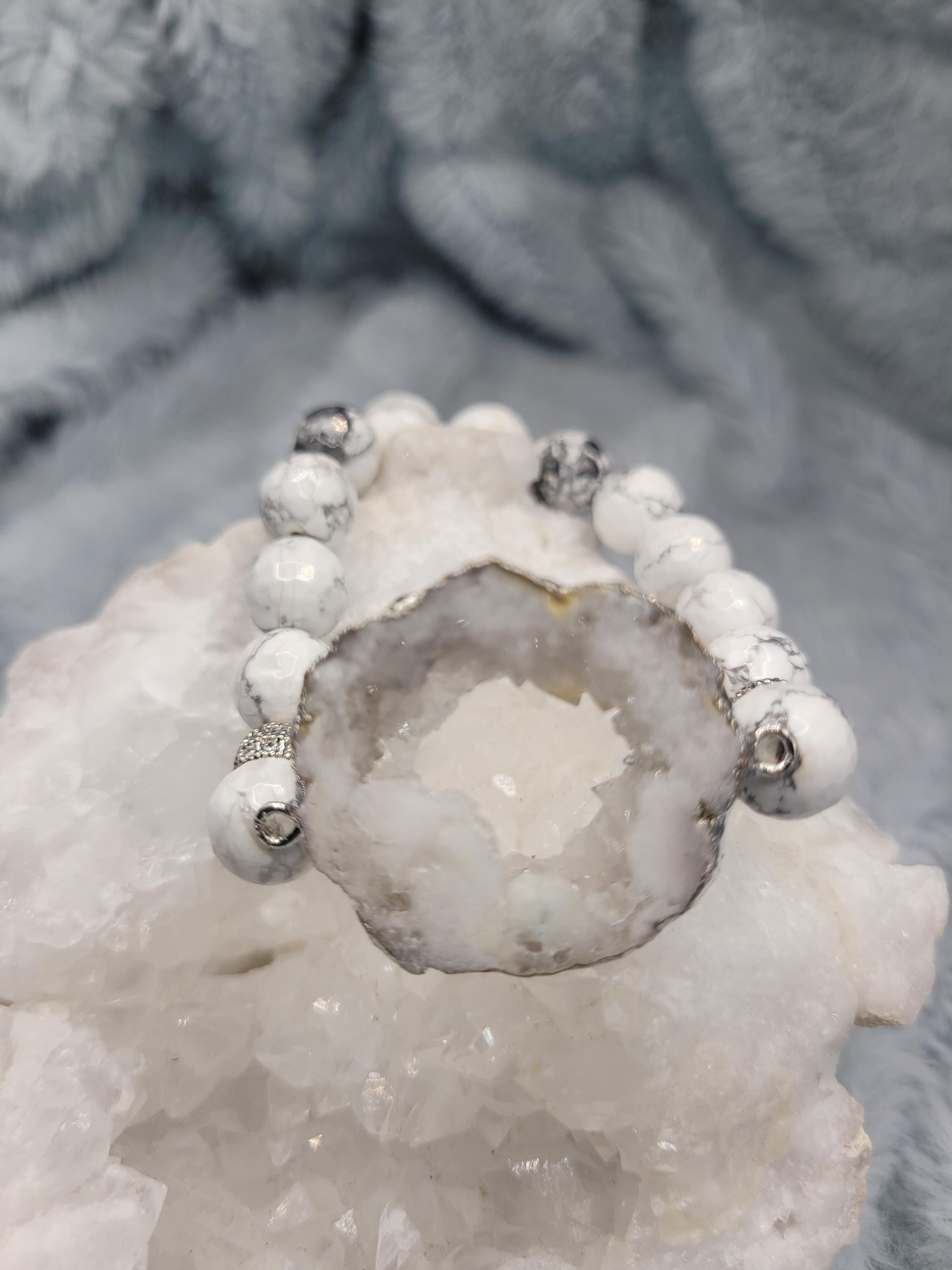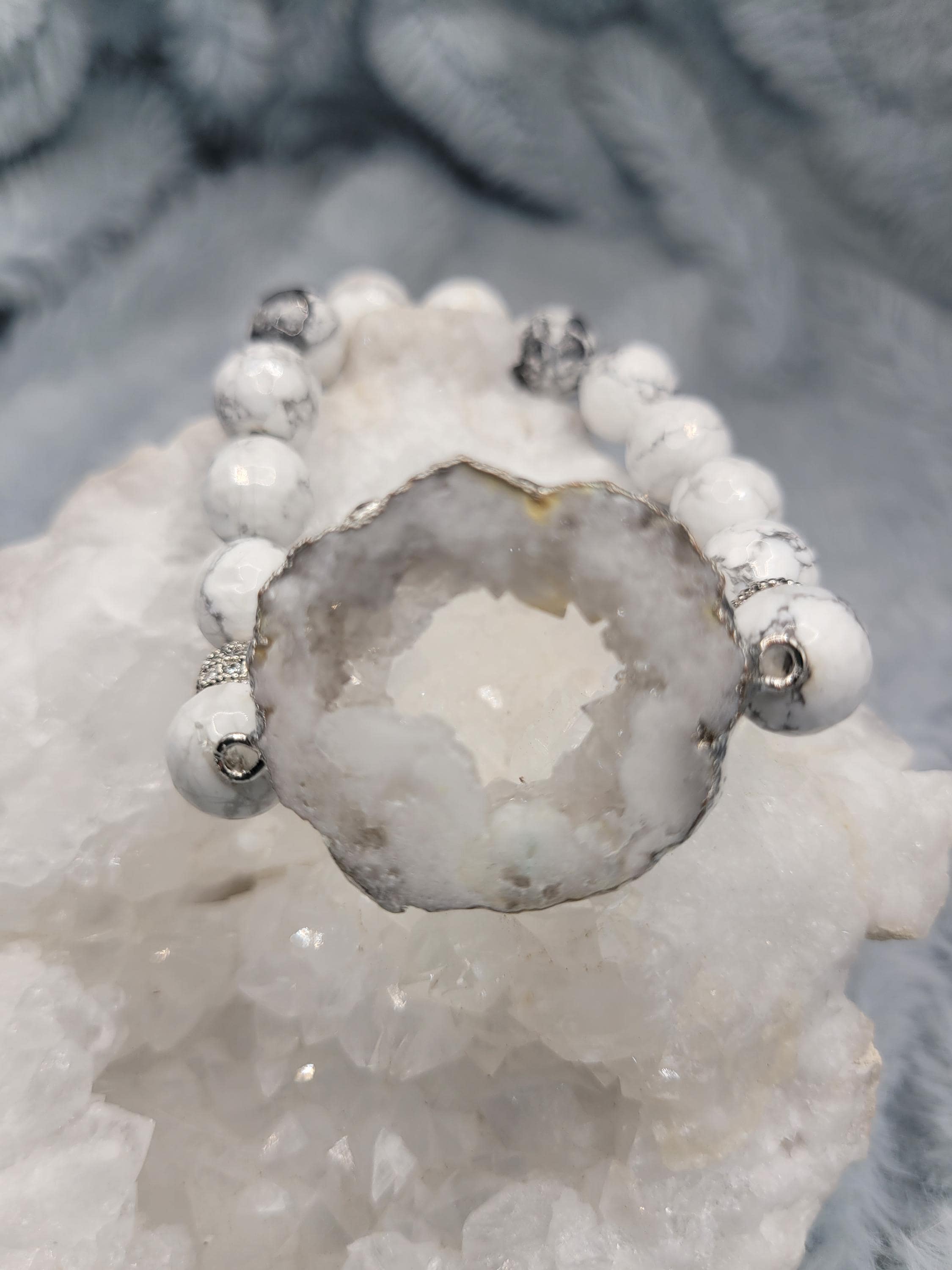 Energetically CALMING faceted howlite beads complimenting silver plated druzy quartz focalpiece stretch stacking bracelet