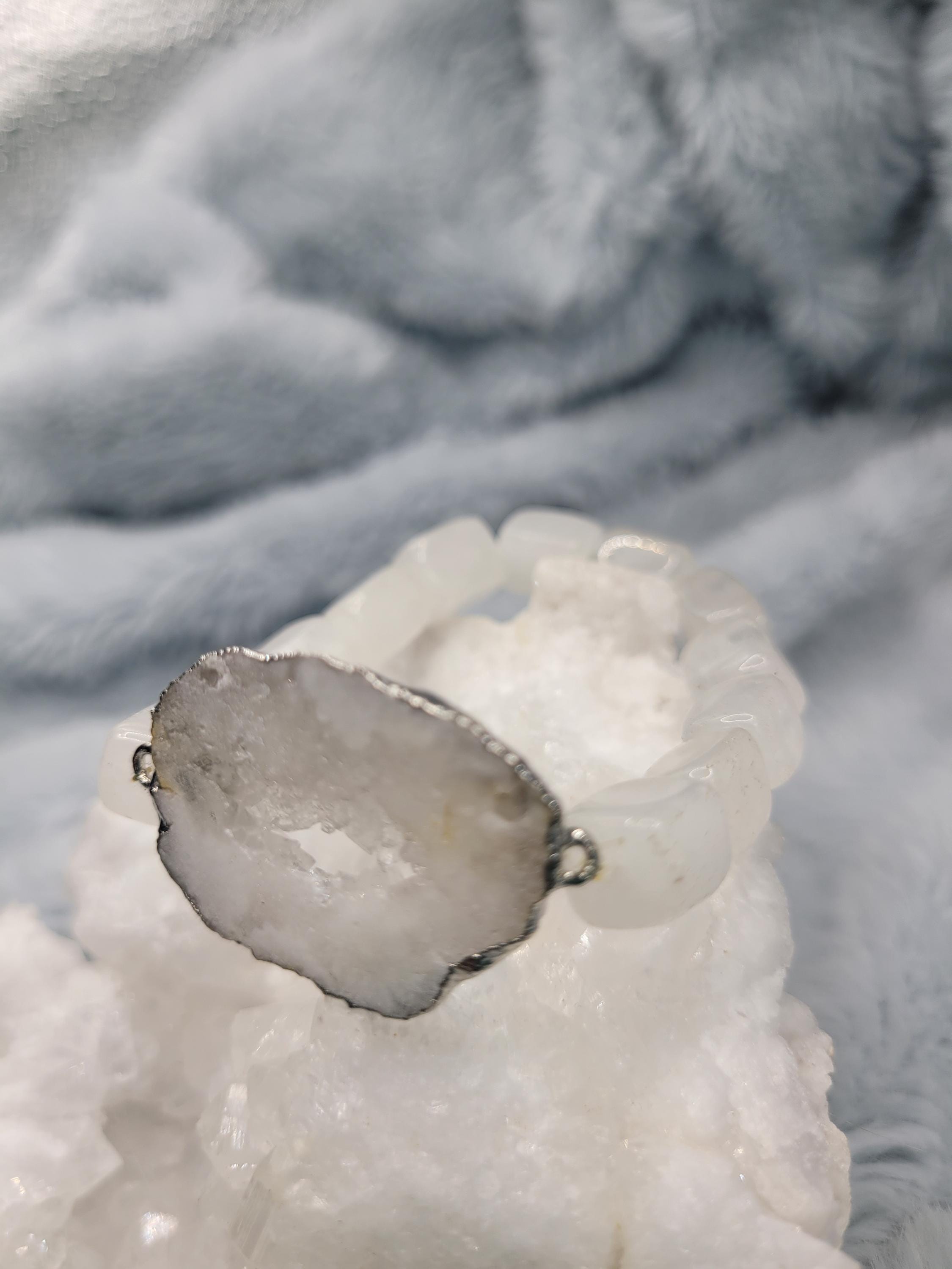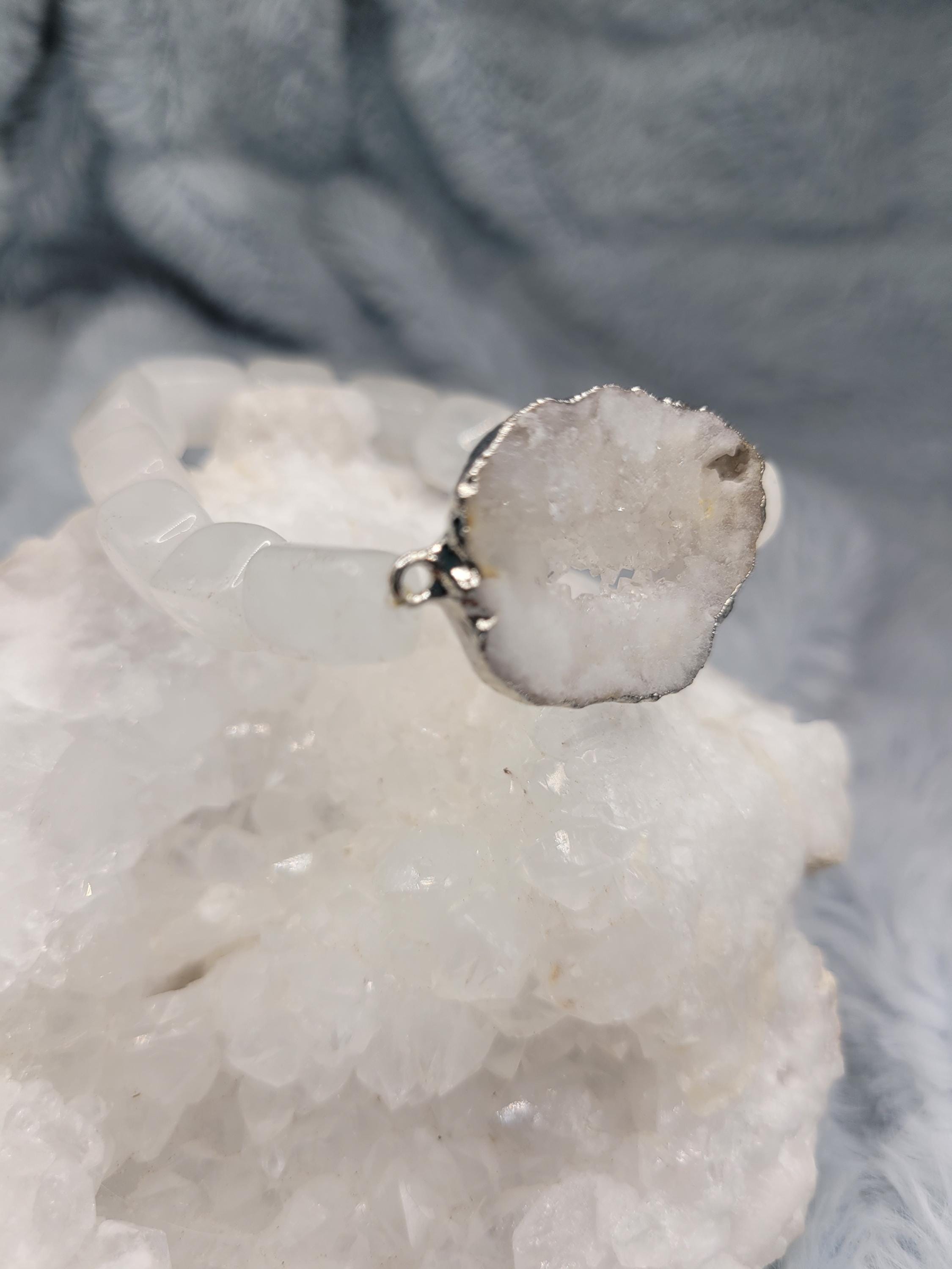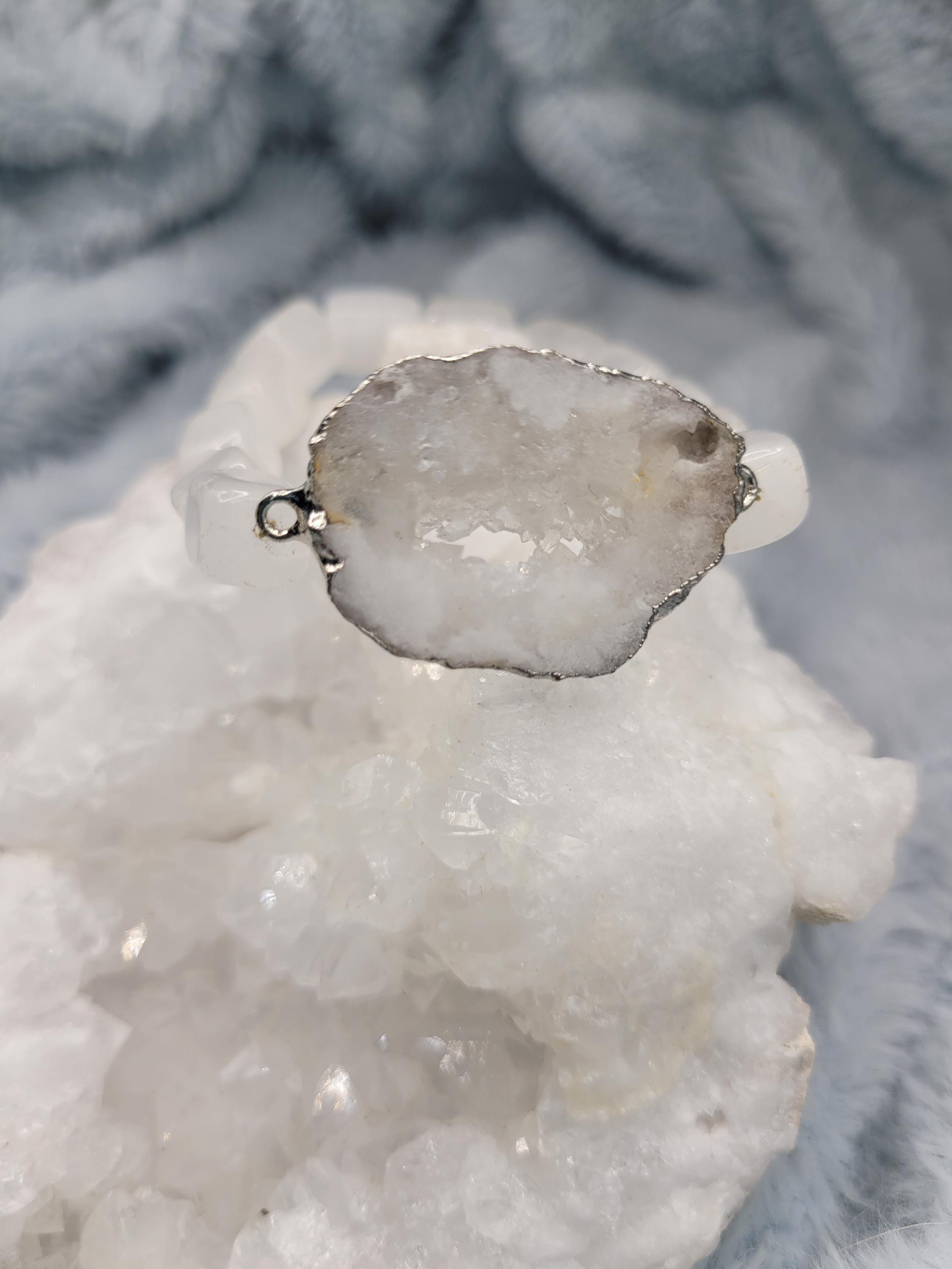 Energetically HEALING bracelet designed with natural quartz rectangle tube beads complimenting silver plated druzy quartz focal piece.