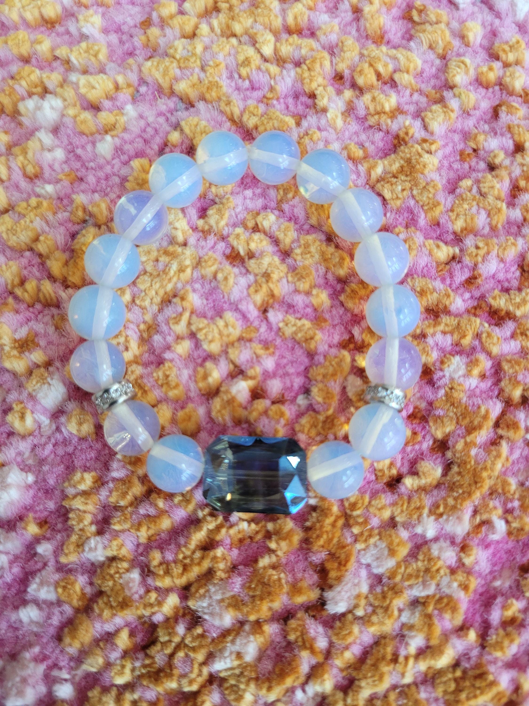 Energetically ELEVATING bracelet designed with natural 10 mm opal glass beads complimenting blue rectangle faceted crystal focal bead.