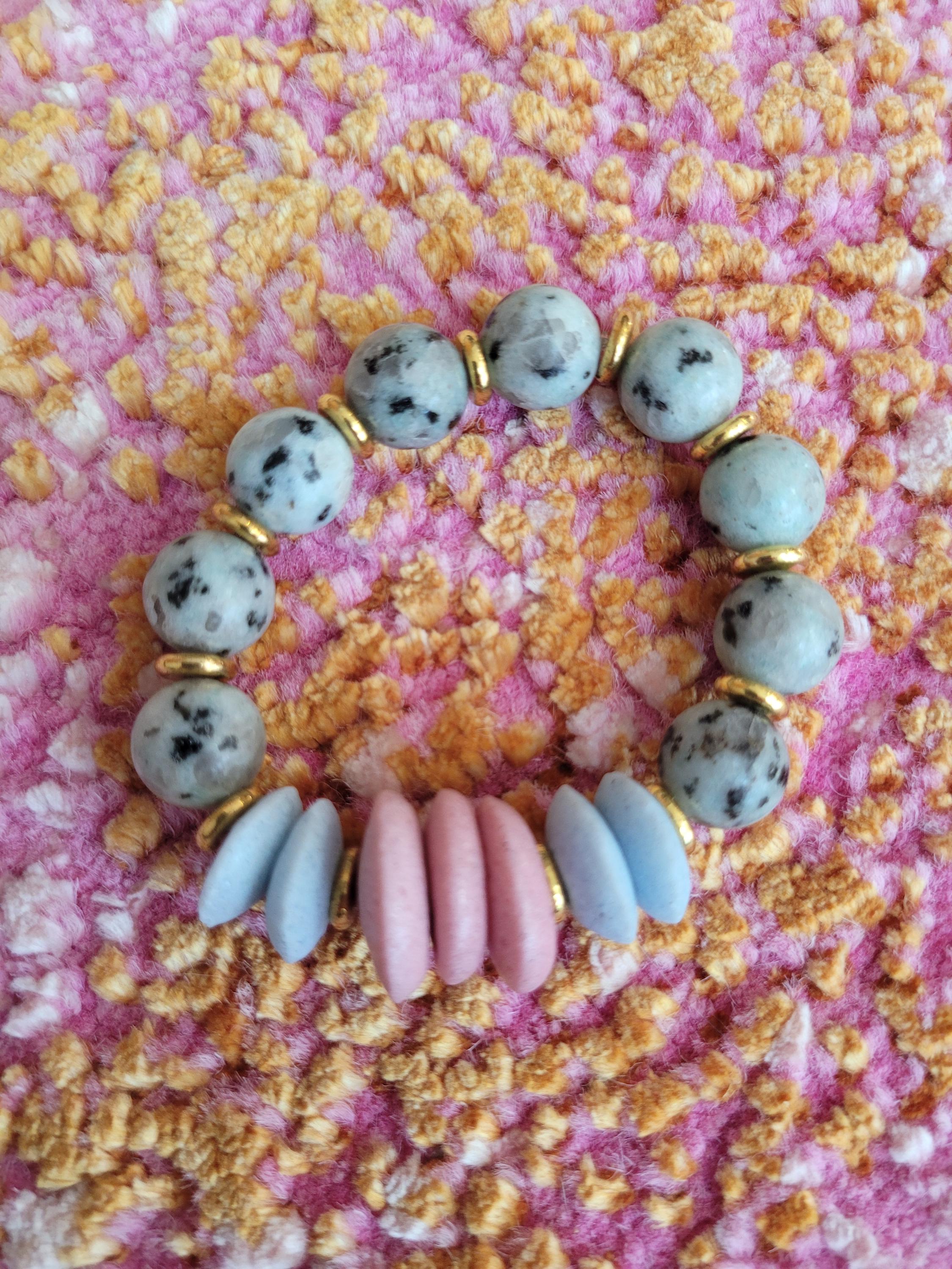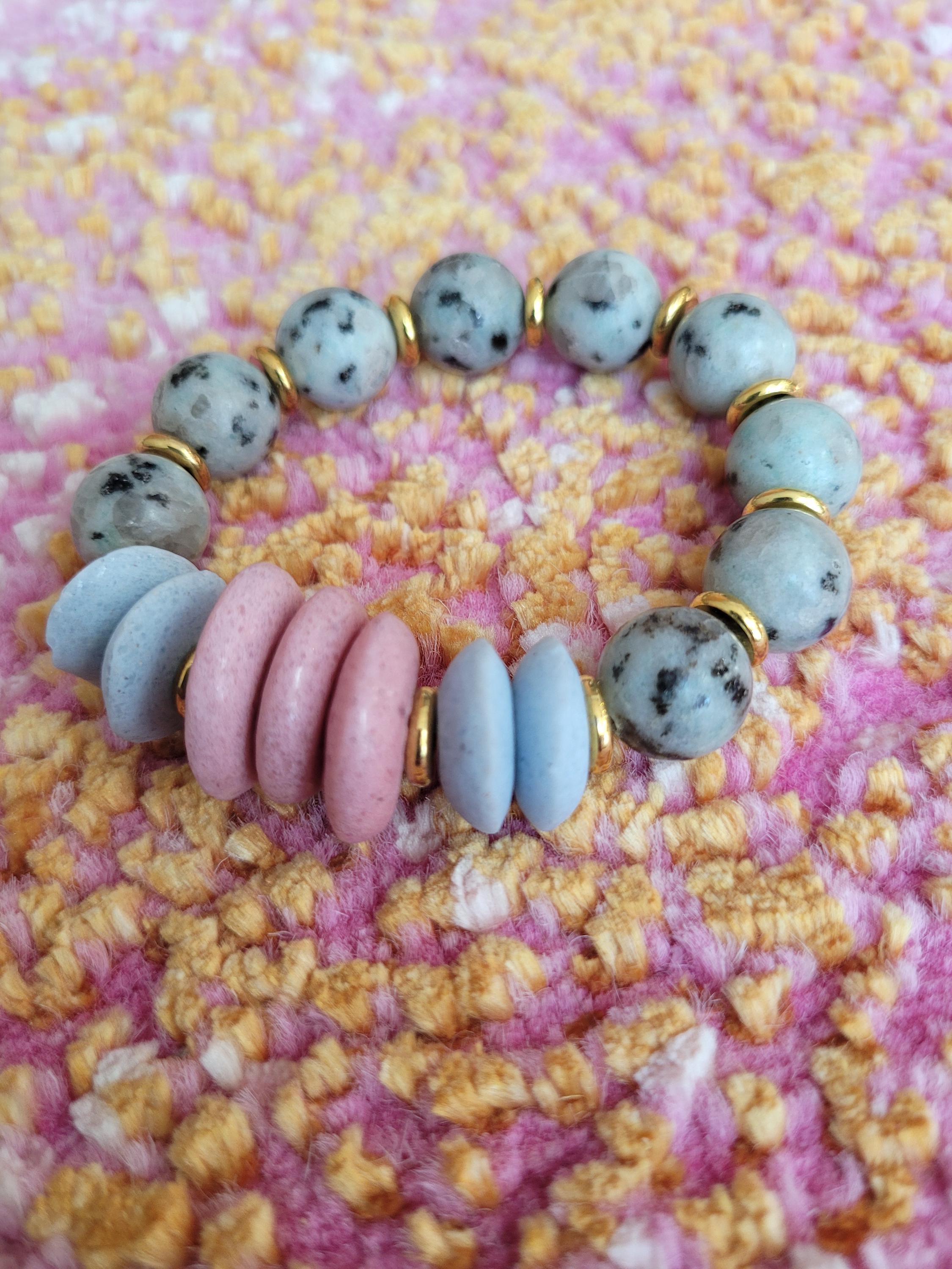 Energetically GROUNDING bracelet designed with natural 12 mm sesame/kiwi jasper beads with pale blue and pink glass ashanti saucer beads stretch stacking bracelet.