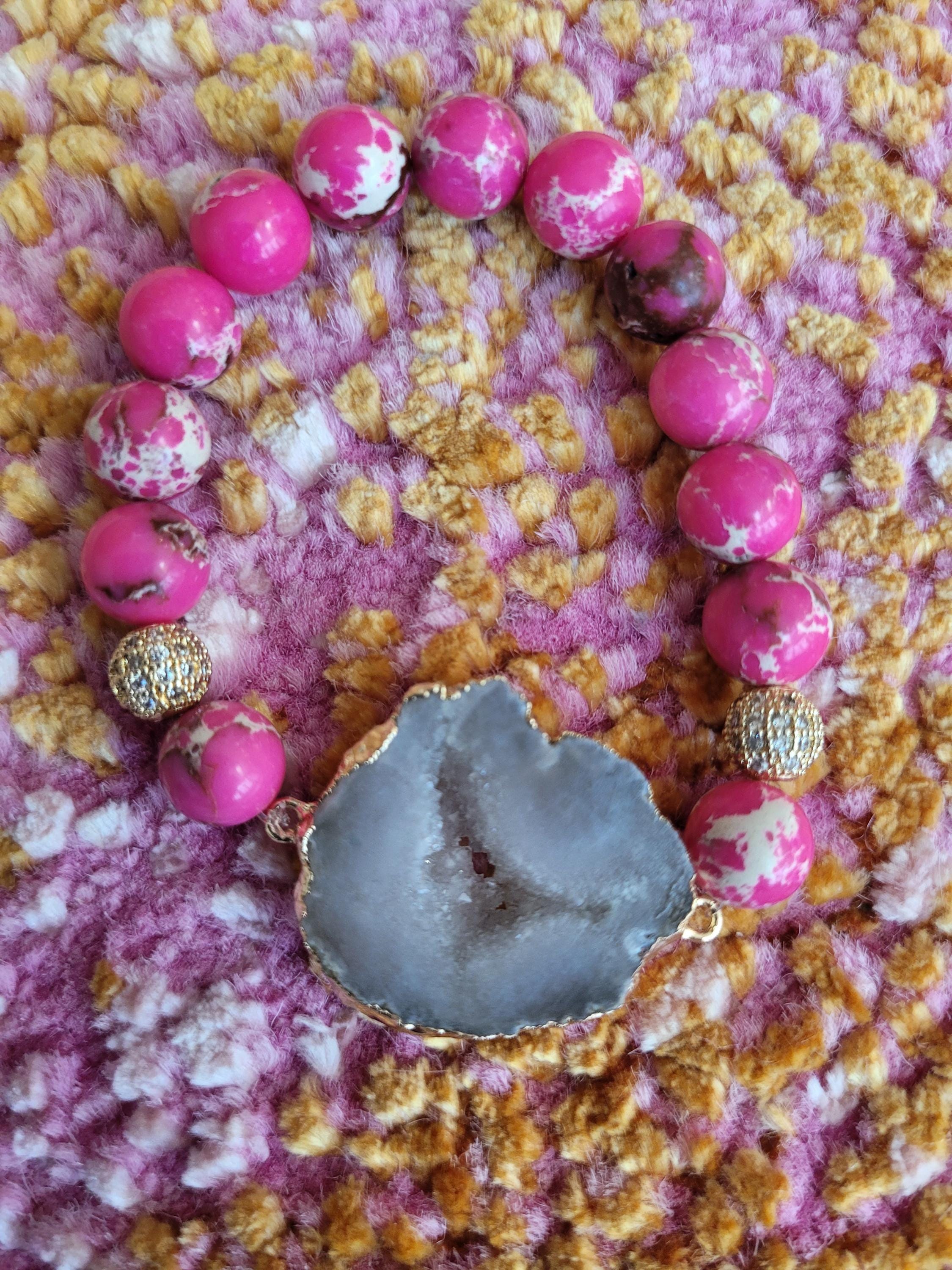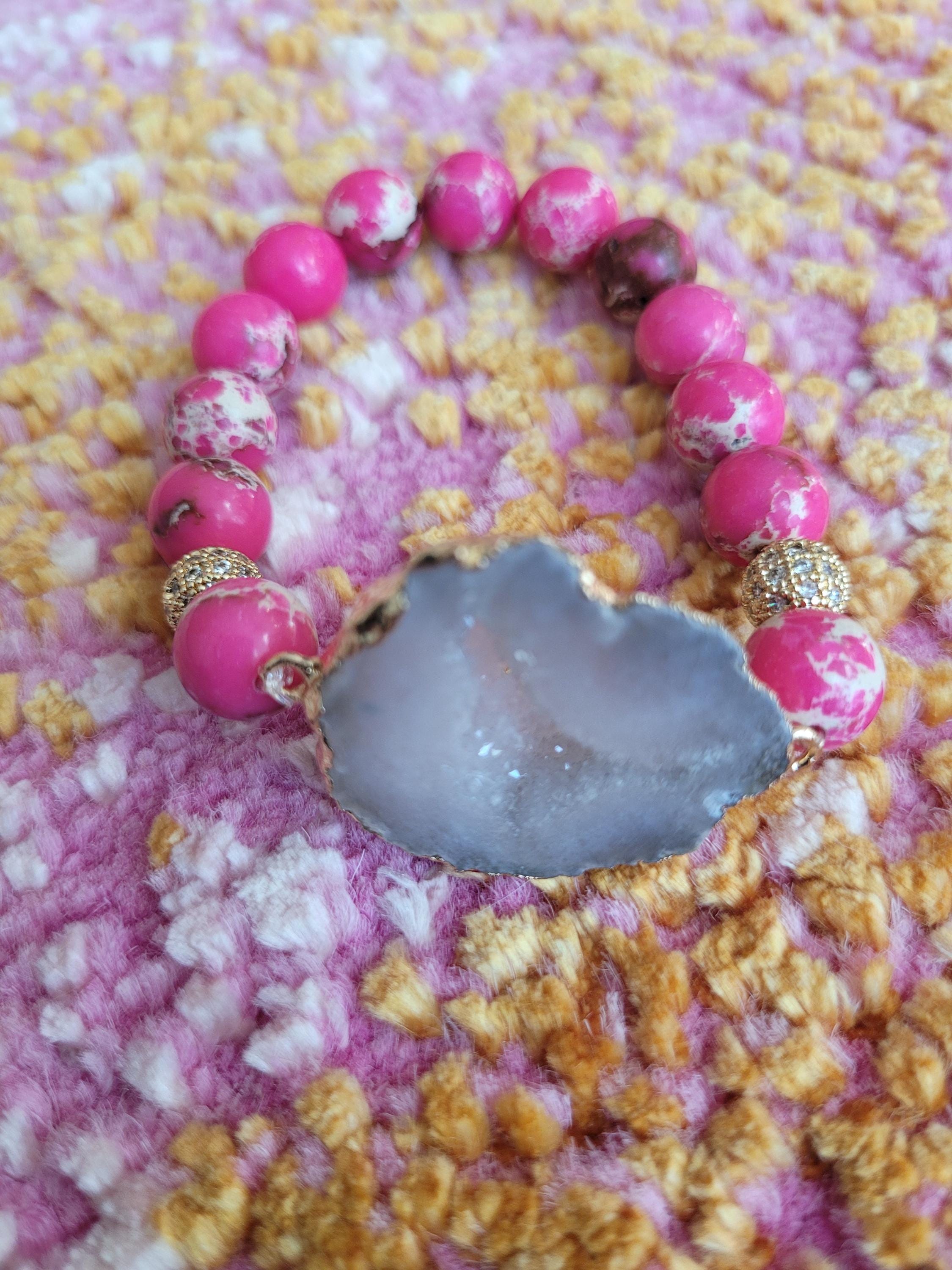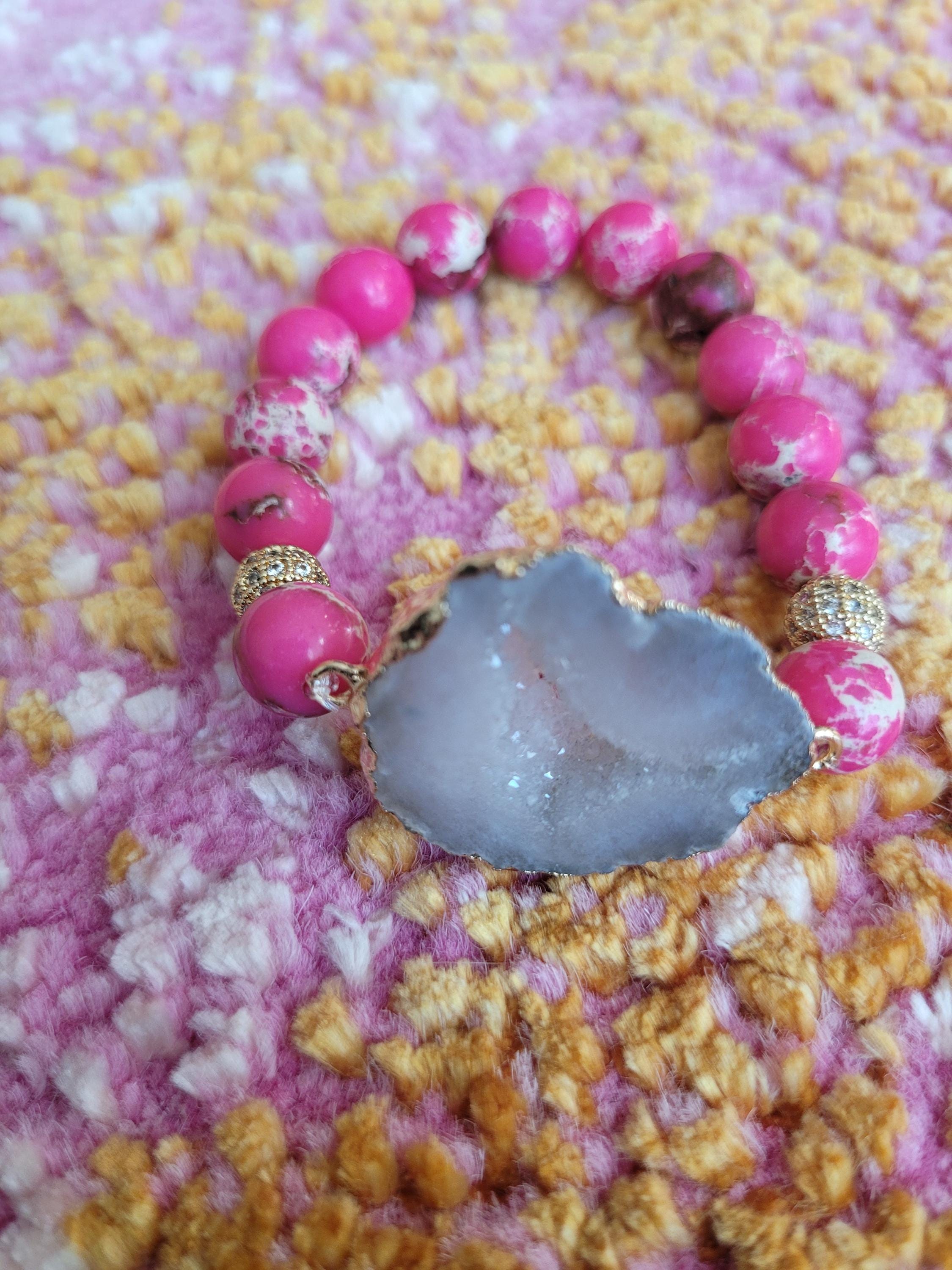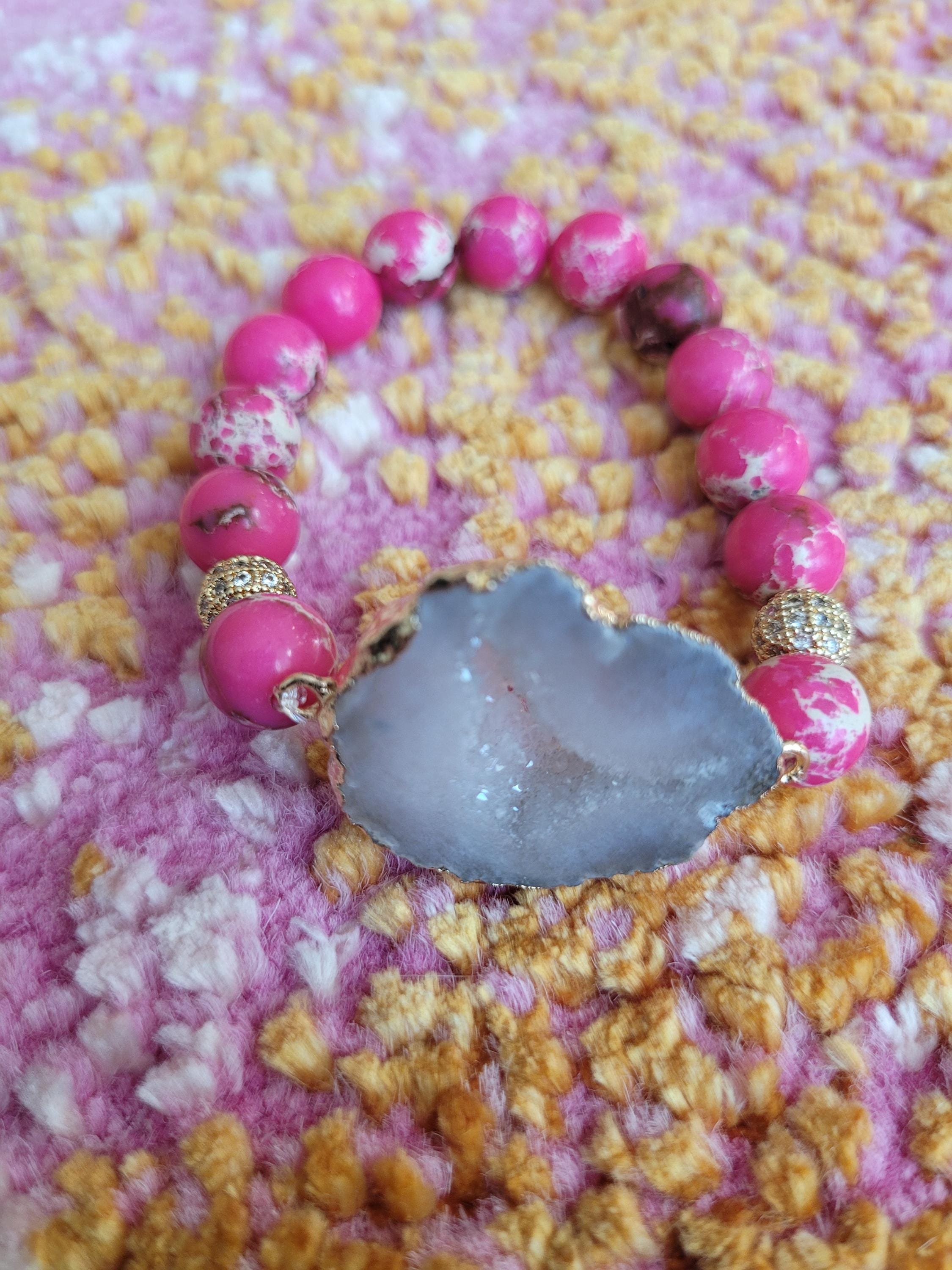 Energetically INSPIRING bracelet designed with natural 10 mm smooth imperial jasper and cz gold plated round spacer beads complimenting gold plated druzy quartz focal piece.