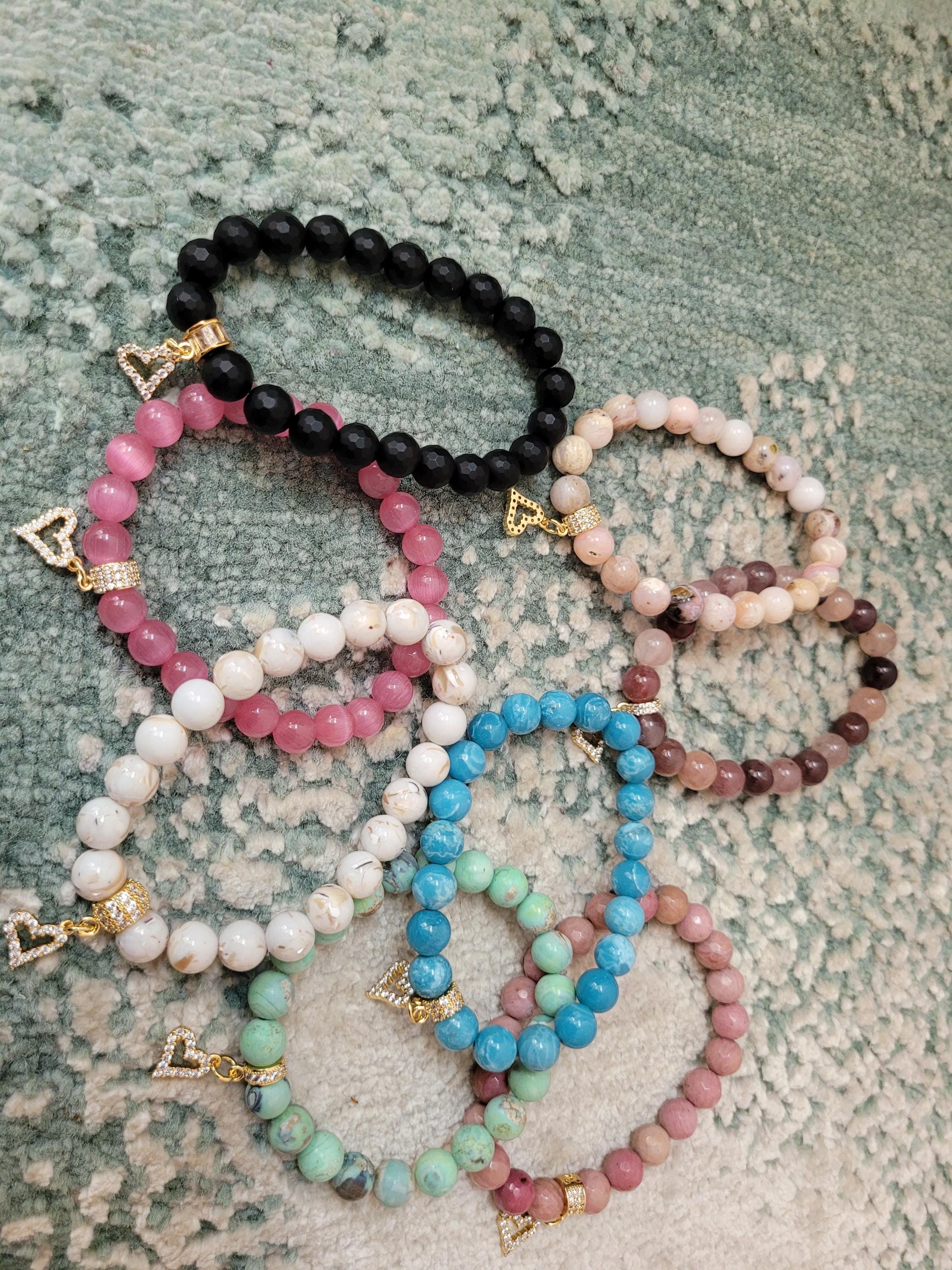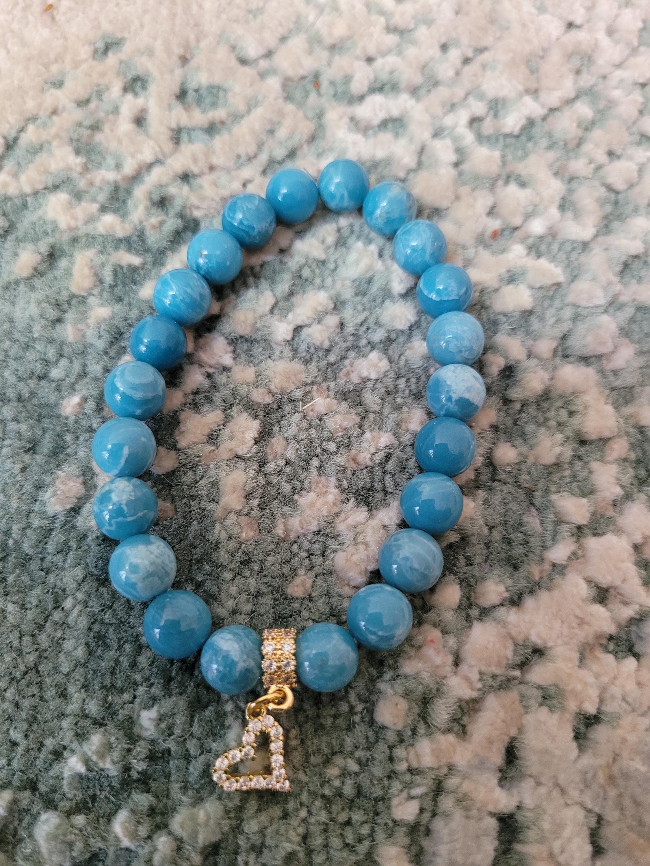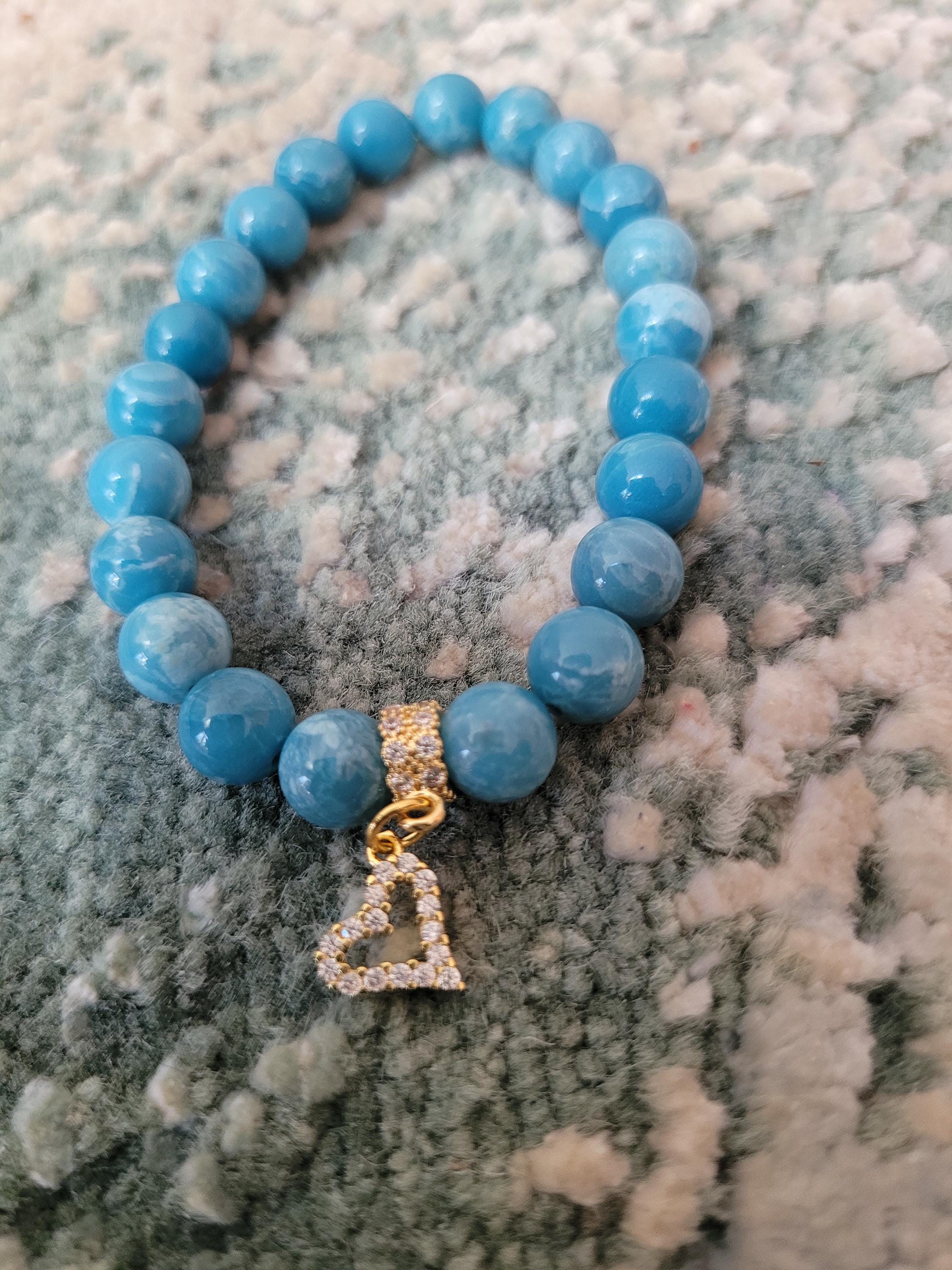 Energetically CALMING bracelet designed with natural 8 mm larimar beads complimenting cz paved gold plated heart charm and spacer bead.