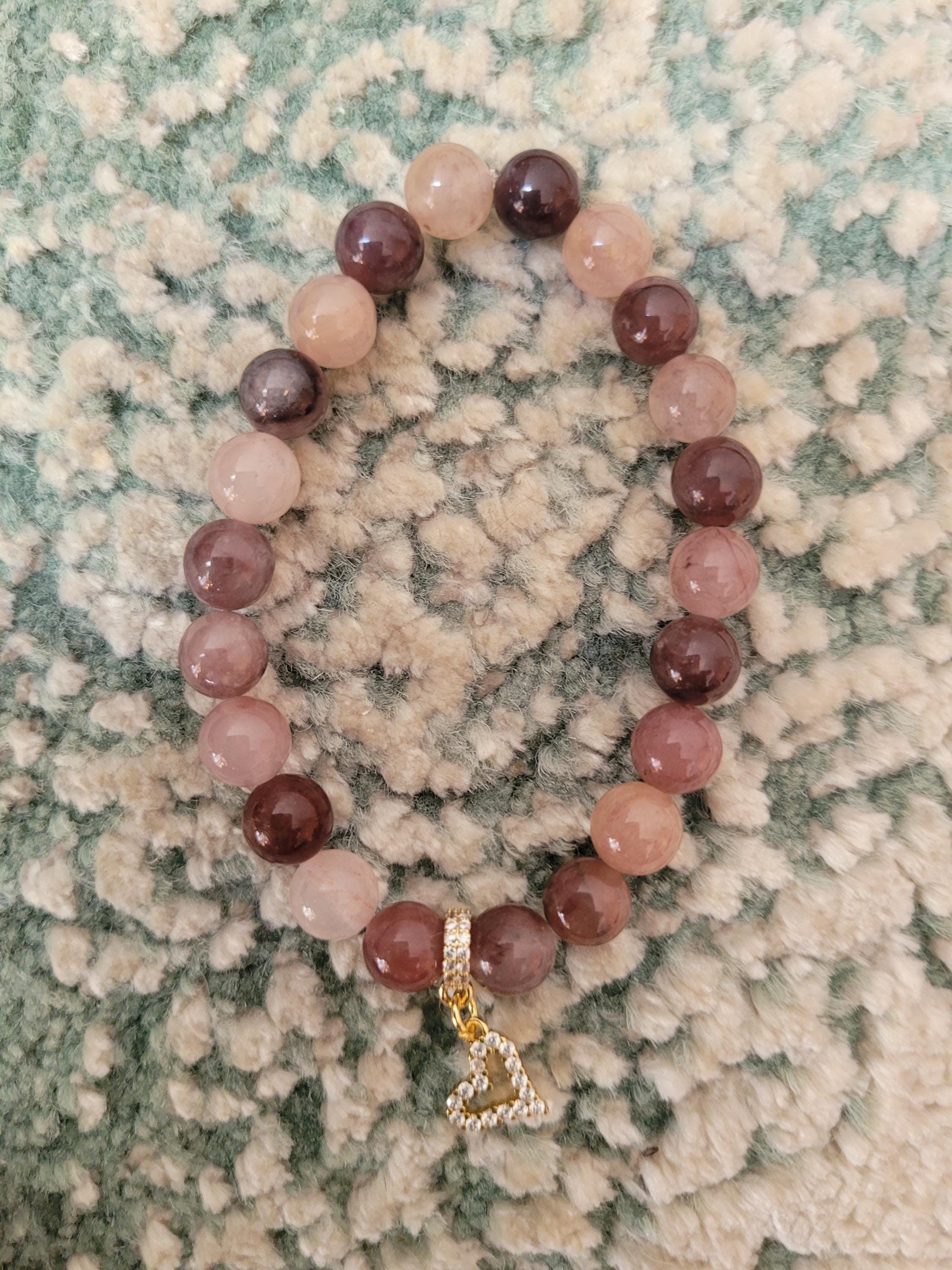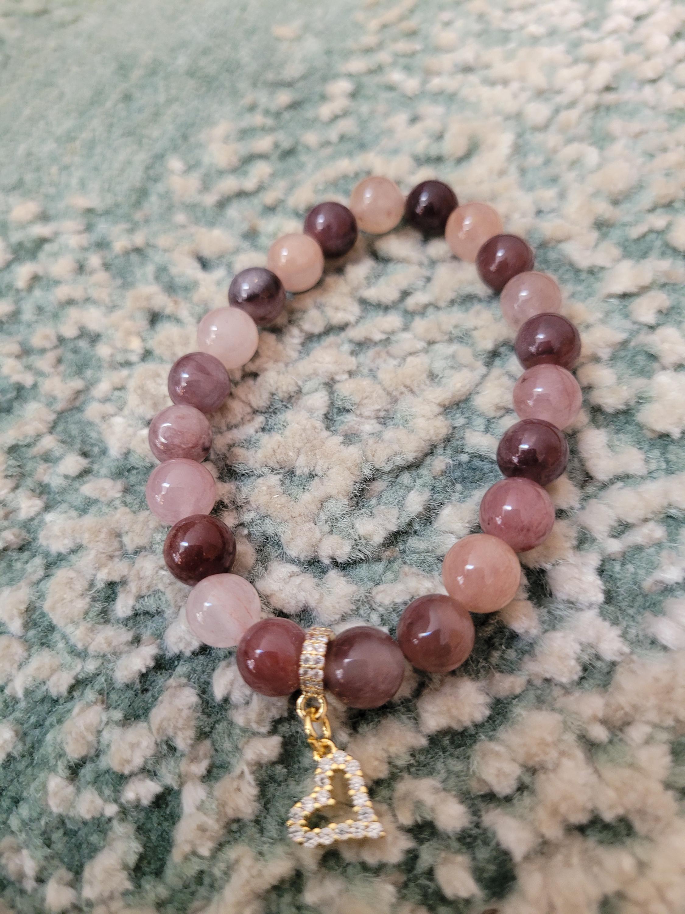 Energetically ELEVATING bracelet designed with natural 8 mm purple berry quartz beads complimenting cz paved gold plated heart charm and spacer bead.