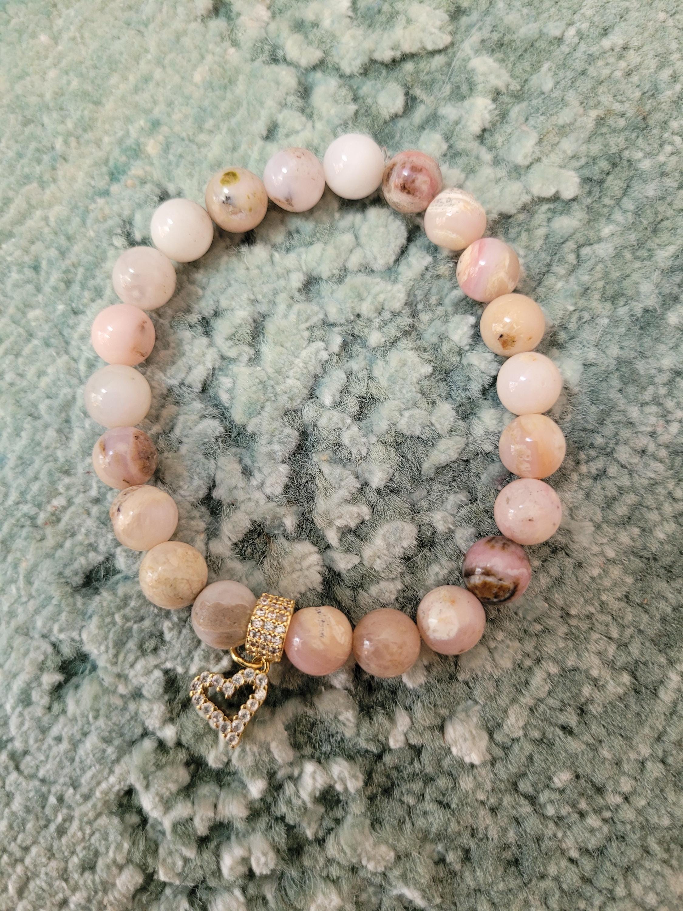 Energetically INSPIRING bracelet designed with natural 8 mm peach sunstone beads complimenting cz paved gold plated heart charm and spacer bead.