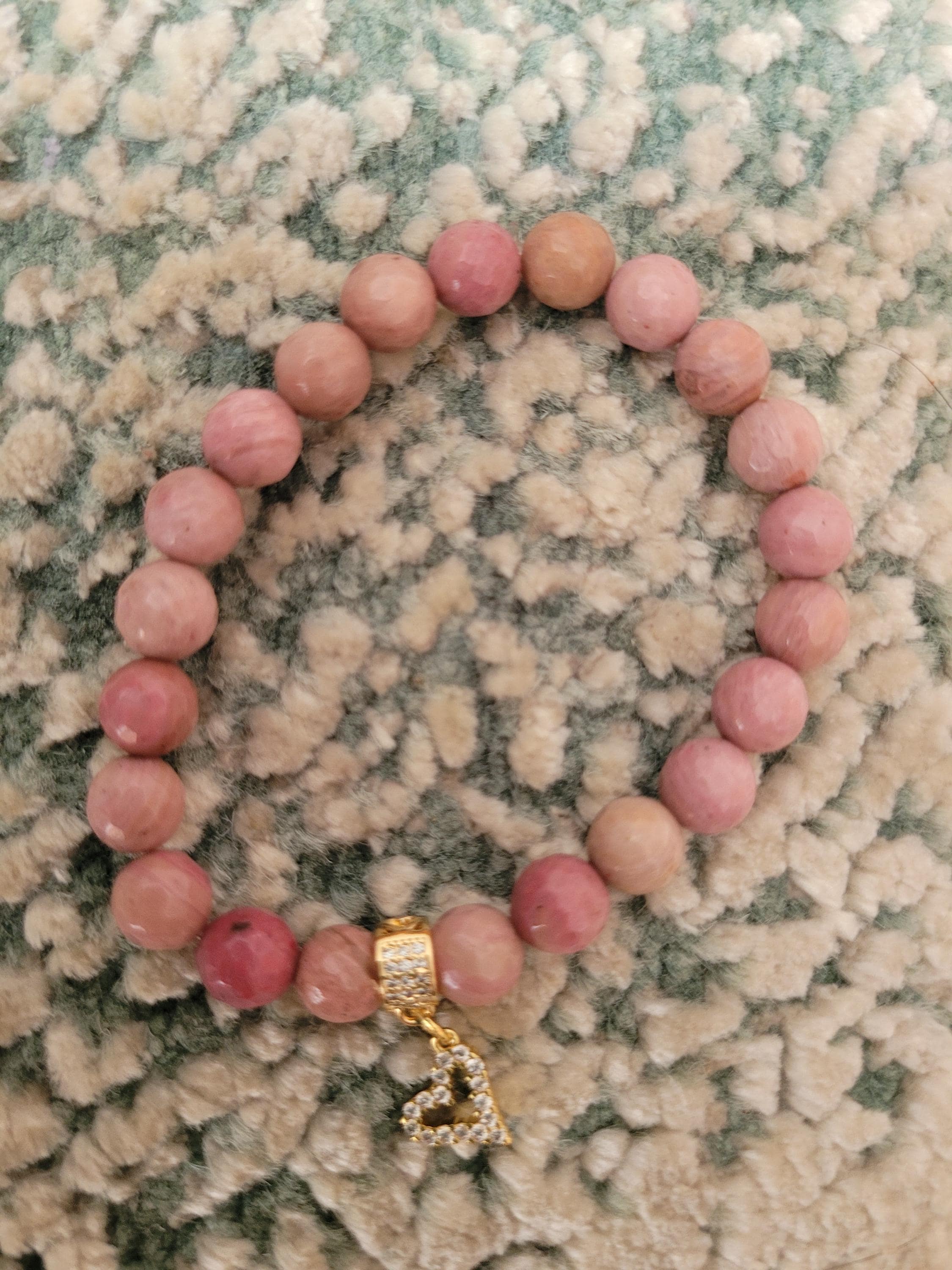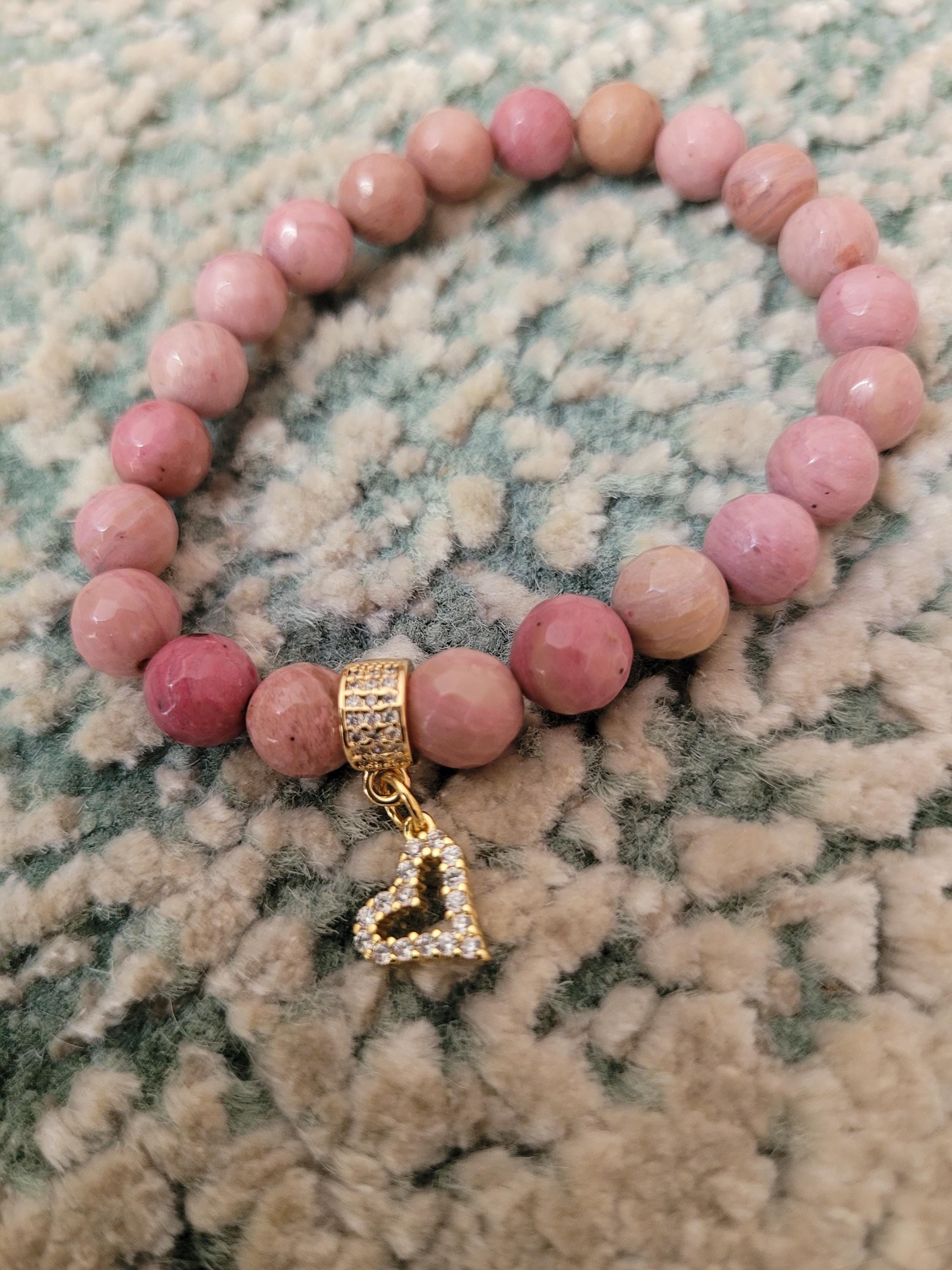 Energetically LOVING bracelet designed with natural 8 mm faceted rhodochrosite beads complimenting cz paved gold plated heart charm and spacer bead.