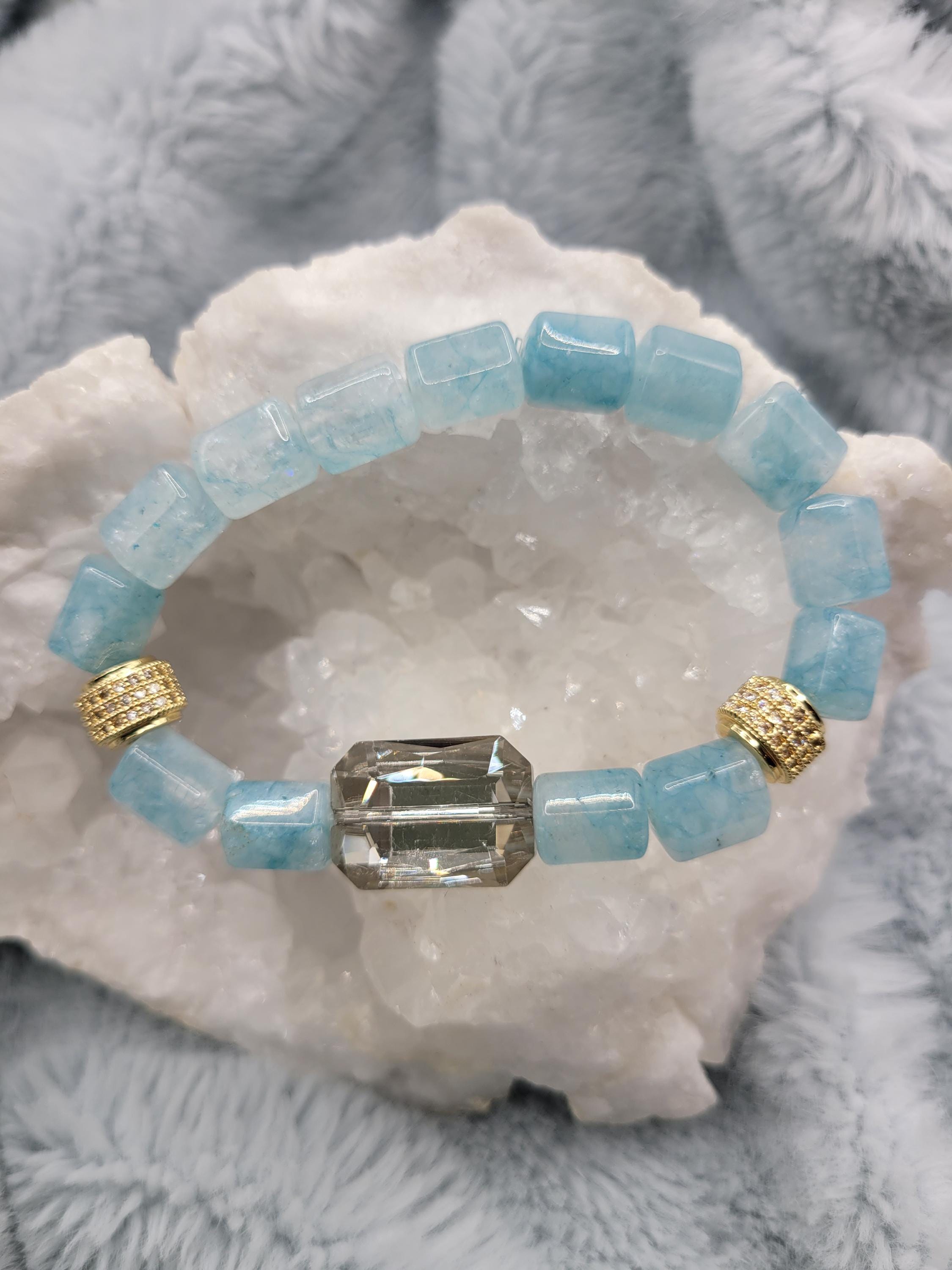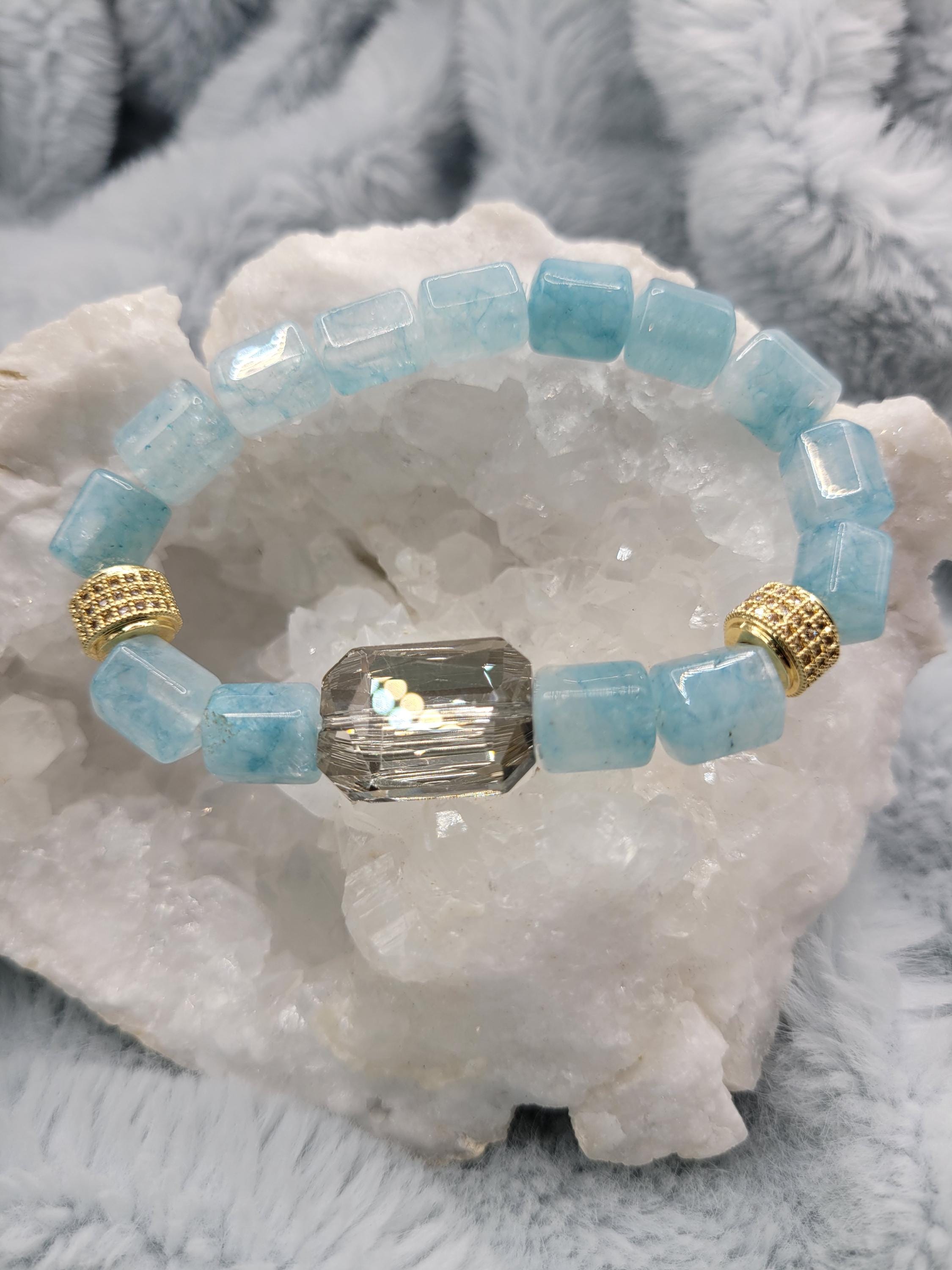 Energetically CALMING bracelet designed with natural 8 x 10mm light blue box cut cube beads complimenting grey rectangle faceted crystal focal bead. Cubic Zirconia paved gold spacer beads stretch stacking bracelet.