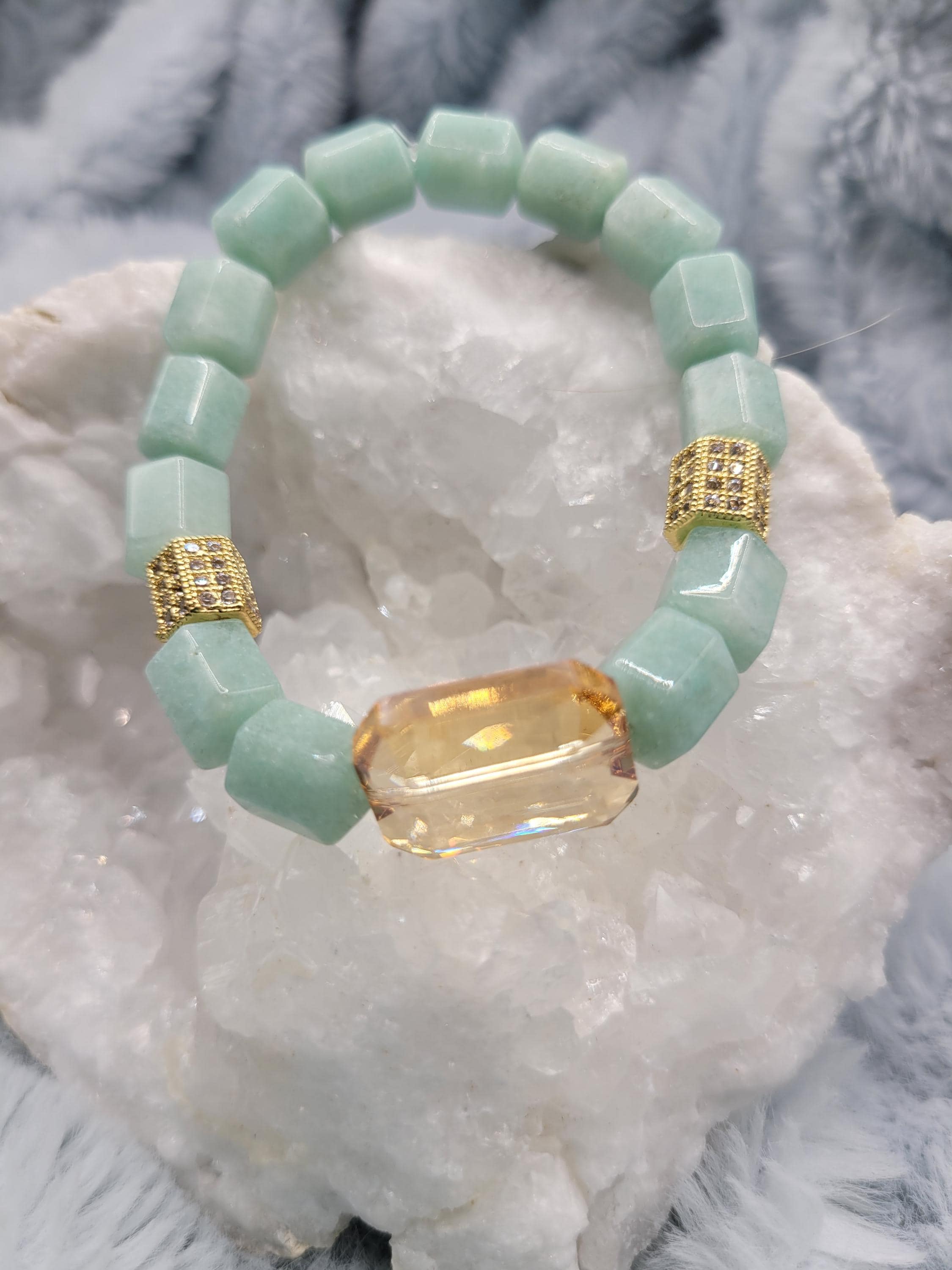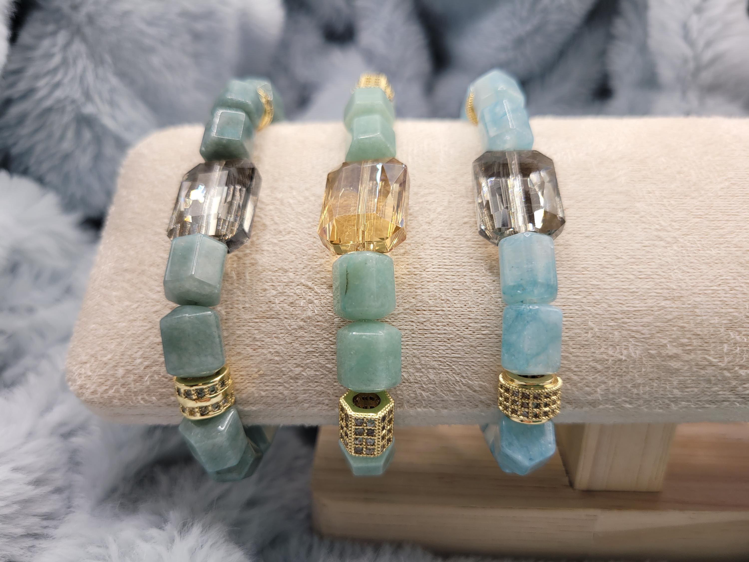 Energetically ENCHANTING aqua Jade box cut cube natural gemstone beads with champagne faceted crystal focalbead stretch stacking bracelet