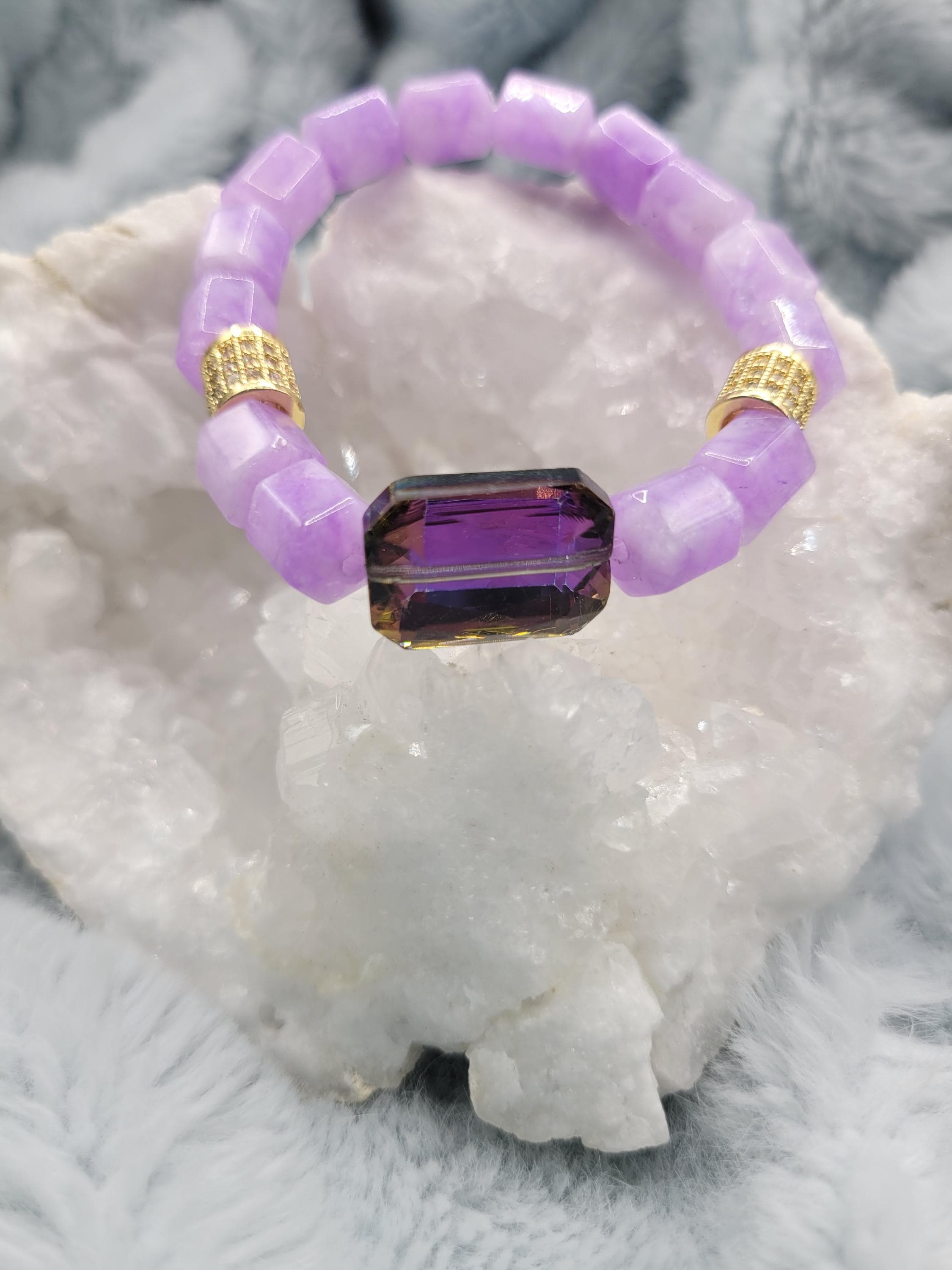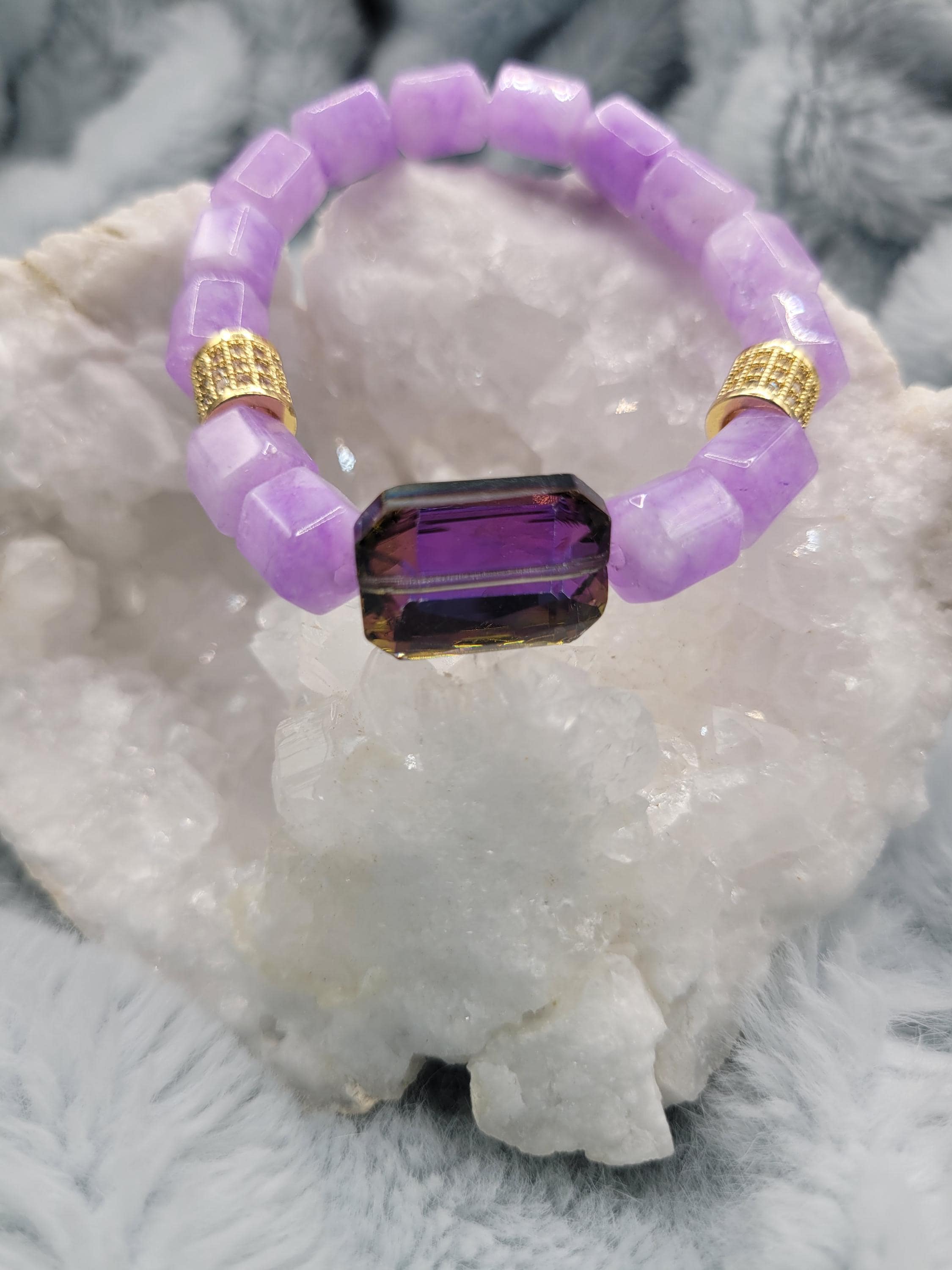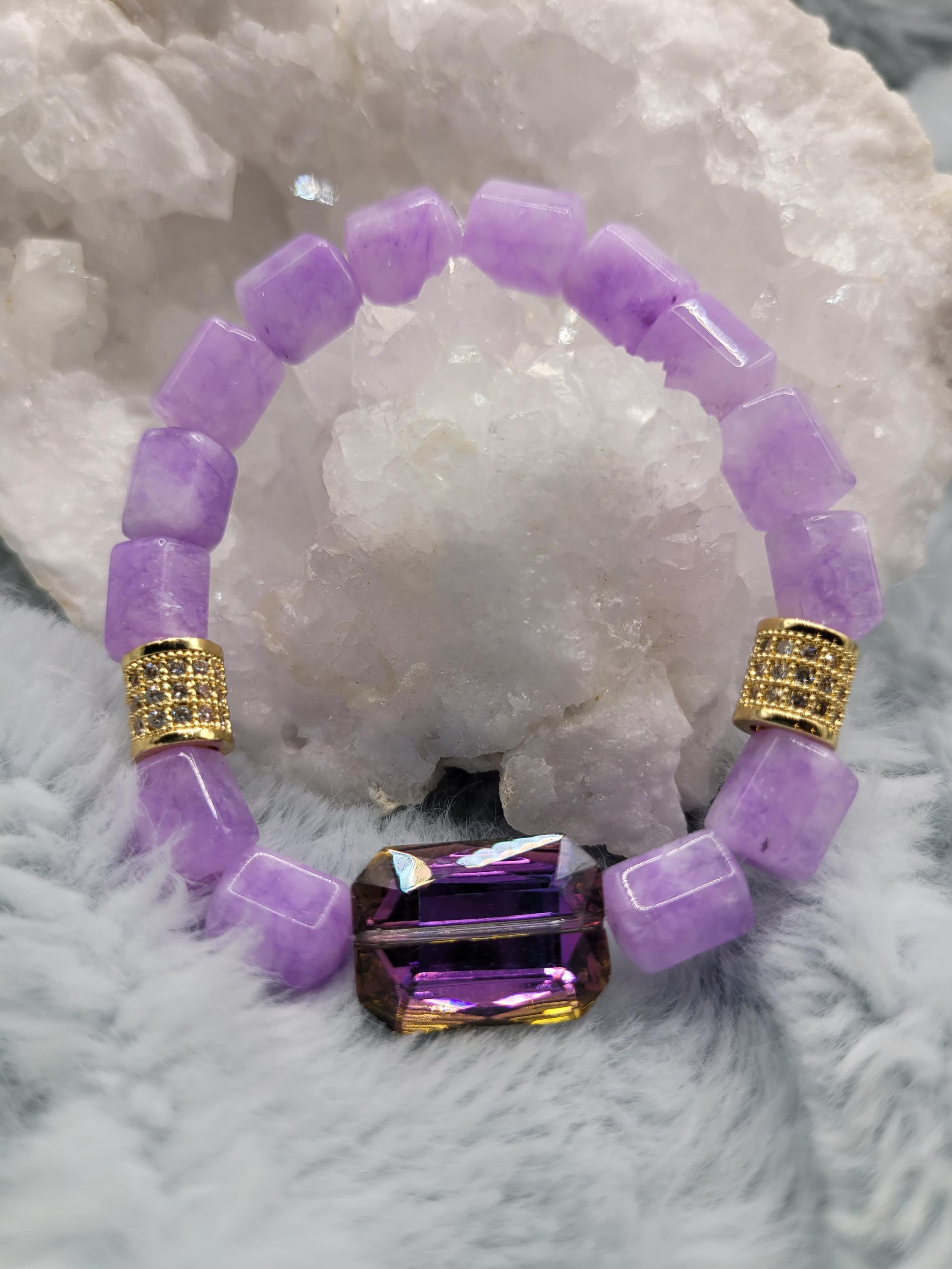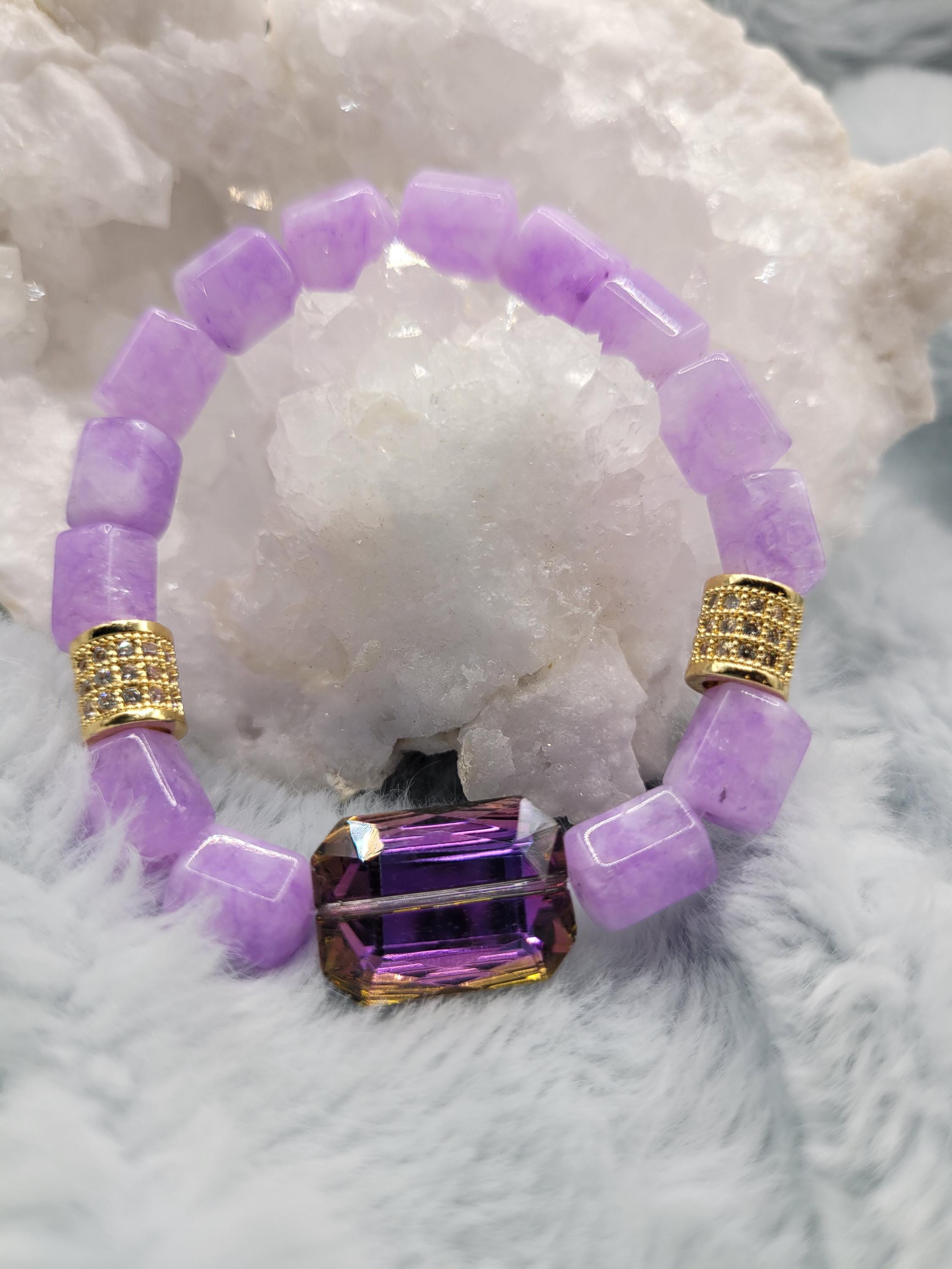 Energetically INSPIRING bracelet designed with natural 8 x 10mm purple box cut cube beads complimenting purple rectangle faceted crystal focal bead. Cubic Zirconia paved gold spacer beads stretch stacking bracelet.