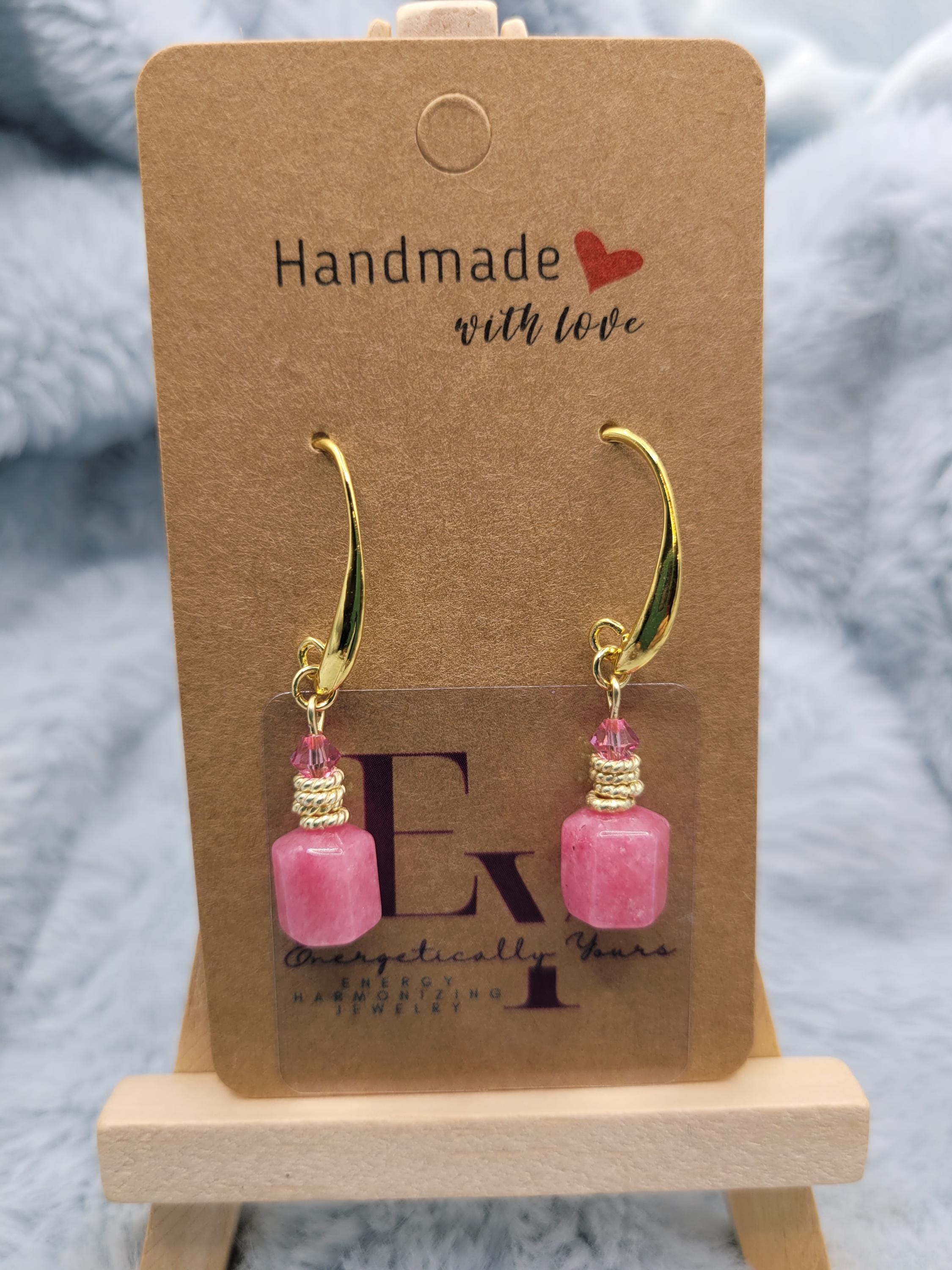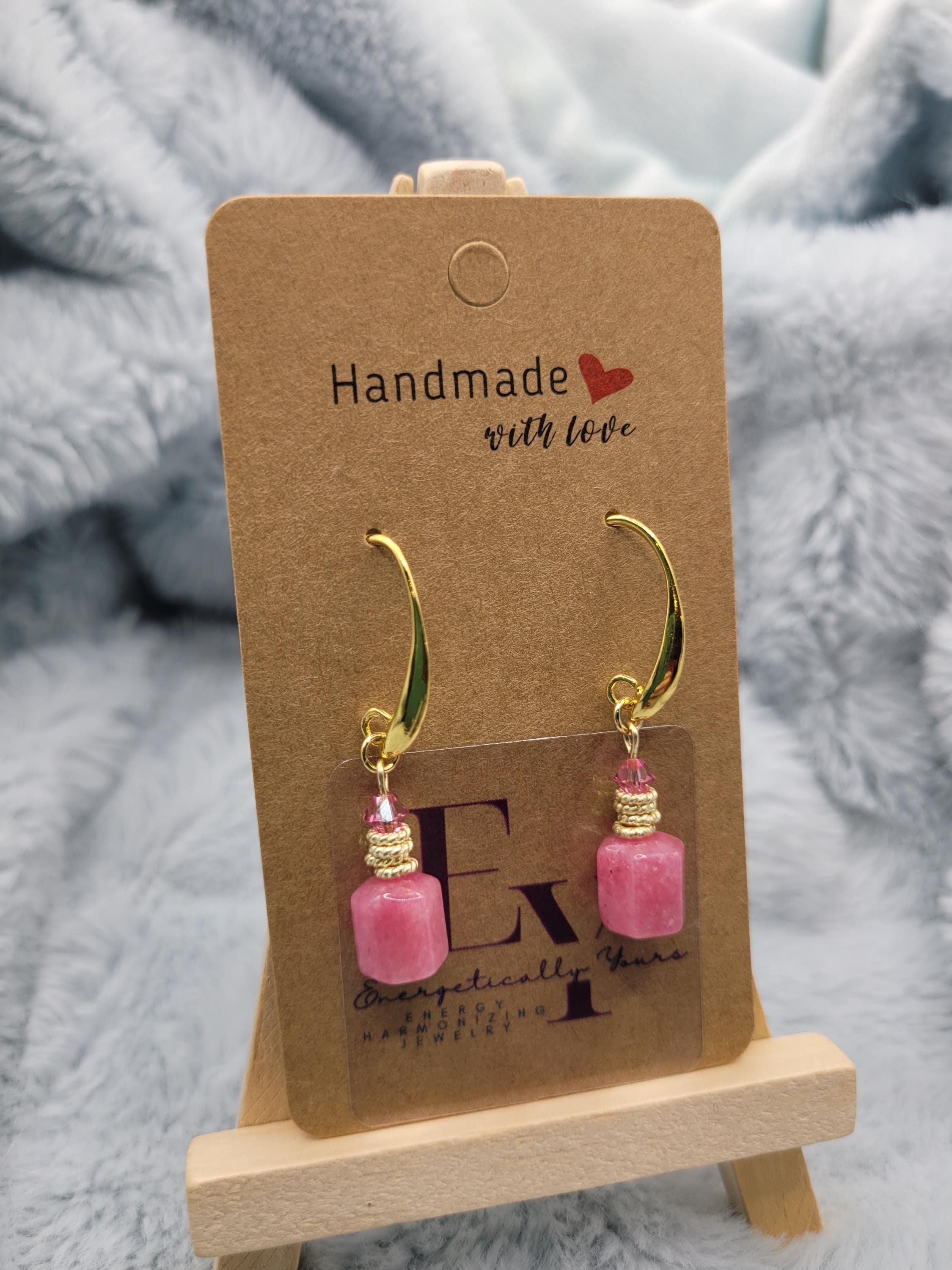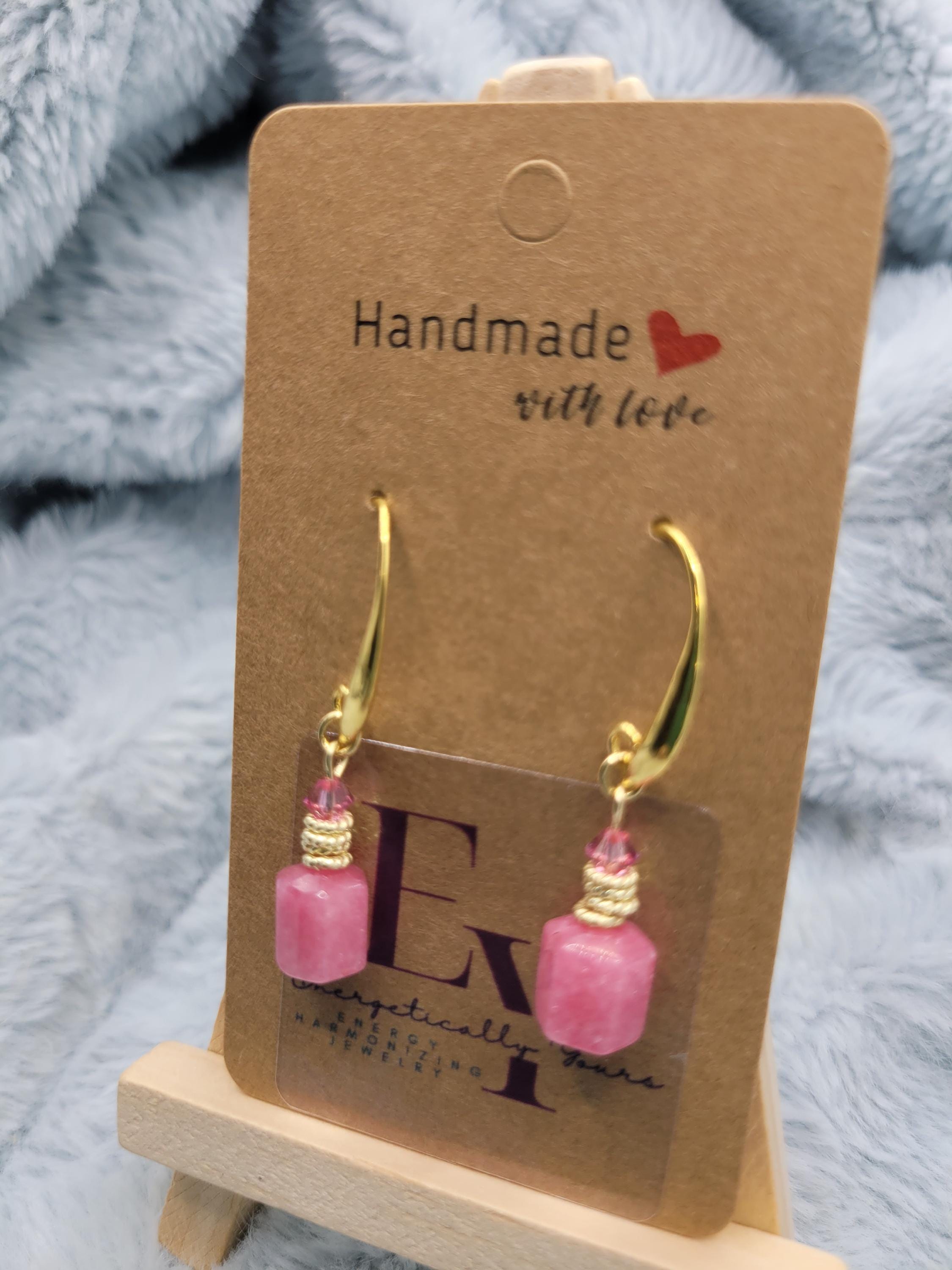 Energetically HARMONIZING pink Jade box cut cube beads designed with 4 mm faceted Swarovski crystal beads, 14k gold plated copper rings on 18k gold plated hooks. Earrings for pierced ears.