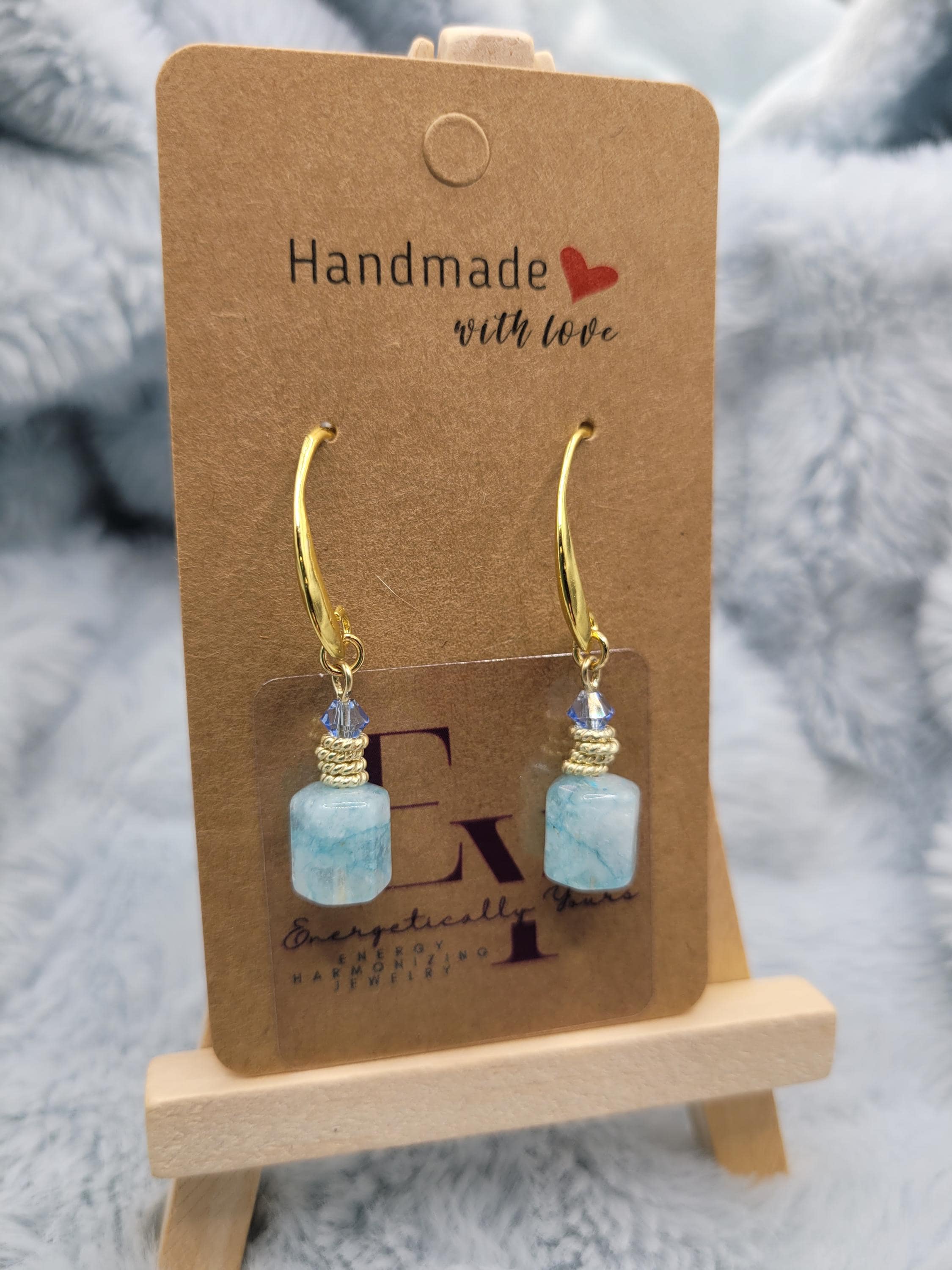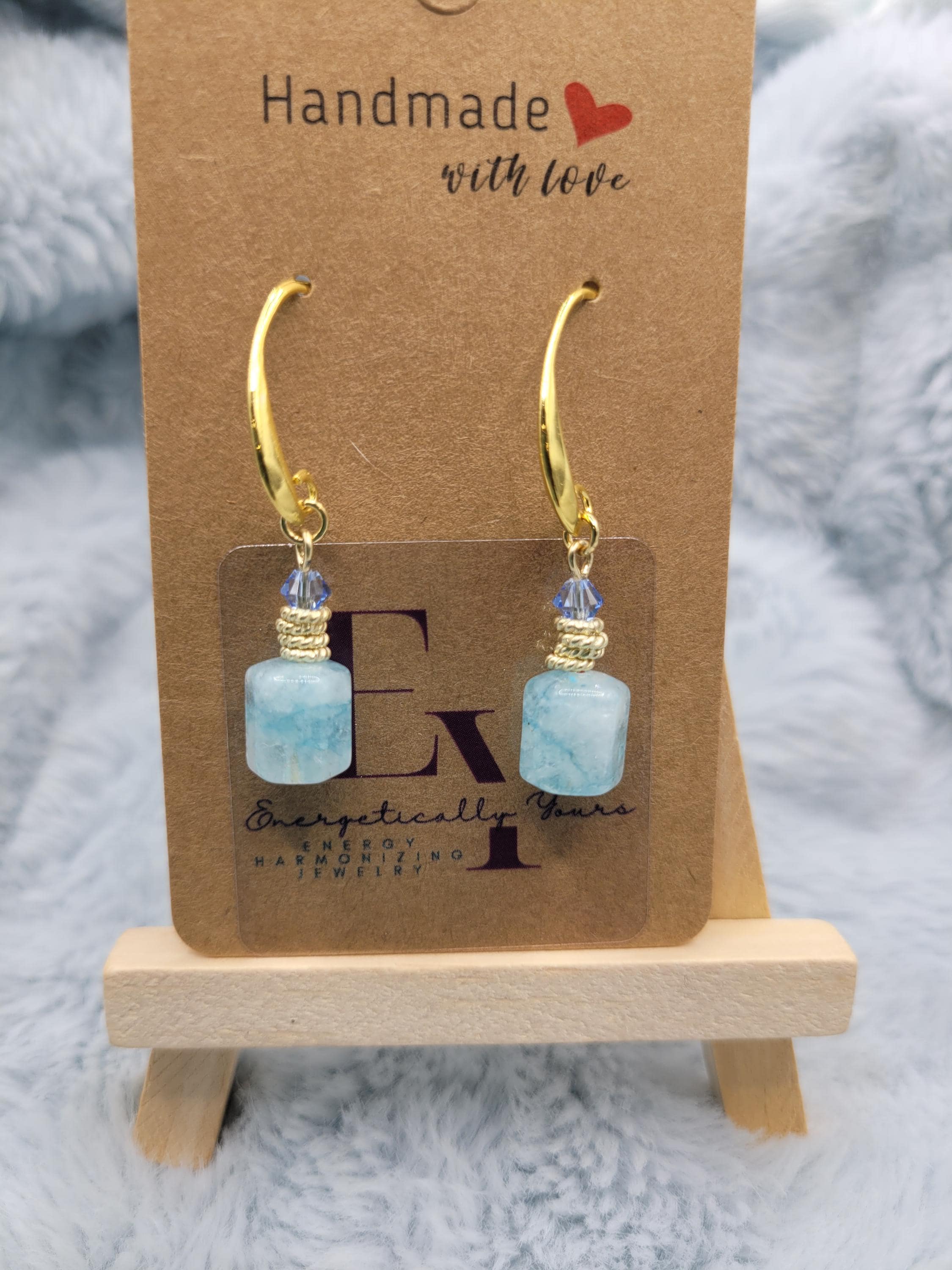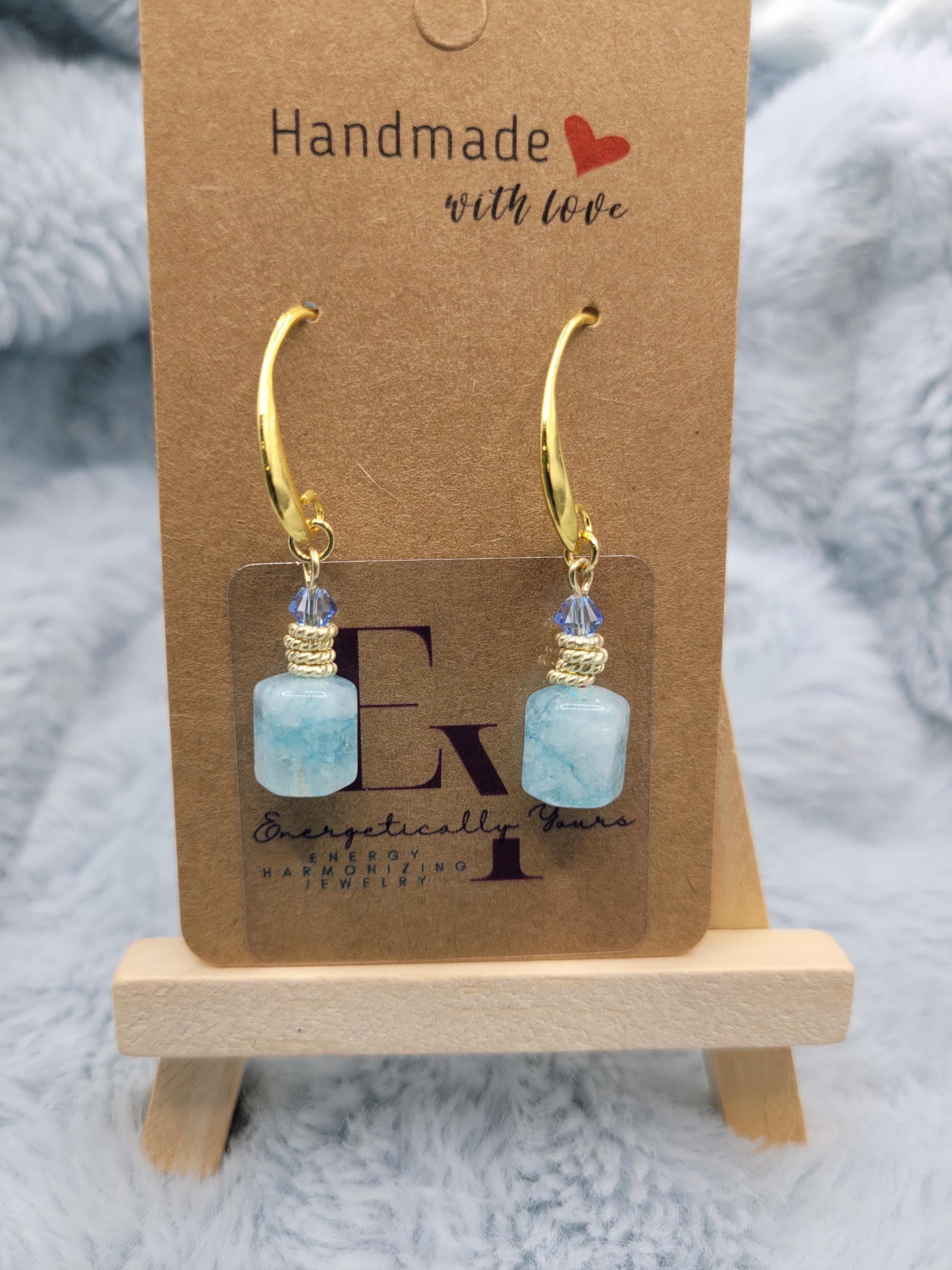 Energetically SOOTHING light blue Jade box cut cube beads designed with 4 mm faceted Swarovski crystal beads, 14k gold plated copper rings on 18k gold plated hooks. Earrings for pierced ears.