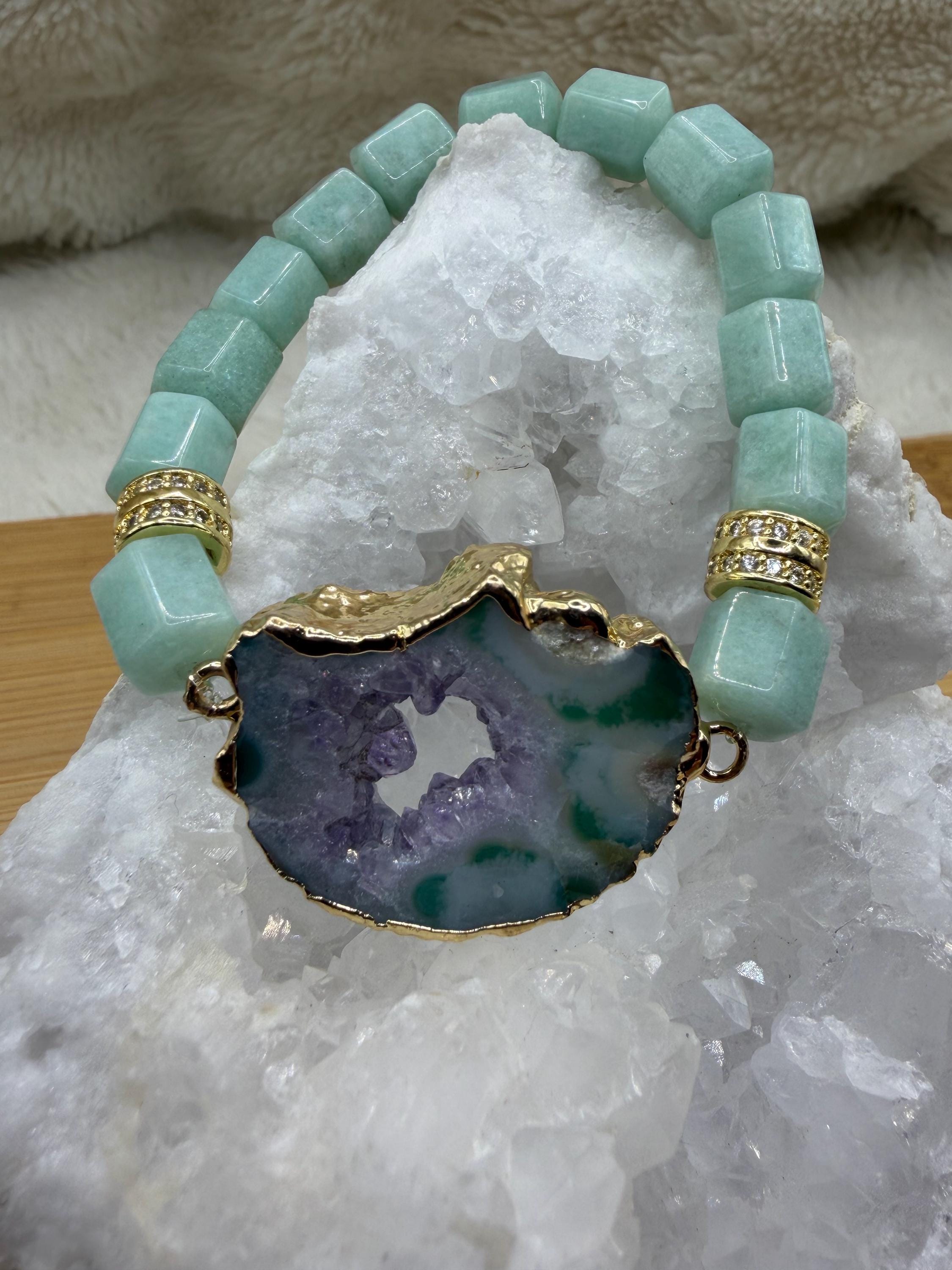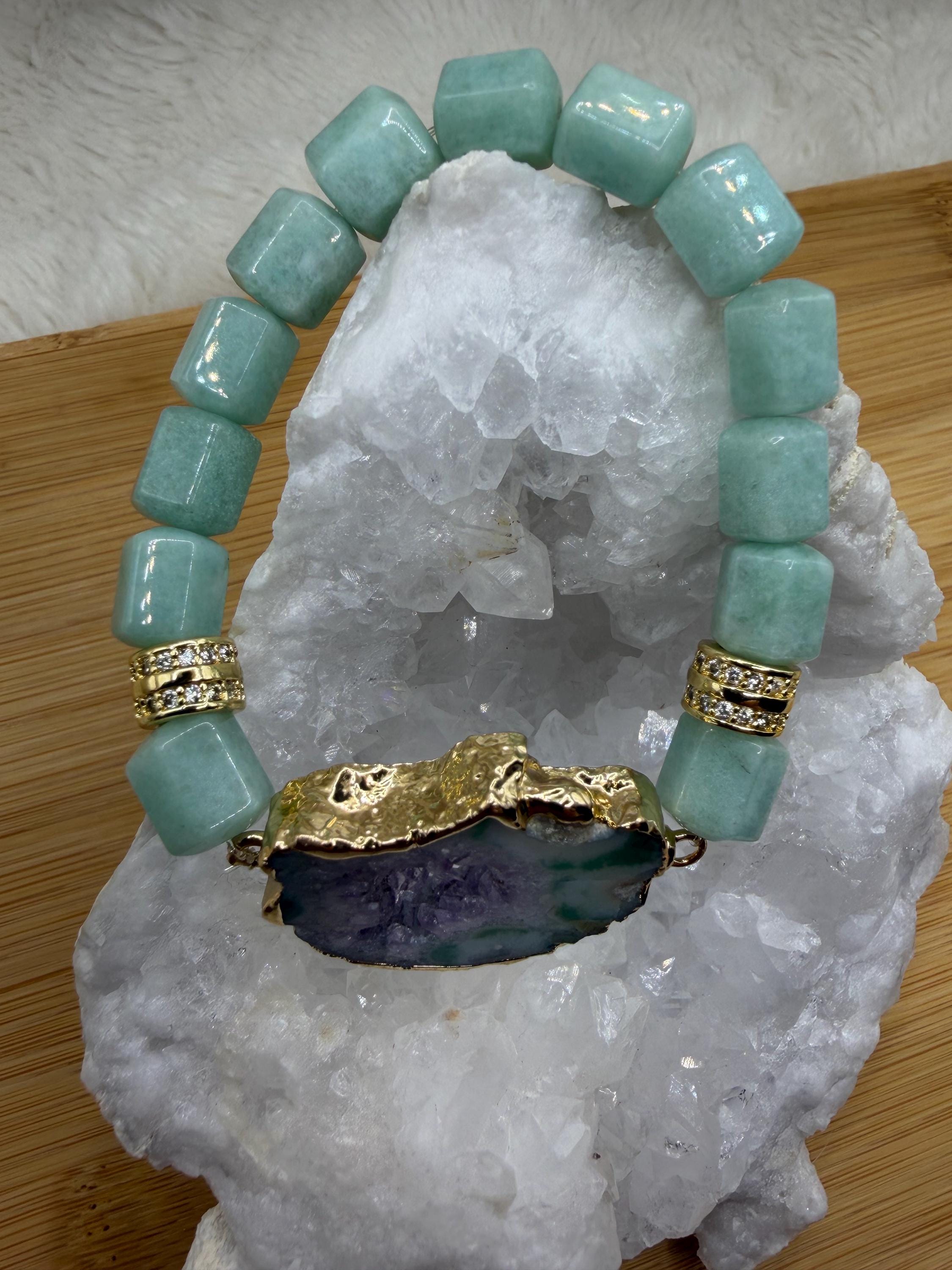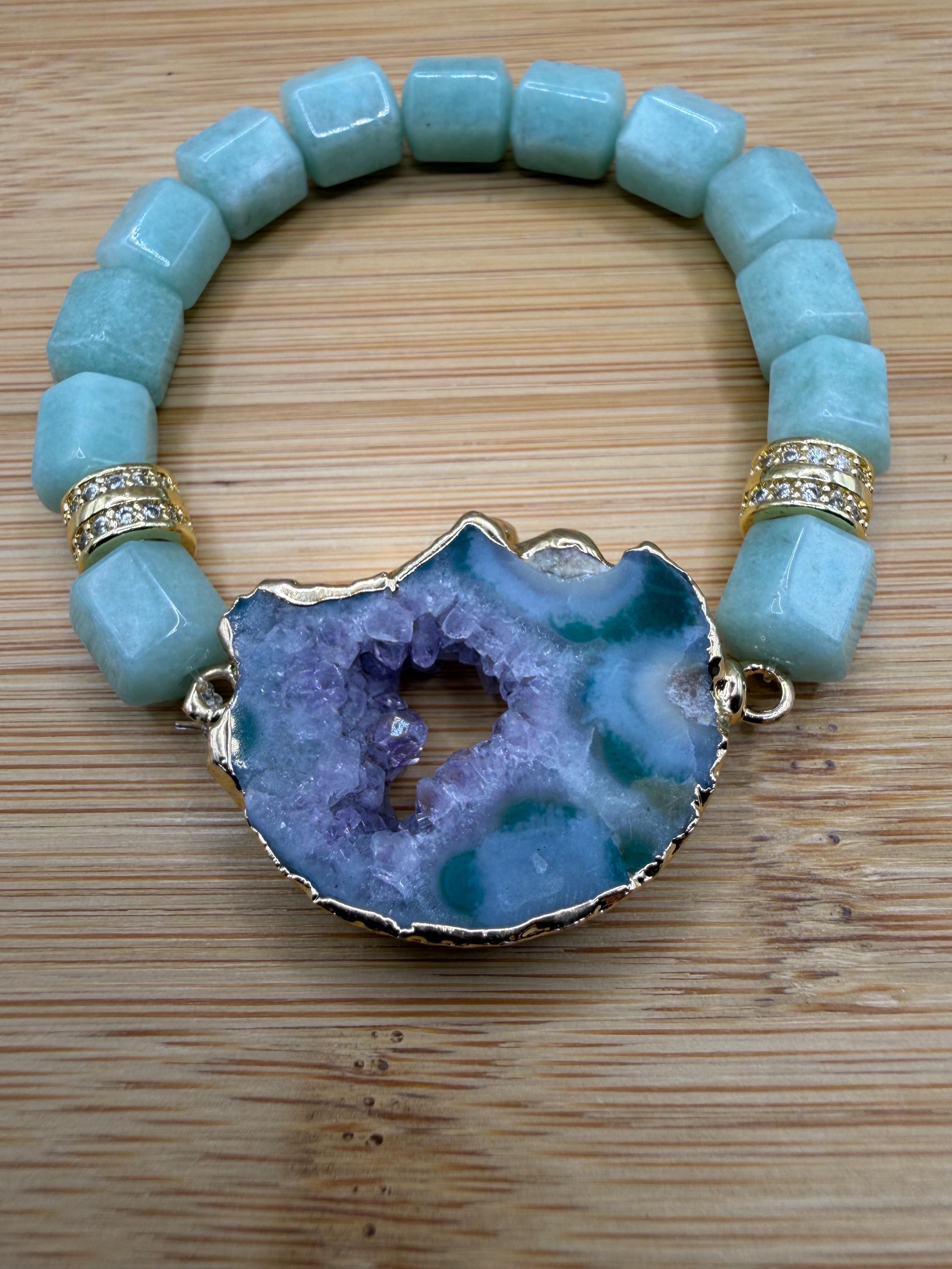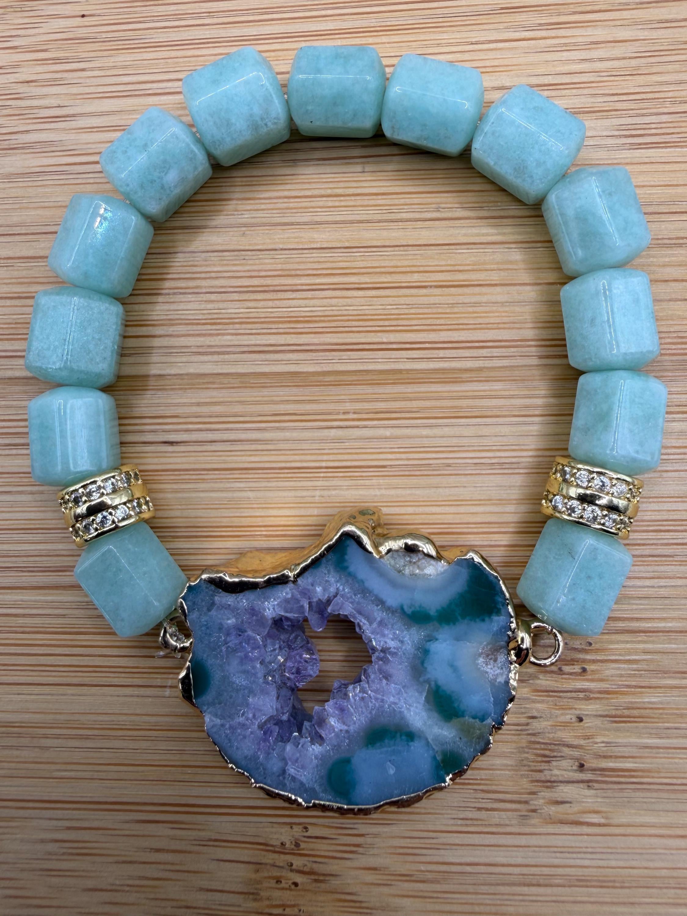 Energetically ENCHANTING bracelet designed with natural 8 x 10mm aqua bluegreen box cut cube beads complimenting gold plated agate slice focalpiece stretch stacking bracelet. Cubic Zirconia paved gold spacer beads.