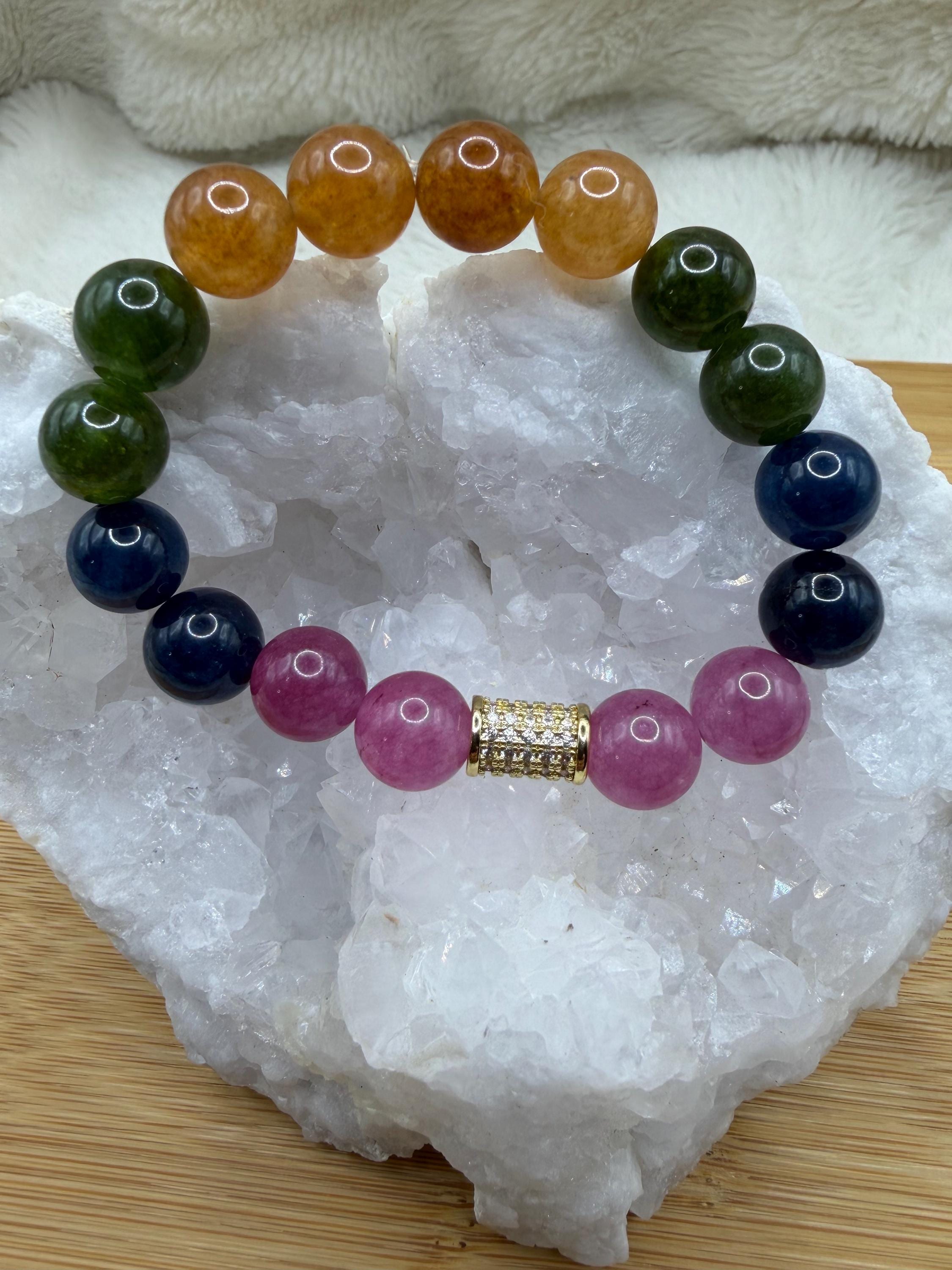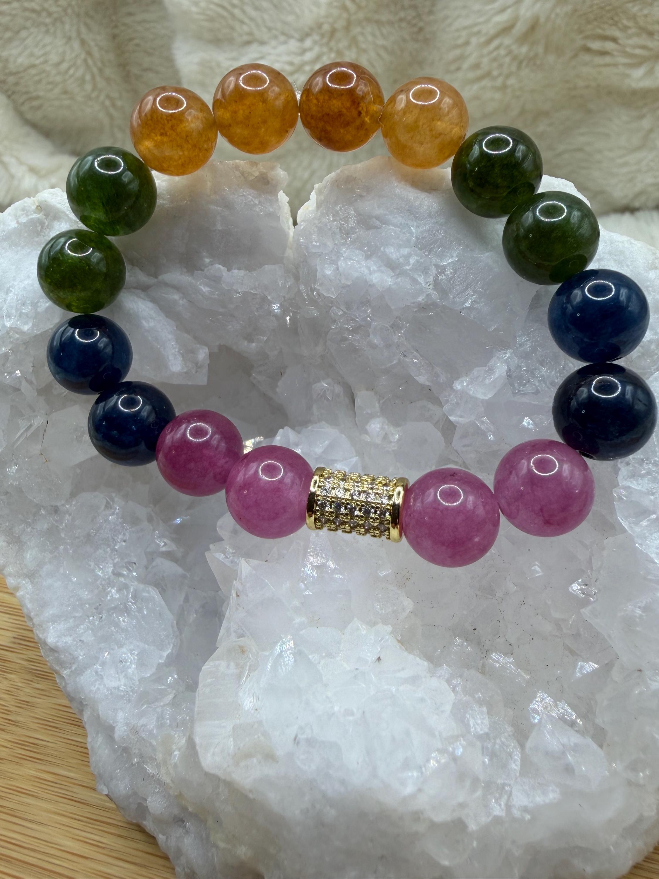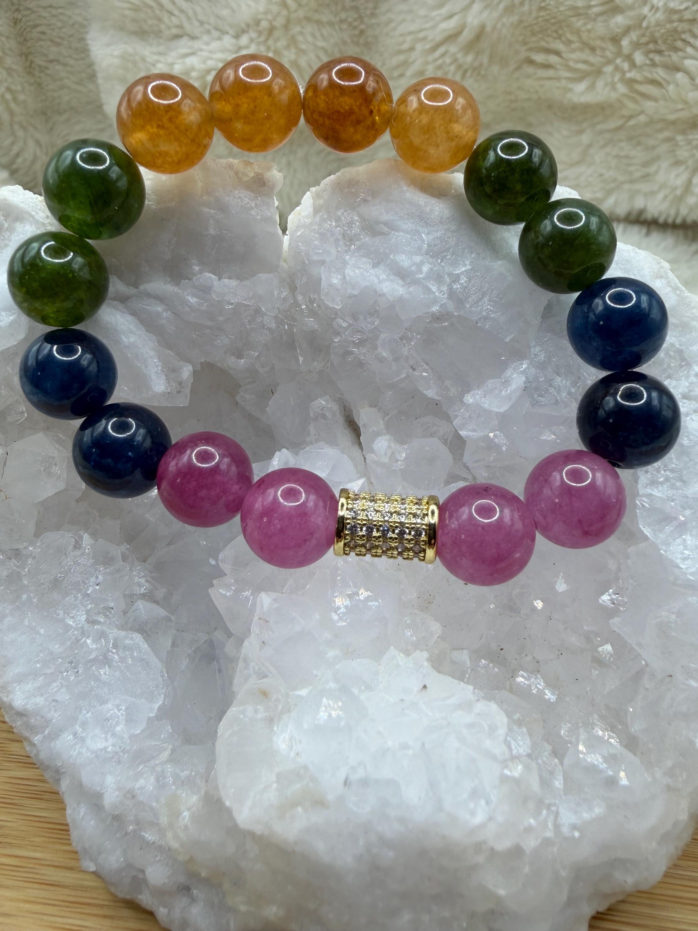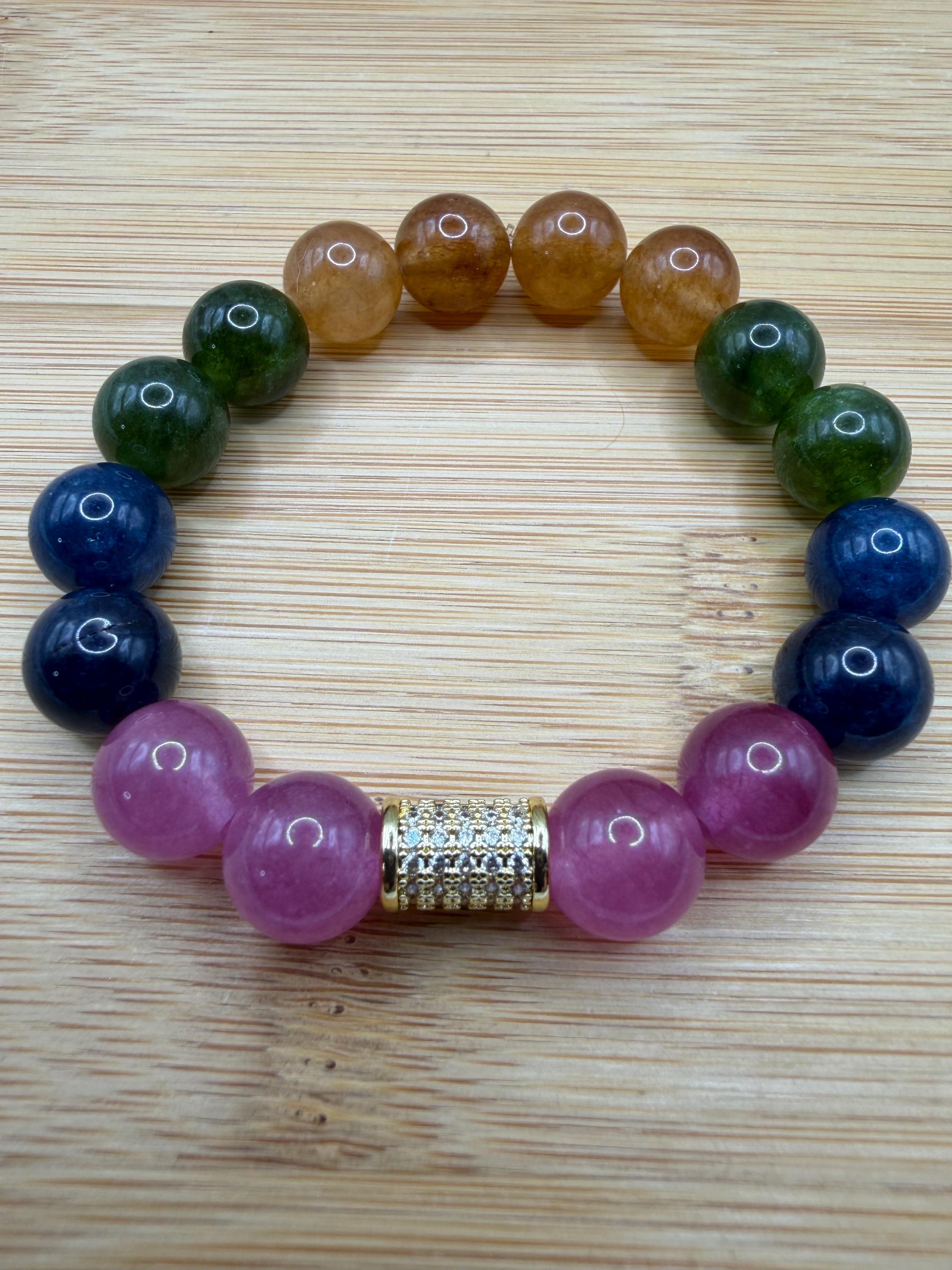 Energetically UPLIFTING bracelet designed with mutlicolored smooth round watermelon Quartz beads complimenting cz paved gold focal bead.