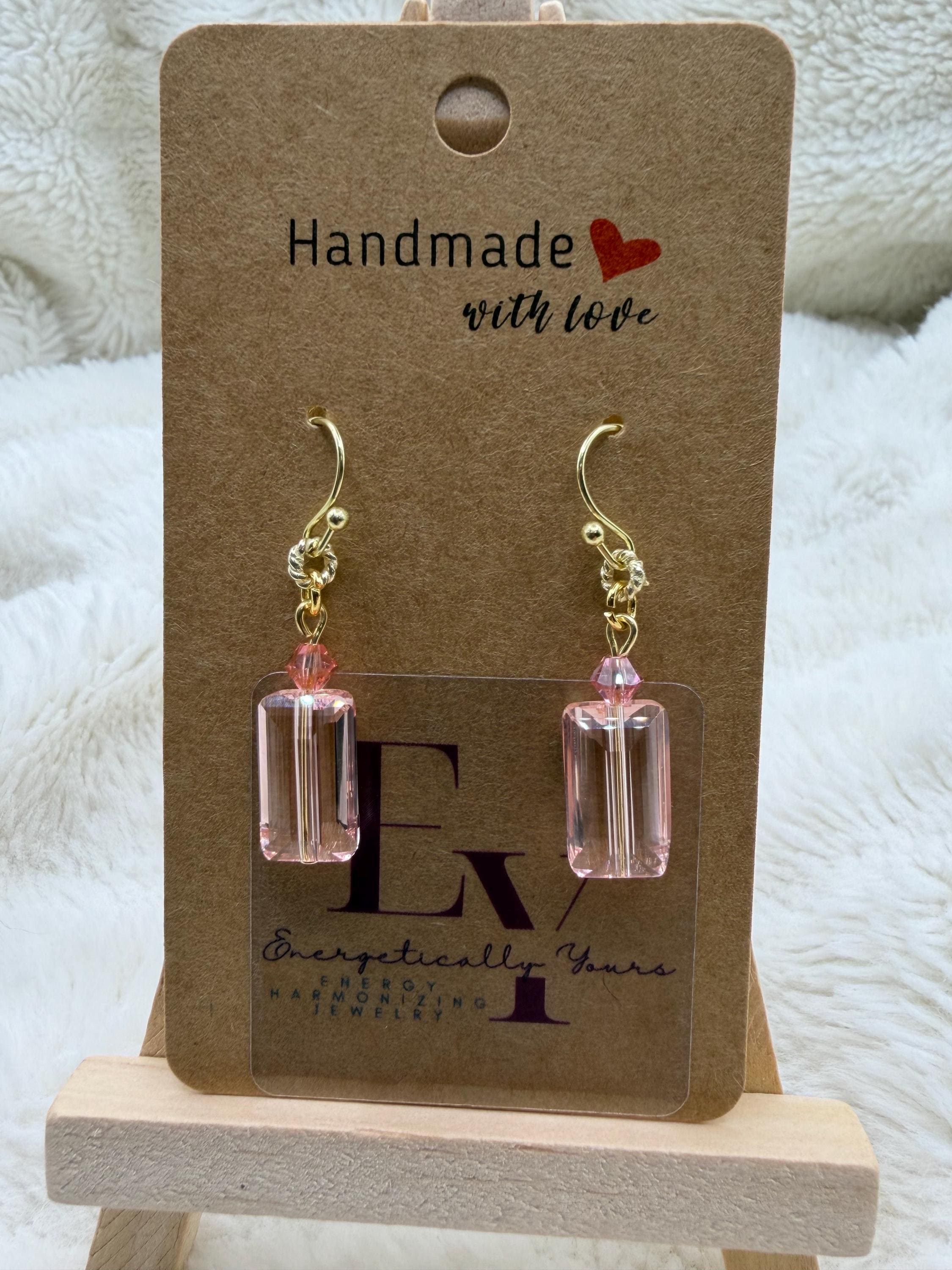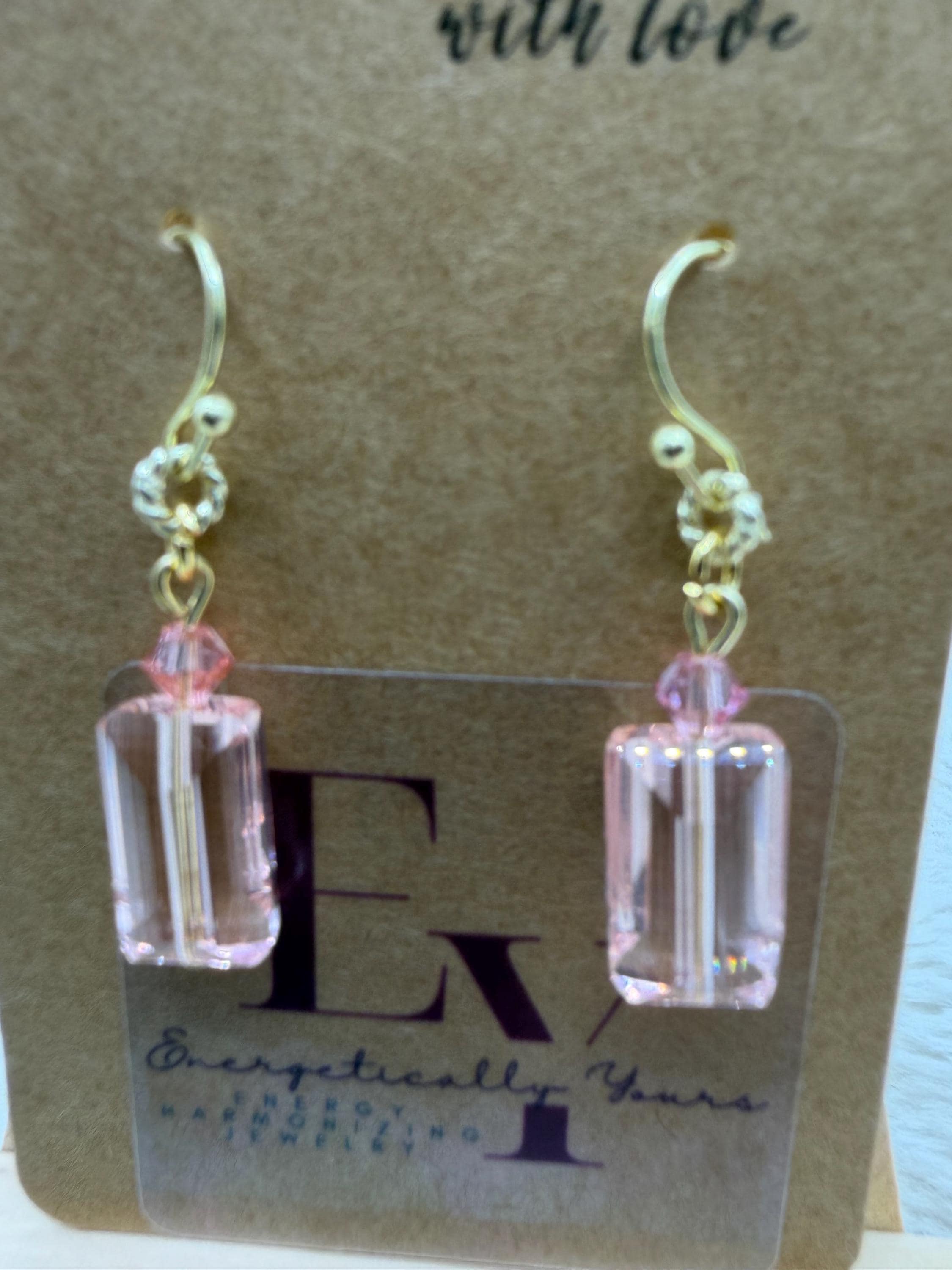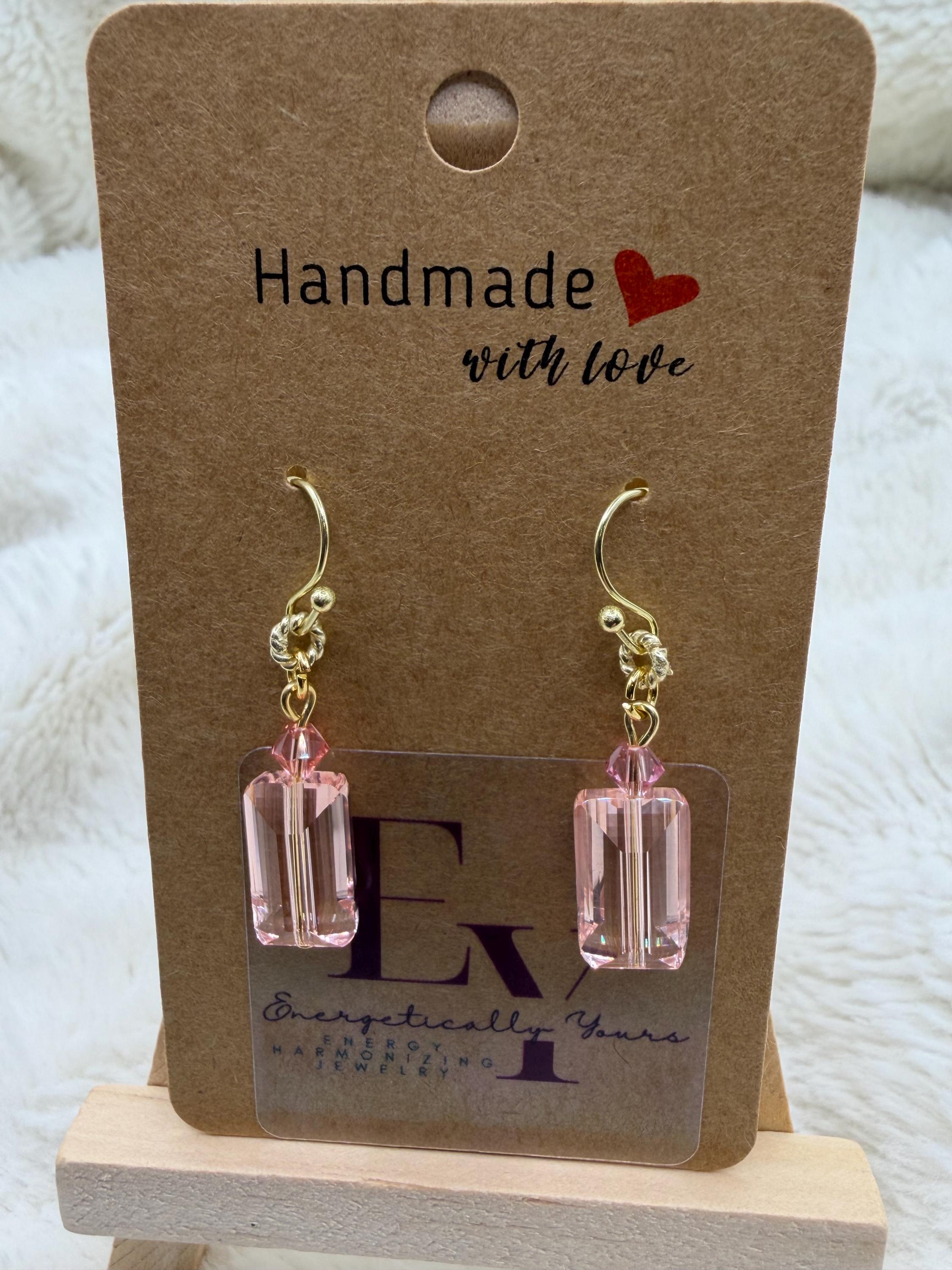 Energetically LOVING baby pink faceted Austrian crystal designed with 4 mm faceted Swarovski crystal beads, 14k gold plated copper rings on 18k gold plated hooks. Earrings for pierced ears.