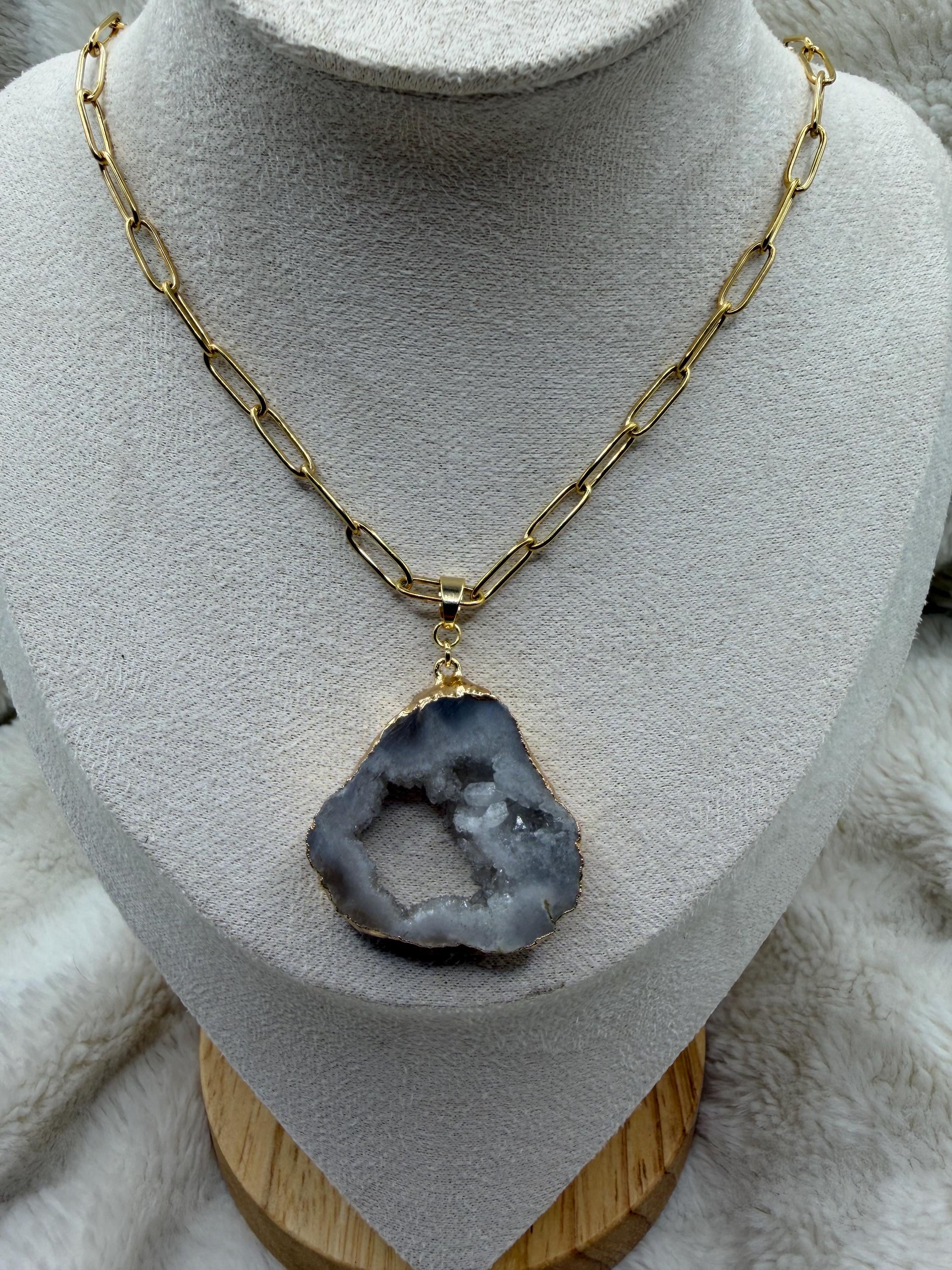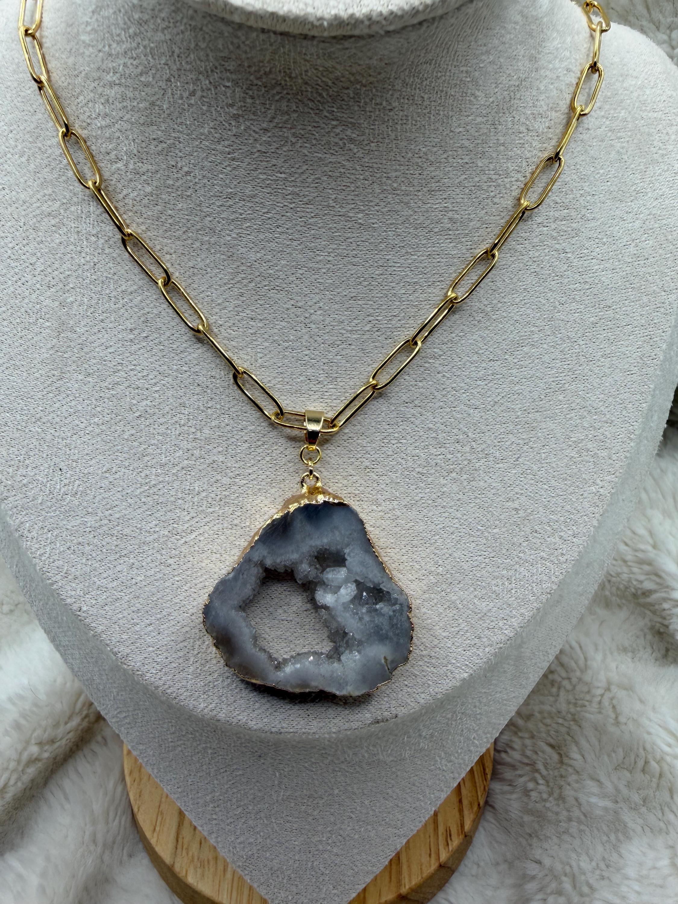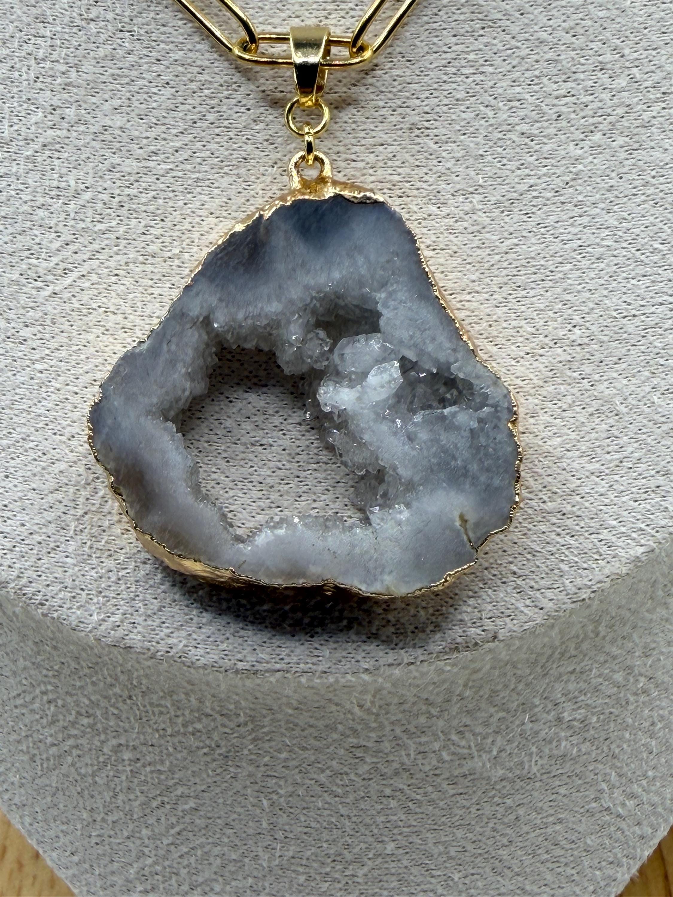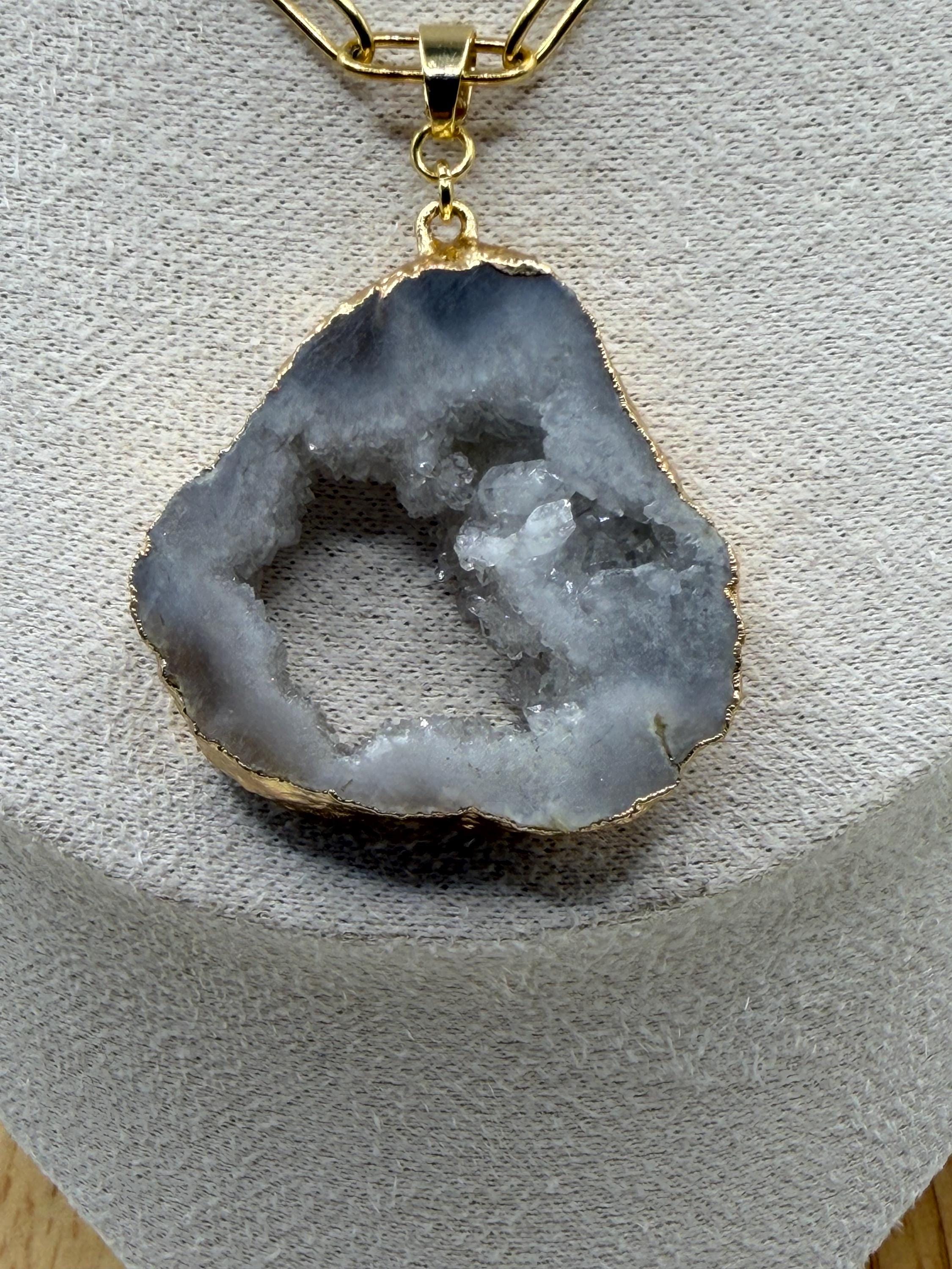 Energetically HEALING gold plated druzy quartz geode slab designed with natural complimenting 18k gold plated paperclip chain necklace.